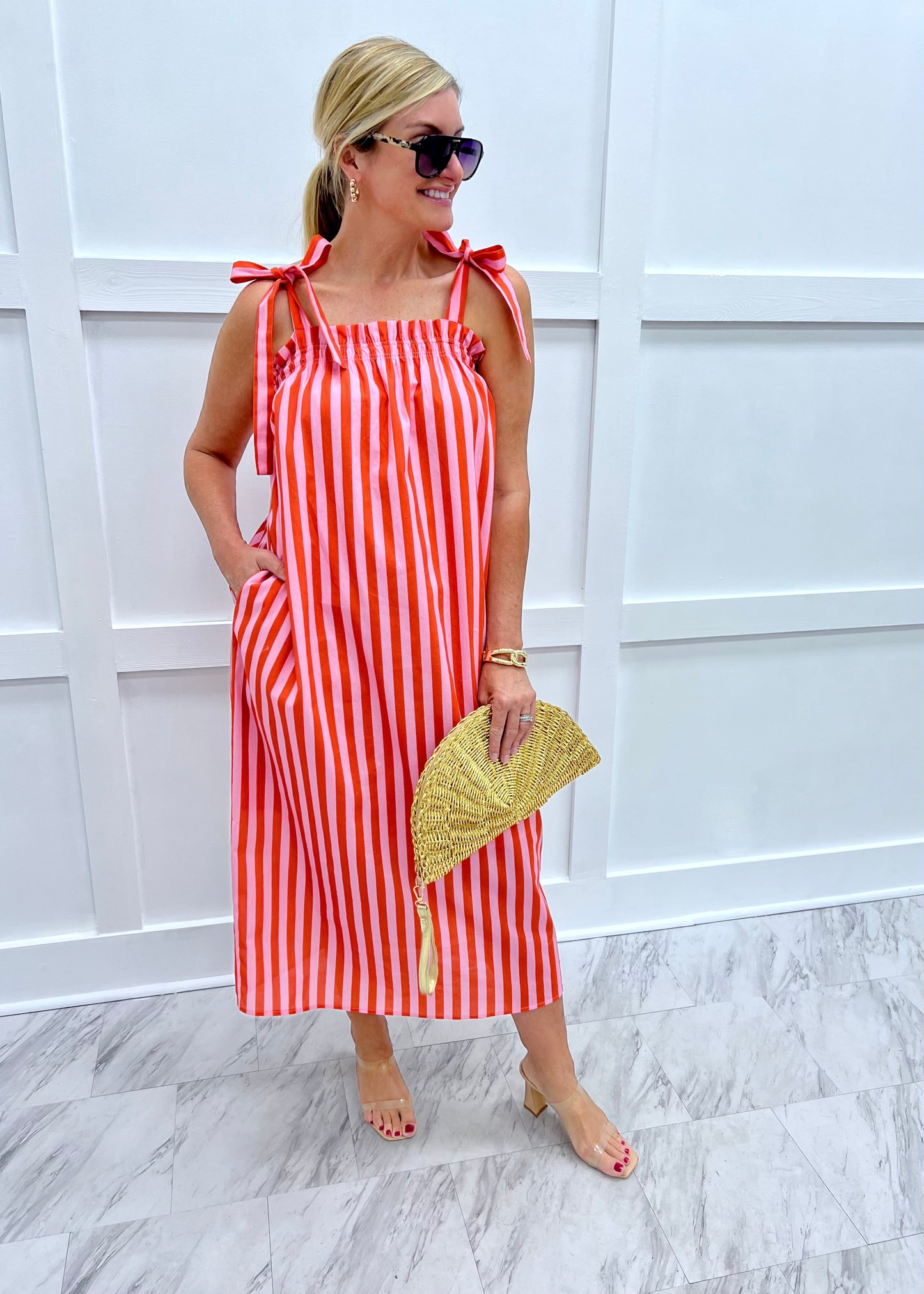 Estelle Stripe Midi Dress (Coral)