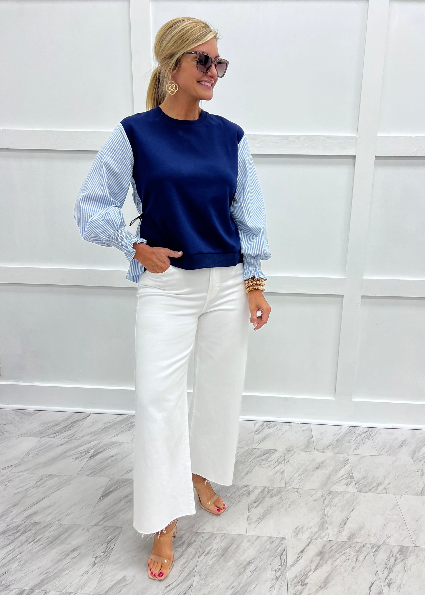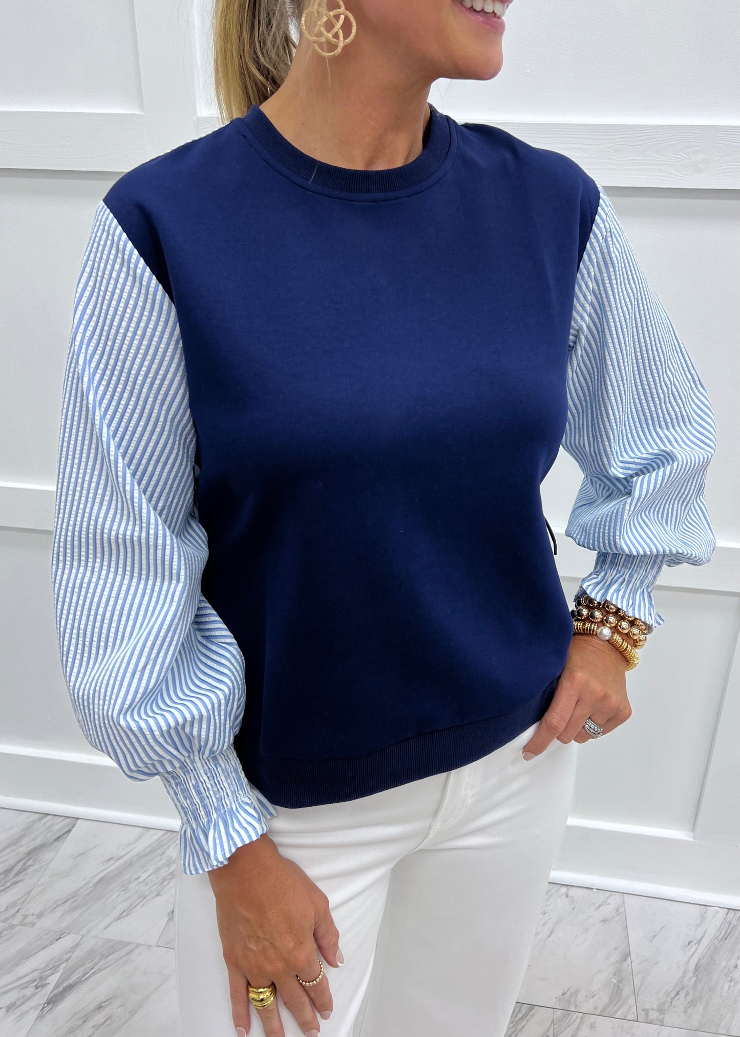 Storie Seersucker Sleeve Top (Navy)