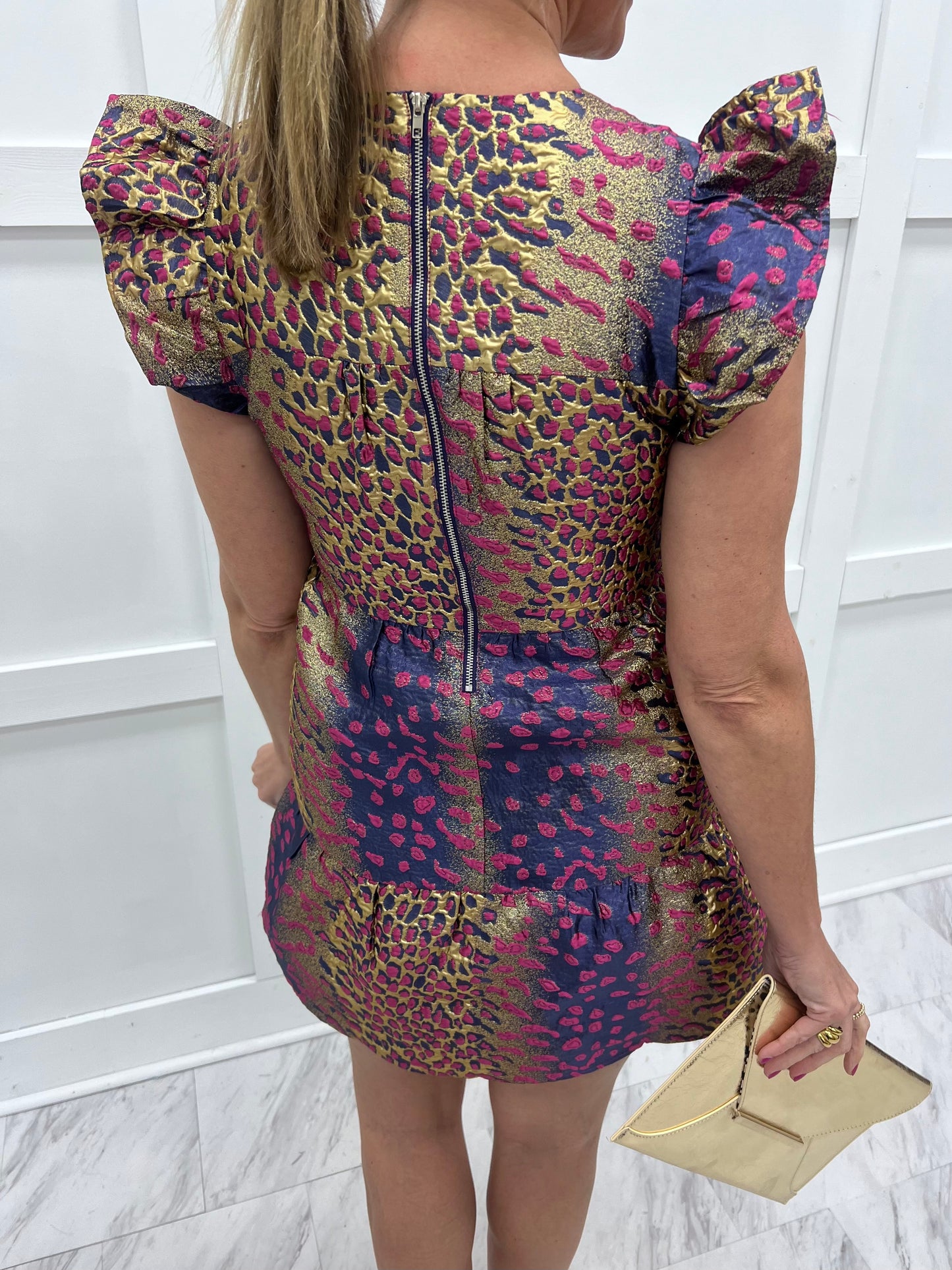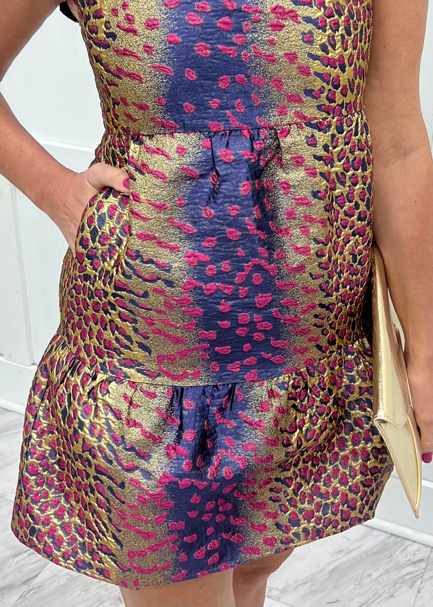Make a bold style statement in this stunning dress! The luxe jacquard fabric in shades of navy, magenta and gold will have you turning heads and the the round neckline, ruffle at the shoulder, side slit pockets, and tiered silhouette are the perfect finishing touches! This dress has a zipper at the back neckline and is lined. Be best dressed at your next event! Model is 5'8'' and wearing a size small.