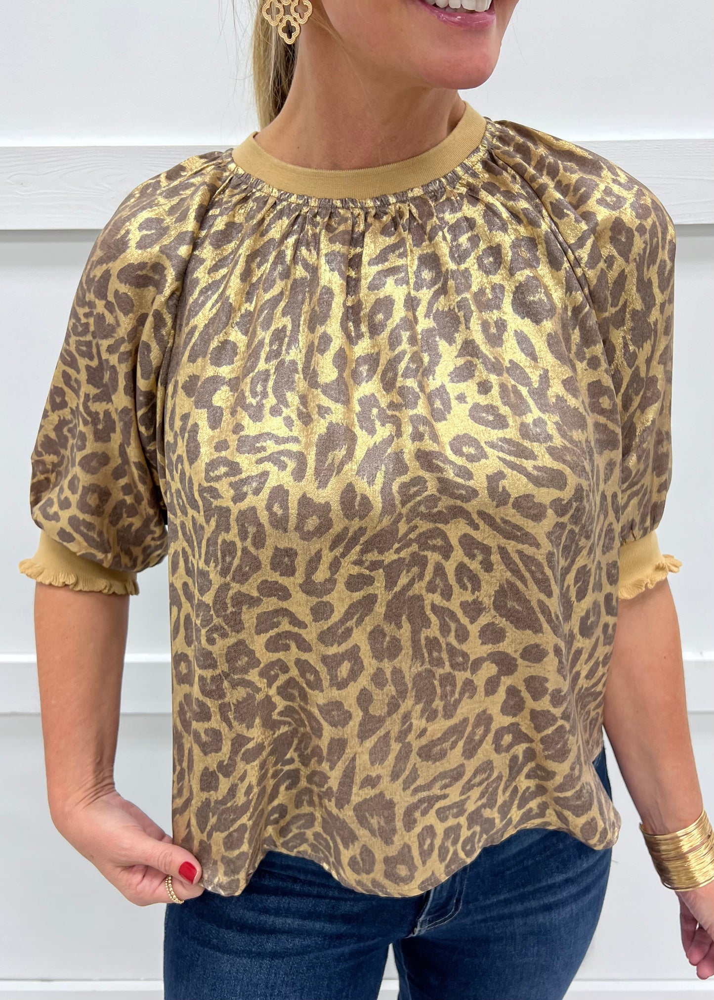 So much style in one darling little top! Satin like fabric in gold color with brown colored leopard spots shapes this top featuring a round neckline, elbow length sleeves, and ribbed knit detail at the neckline, waistline and on the sleeve. This chic style looks great paired with denim or with chic trousers. Look and feel you best in our Forever Metallic Leopard Top! Model is 5'8'' and wearing a size small.