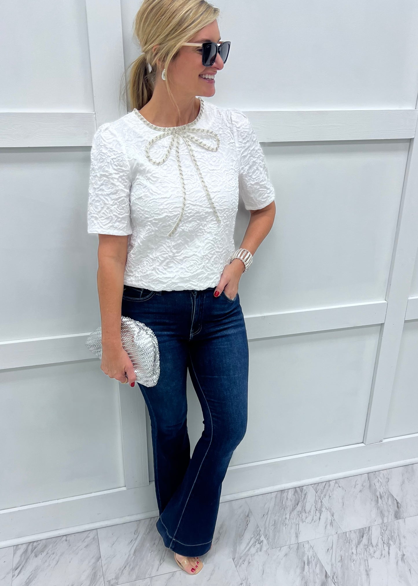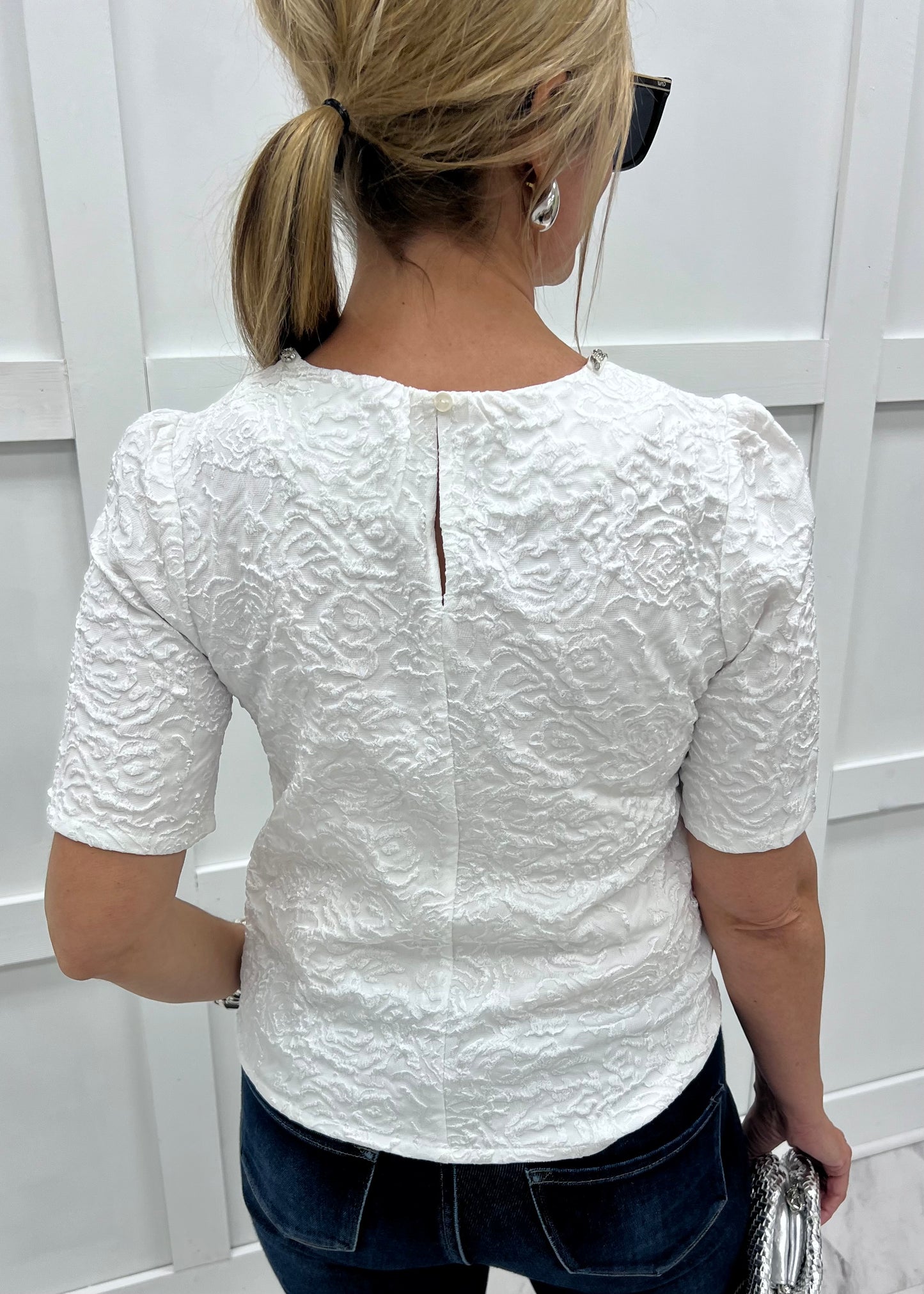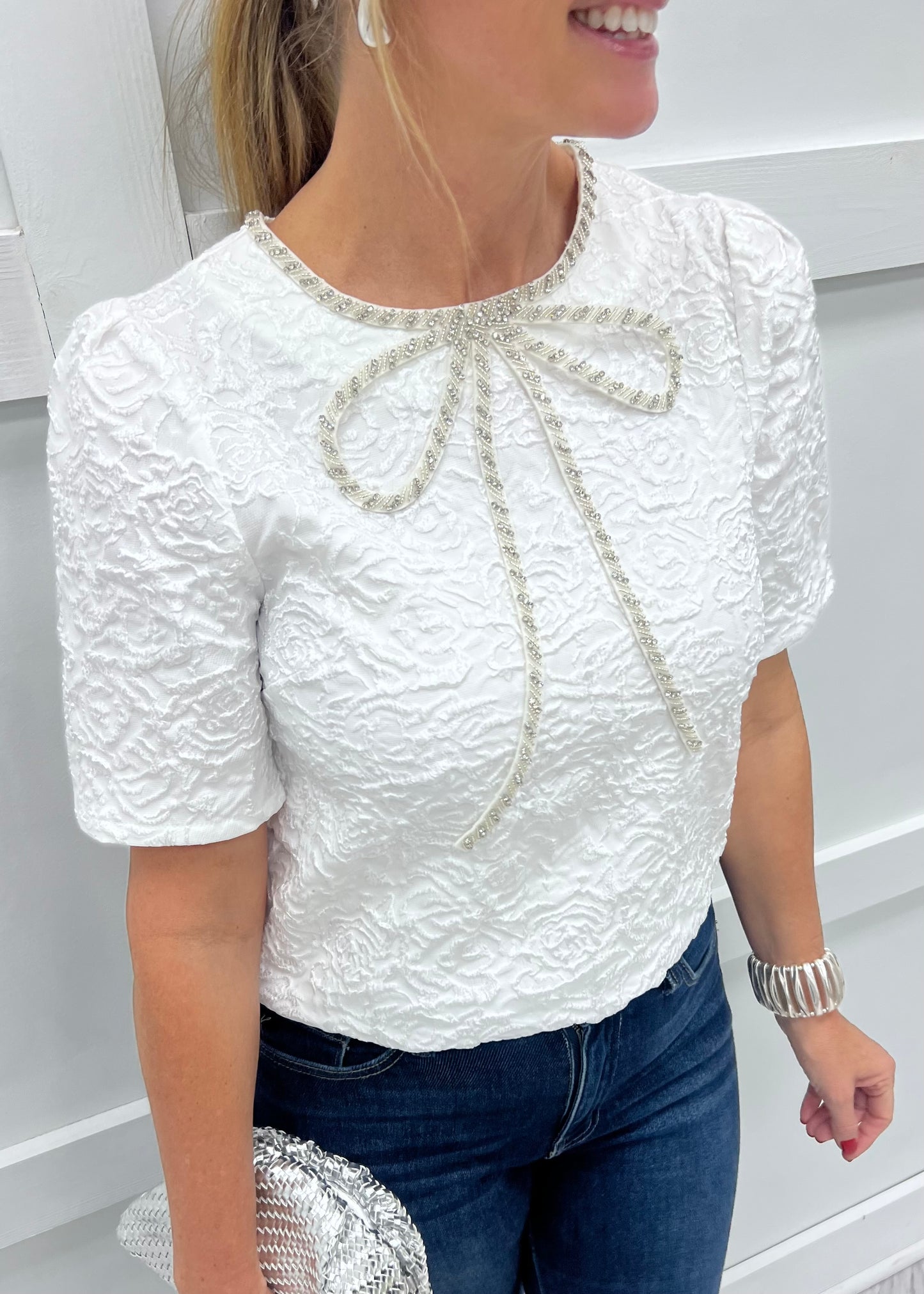 Chic, sophisticated & so very pretty... this little top will be the star of your outfit! White woven fabric with a textured floral design shapes this top featuring a round neckline, short sleeves and a bow detail at the neckline embellished with beading and rhinestones. The back has a small keyhole + button closure at the neckline. This style is stunning! We love it pair with denim and heels or a paired with a sleek skirt for a fancy night out! Model is 5'8" and wearing a size small.