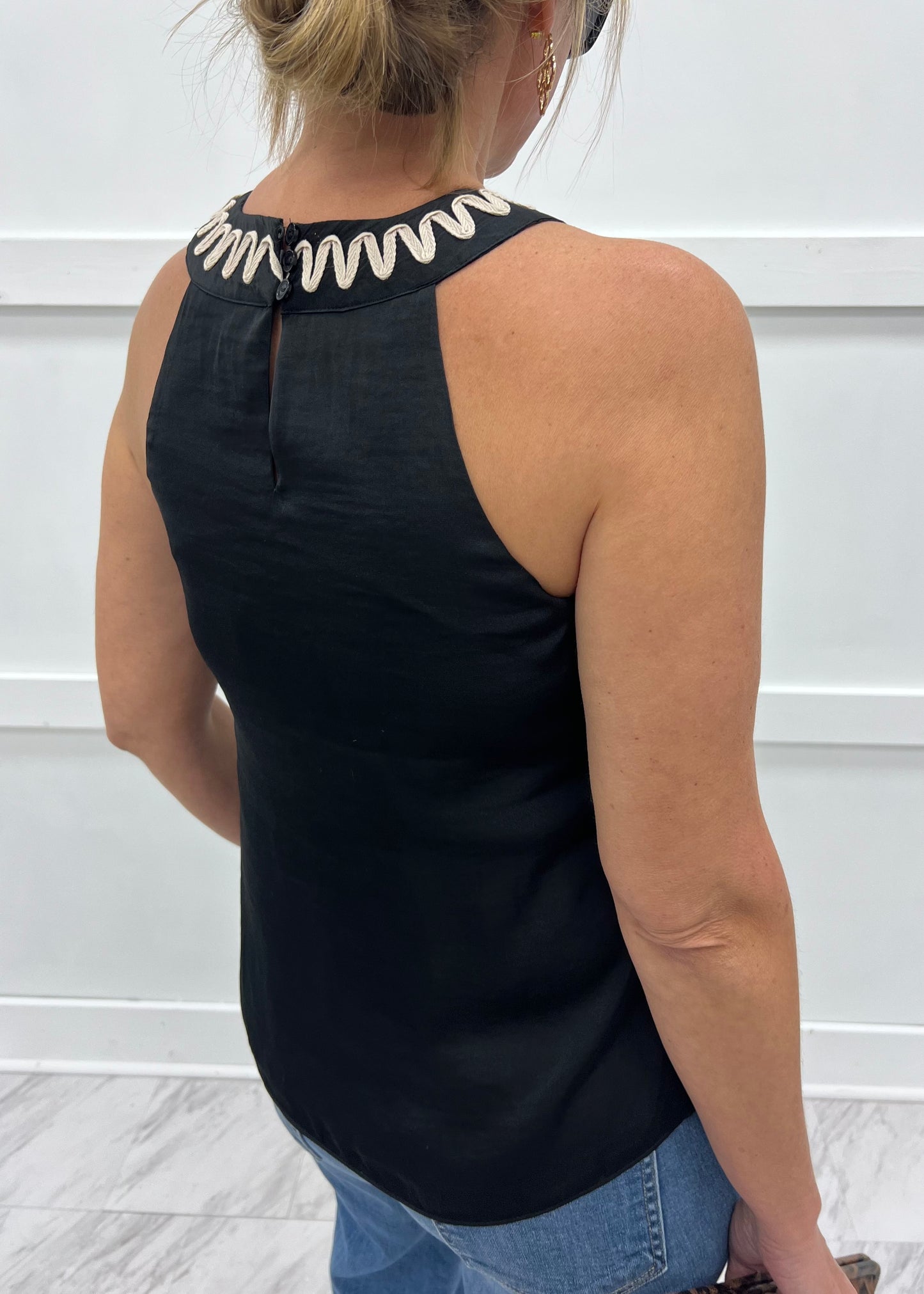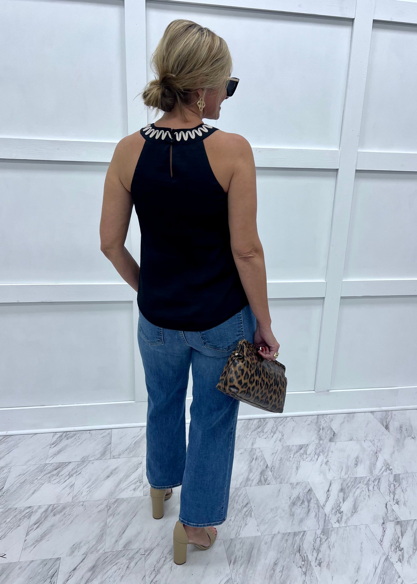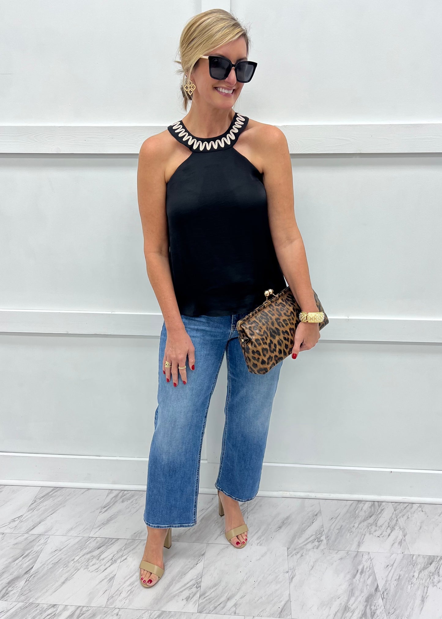 You will love the look of our Holiday Halter Top, the prettiest silhouette and so easy to accessorize! Black colored woven fabric with silky feel shapes this halter style top with beige detail at the high neckline and a three button closure at the back neckline. This one looks great with denim or tucked into a skirt... just add your favorite shoes and statement earrings! Model is 5'8'' and wearing a size small.