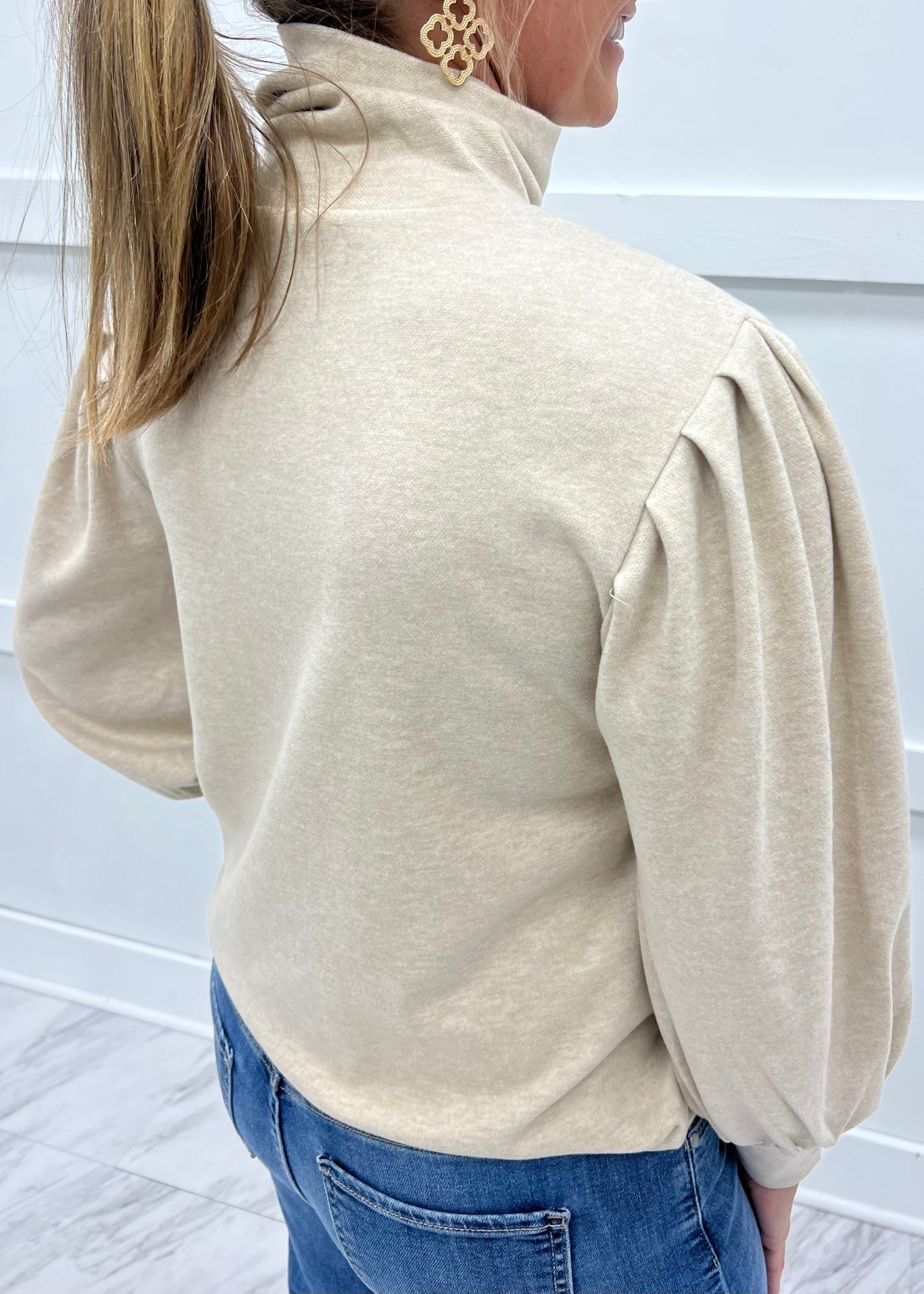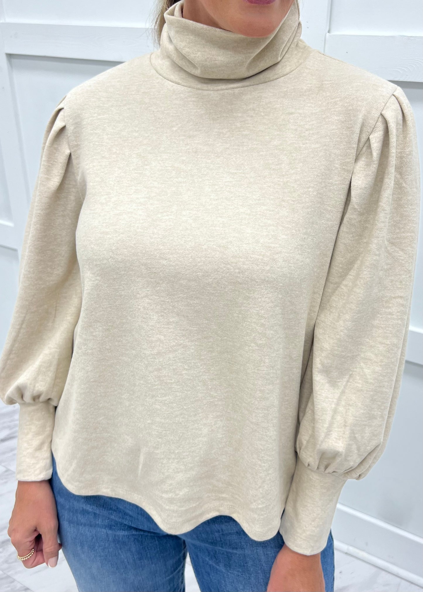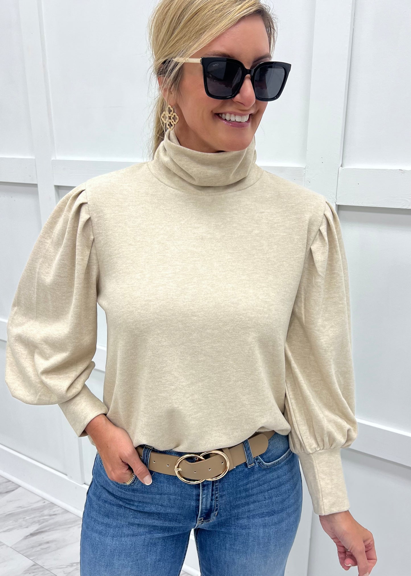 Stay cozy while looking extra cute in our Kaia Top! Super soft beige colored fabric shapes this top featuring a turtleneck, long sleeves with pleat detailing and banded wrists and a relaxed fit with the hemline slightly longer in the back. This one looks great with any wash of denim or leggings. You will wear this one all of the time! Model is 5'8'' and wearing a size small.
