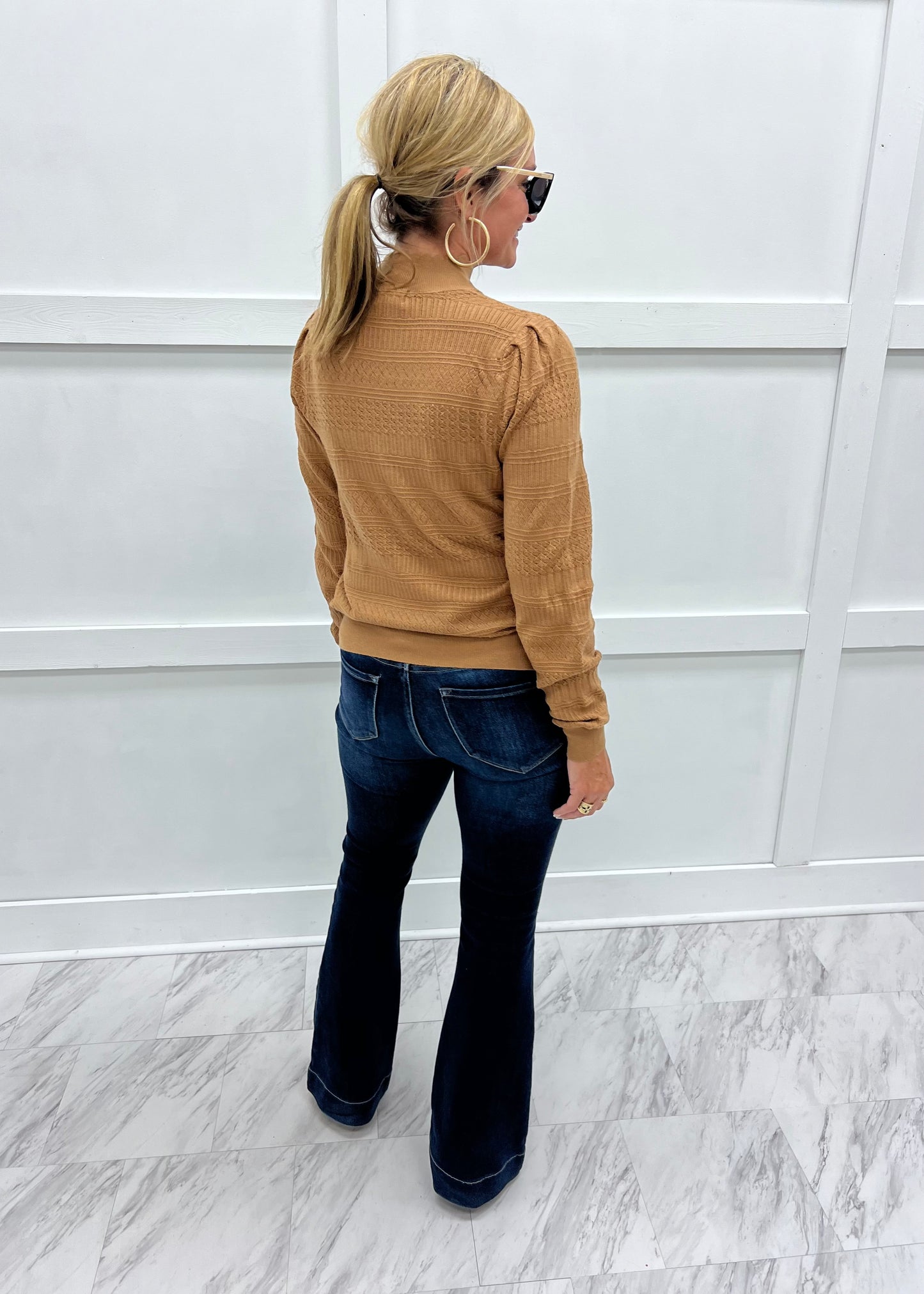 Your go to neutral top gets an instant upgrade with the addition of our Kennedy Mock Neck Top! Beige colored pointelle knit fabric that is soft and stretchy shapes this long sleeve style with a scalloped mock neckline and ribbed detailing at the neckline, wrists and waistline. This updated basic is the perfect option for tucking into skirts or pants... we can't wait to see how you will style this one! Model is 5'8'' and wearing a size small.