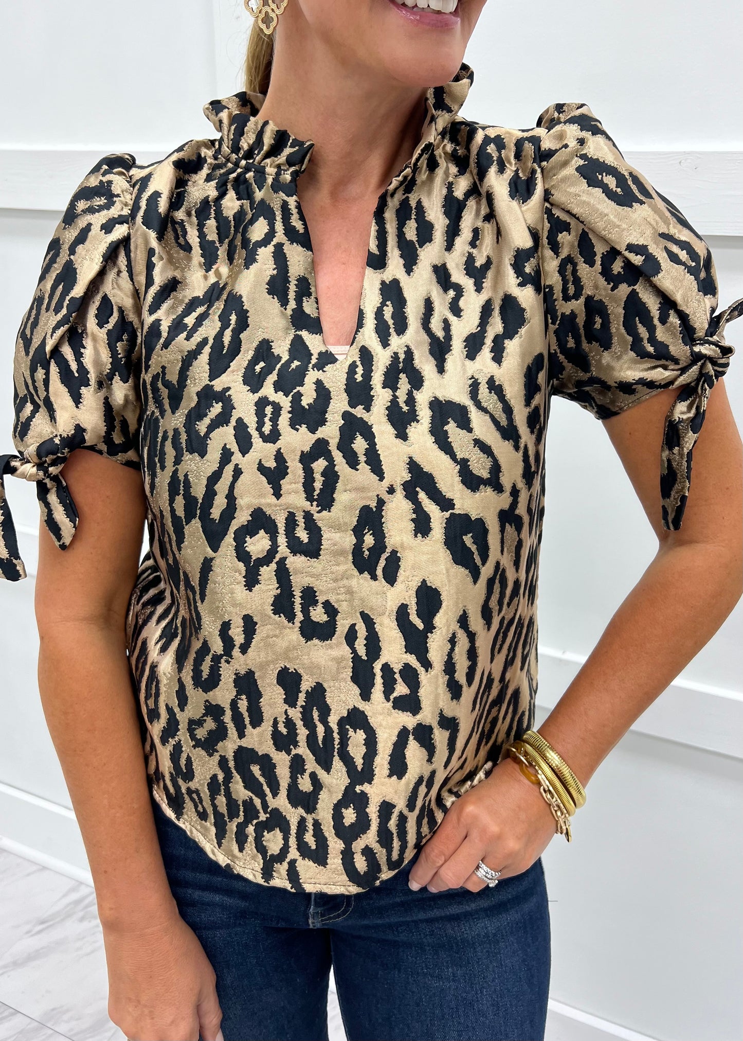 Get ready for the compliments... the Lawrence Leopard Top is just what you need to take your look to the next level! Beige and black leopard print fabric with a metallic finish shapes this style featuring a v.neckline, ruffle detailing around the collar, short sleeves with self tie detail and a relaxed fit. This easy to wear style looks great with everything from denim to trousers and a blazer, you will have so much fun styling this one! Model is 5'8'' and wearing a size small.