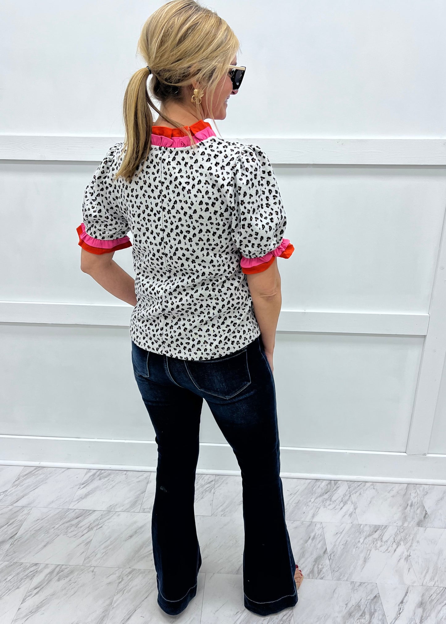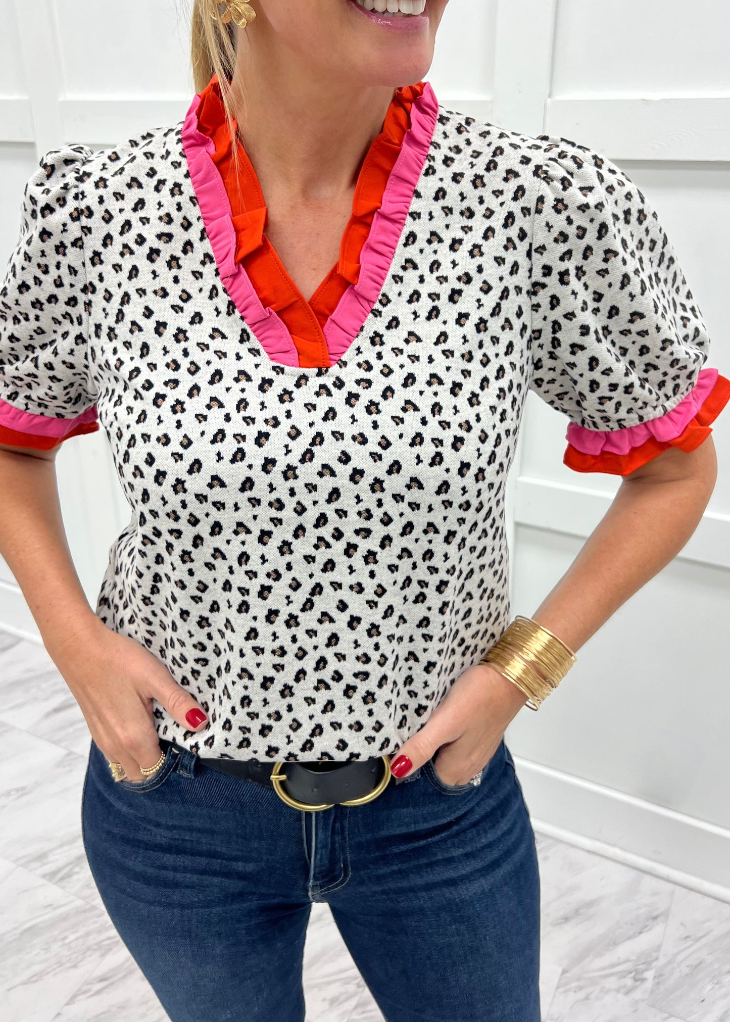 Get weekend ready with this darling little top! Soft and stretchy knit fabric in ivory with black and brown leopard spots shapes this top featuring a v.neckline, short puff sleeves and pink and orange ruffle detailing at the neckline and on the sleeve. This lovely top is sure to bring a smile to your face! We love it styled for brunch with the girls or a casual date night! Model is 5'8'' and wearing a size small.