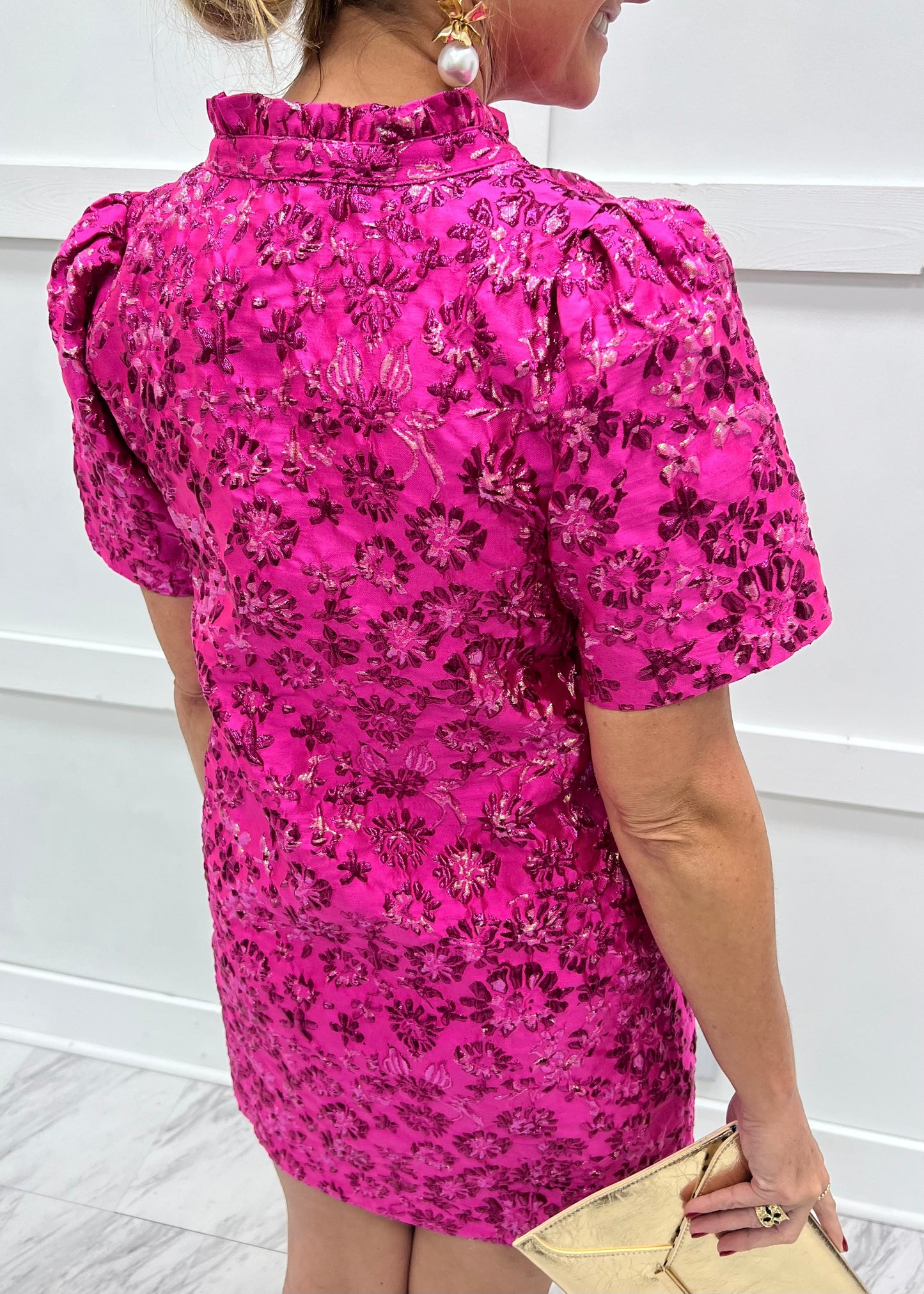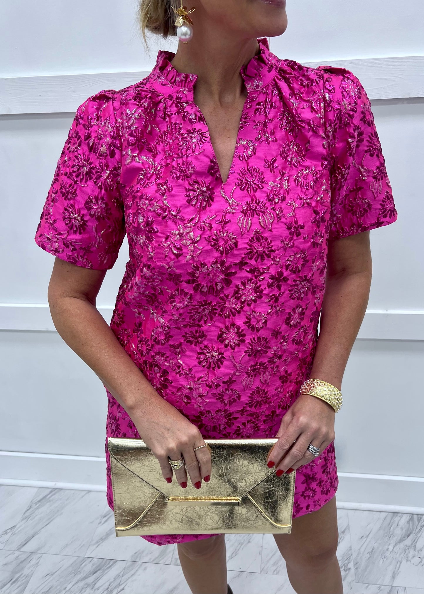 Shine, sparkle & dazzle as you turn all of the heads in this stunning little dress! Shimmering, pink colored fabric with a textured metallic floral design shapes this dress featuring a v.neckline with ruffled detailing along the collar and short sleeves, invisible side pockets and a straight fit. This dress is fully lined. Just add heels and statement earrings for the perfect holiday party, date night or girls night out look! Model is 5'8'' and wearing a size small.
