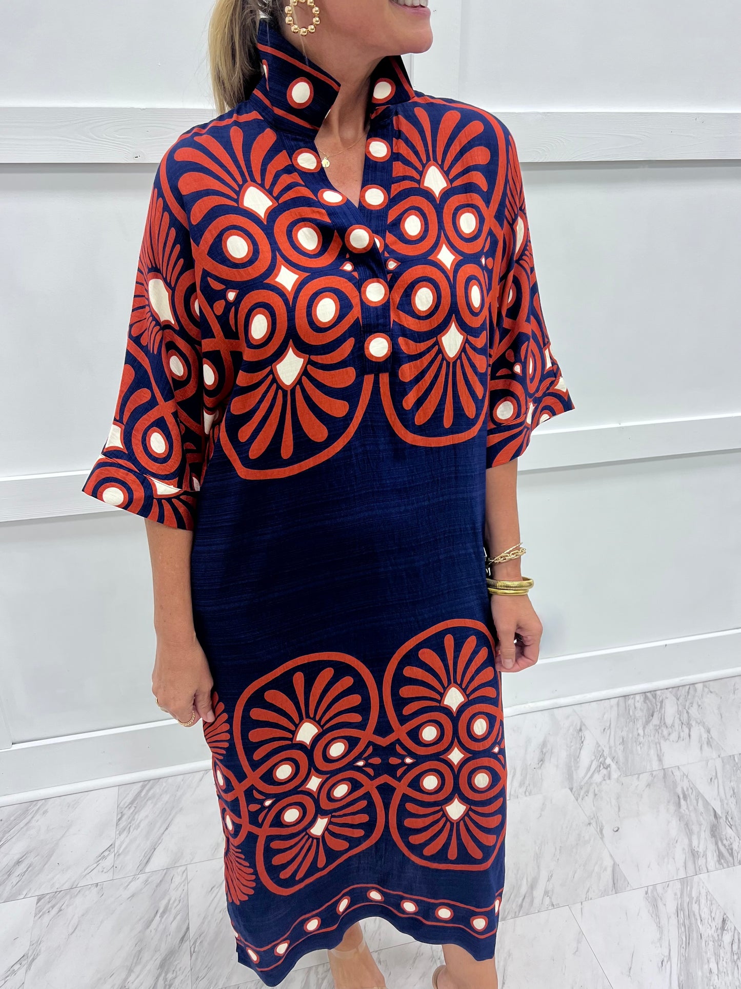 Ohhh la la, we are swooning over this chic dress! A navy blue, rust and ivory printed fabric shapes this dress featuring a collar v.neckline with snap closure, cropped dolman sleeves, a midi length with slits on the side and side slit pockets. This pullover style (no buttons or zippers) has an easy, loose fit. Style this one with heels for a preppy feel or boots and a chic hat for a more boho vibe. Bring on the compliments! Model is 5'8'' and wearing a size small.