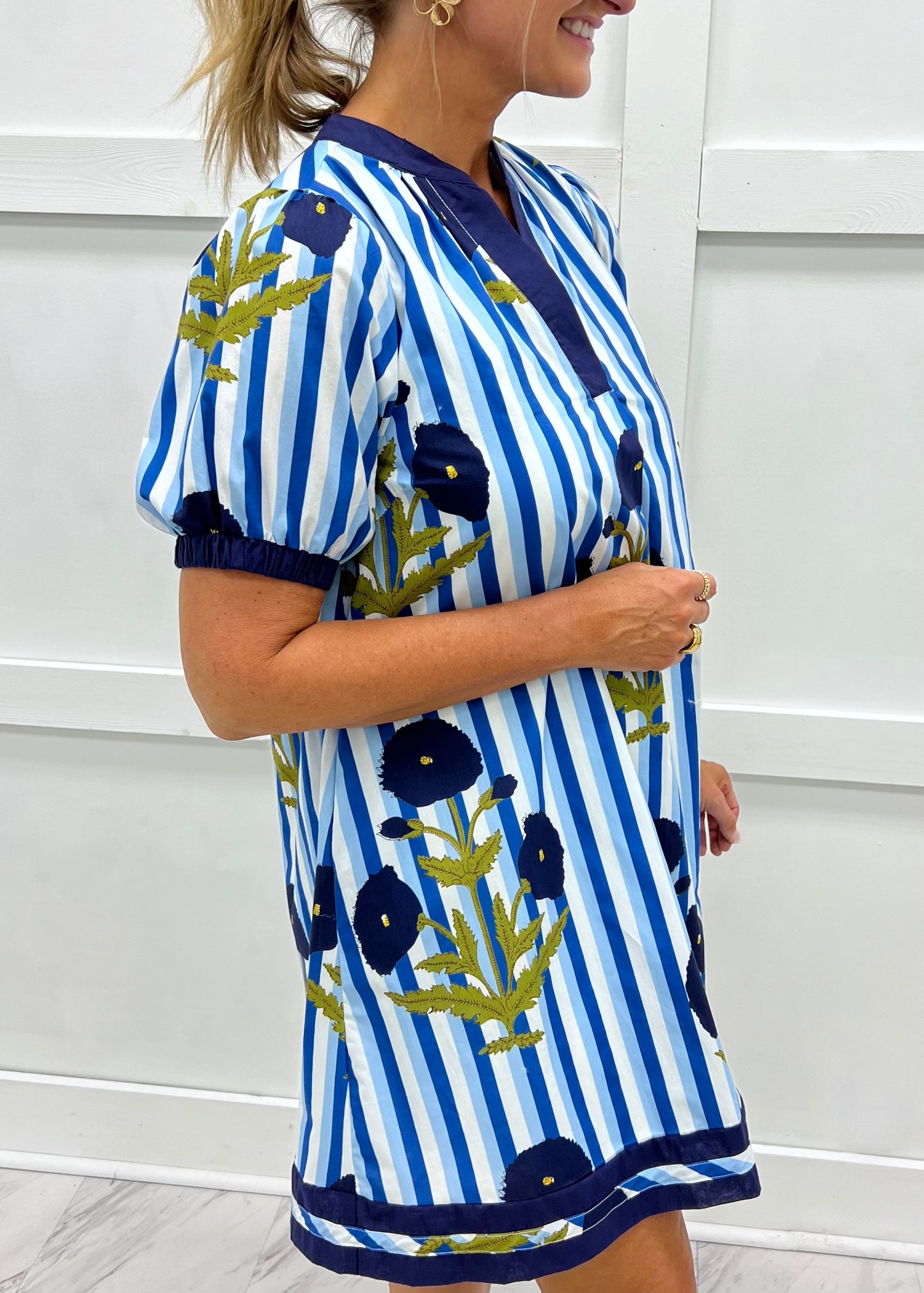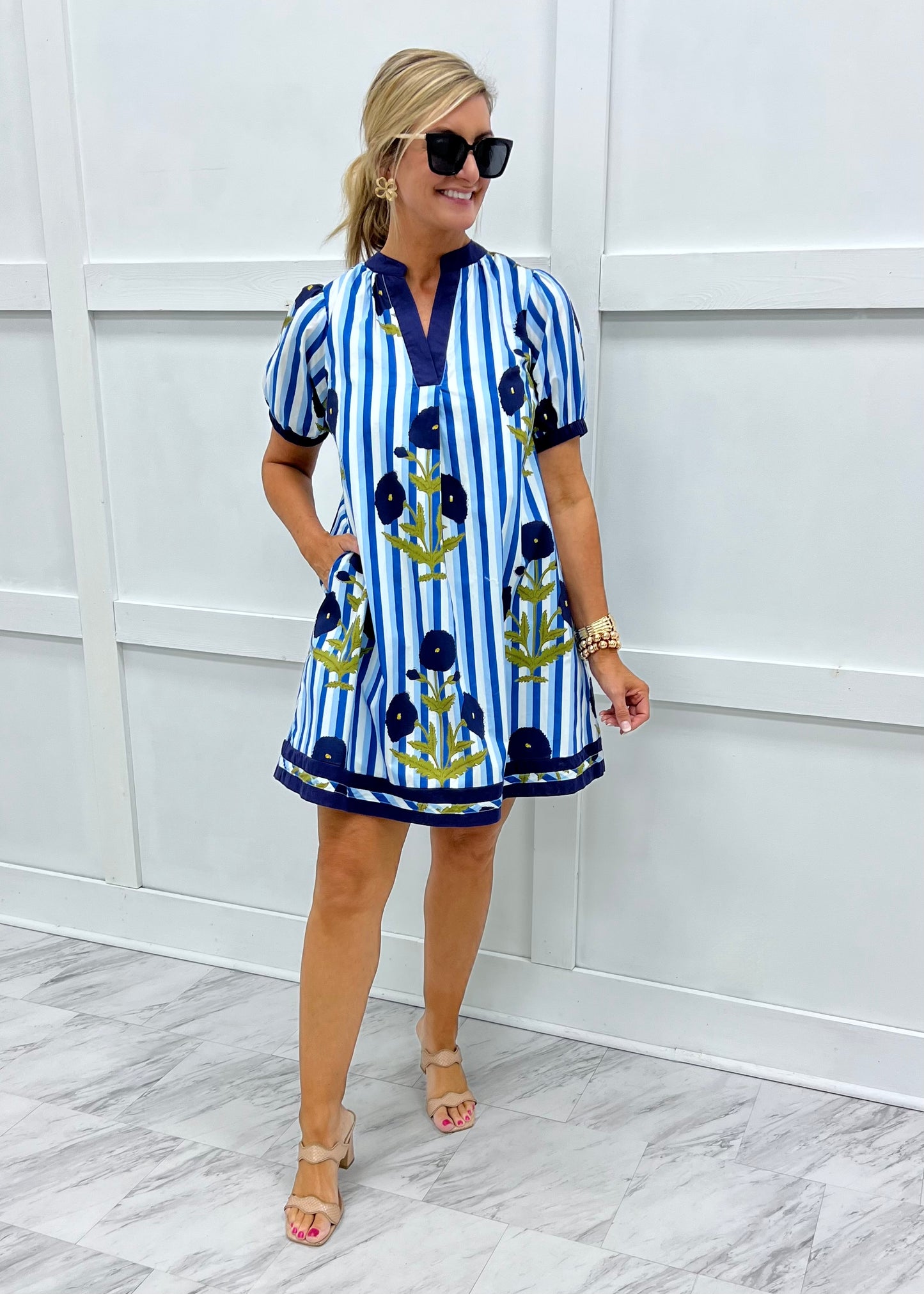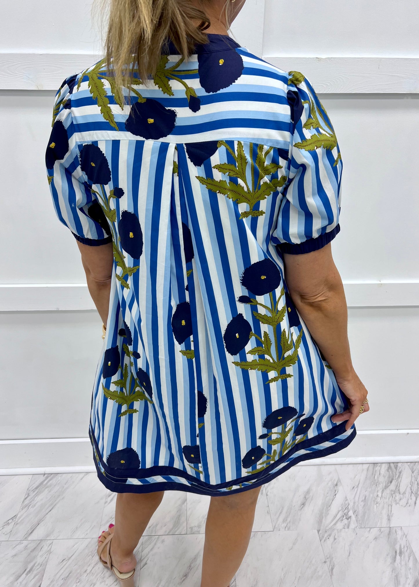 Stripes + flowers, the perfect combination! Vertical stripes in shades of blue and white with a navy blue and green floral print shapes this dress featuring a v.neckline, short puff sleeves with elastic at the edge, side slit pockets, and solid navy detail at the neckline, arm, and waistline. This dress has a loose fit, is fully lined and has an inverted pleat detail on the back. We love this pretty + playful style!