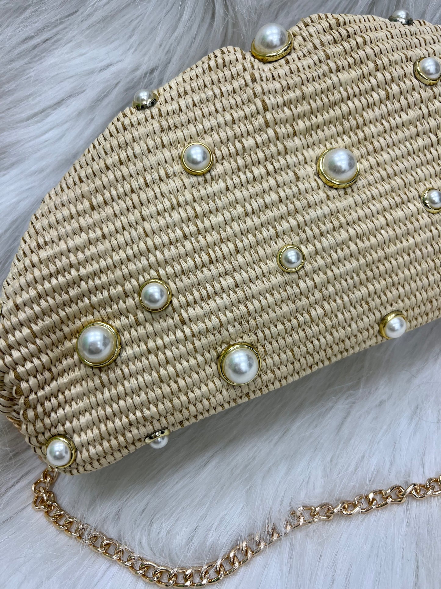 Looking for a statement clutch that looks good with just about everything? Meet our Pearls In Paradise Clutch! This snap frame style is made of ivory colored sturdy straw material and embellished with pearls encased in gold. A removable gold chain allows this clutch style to also be worn as a cross body or shoulder bag. Complement all of your warm weather looks with this darling bag!