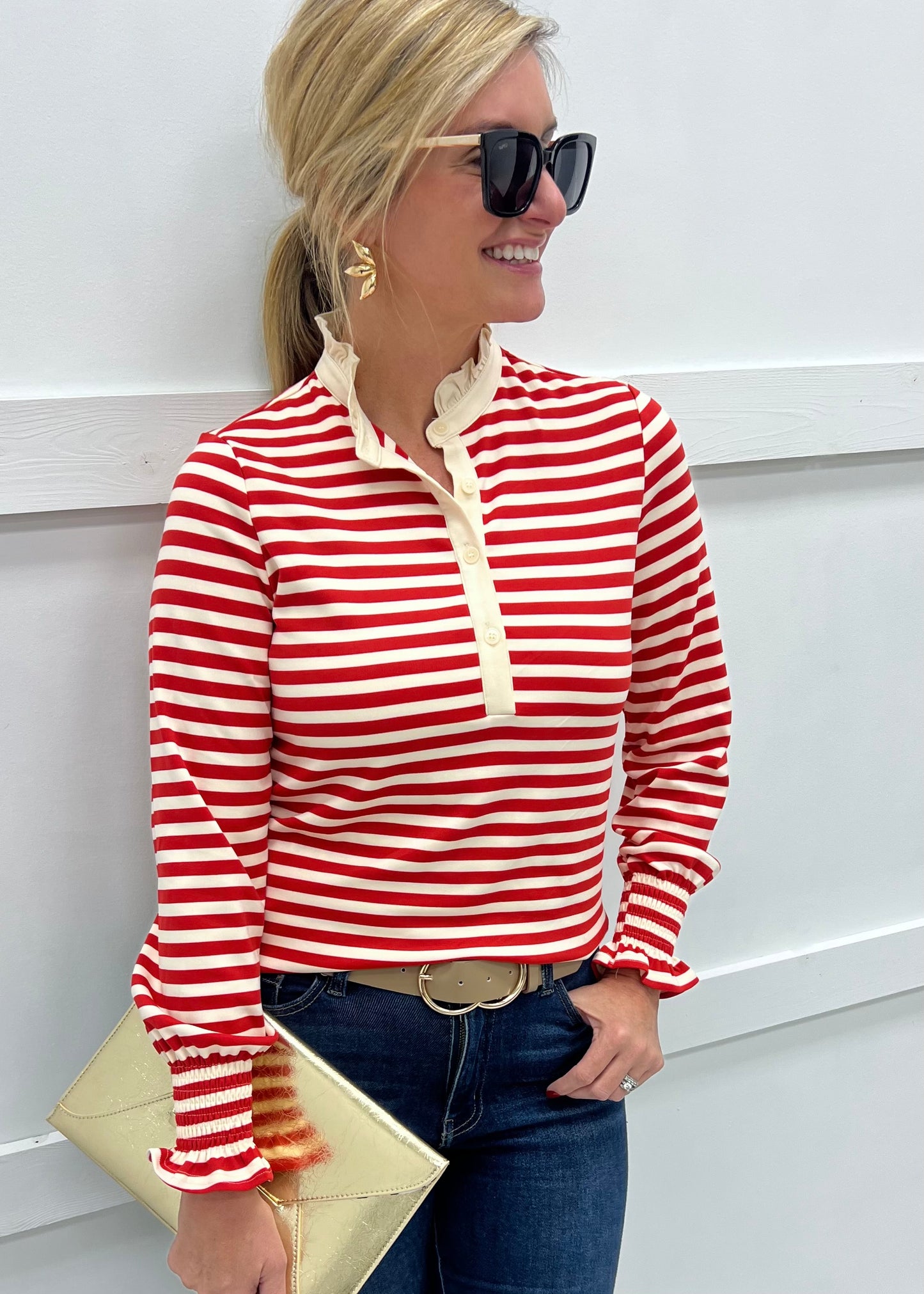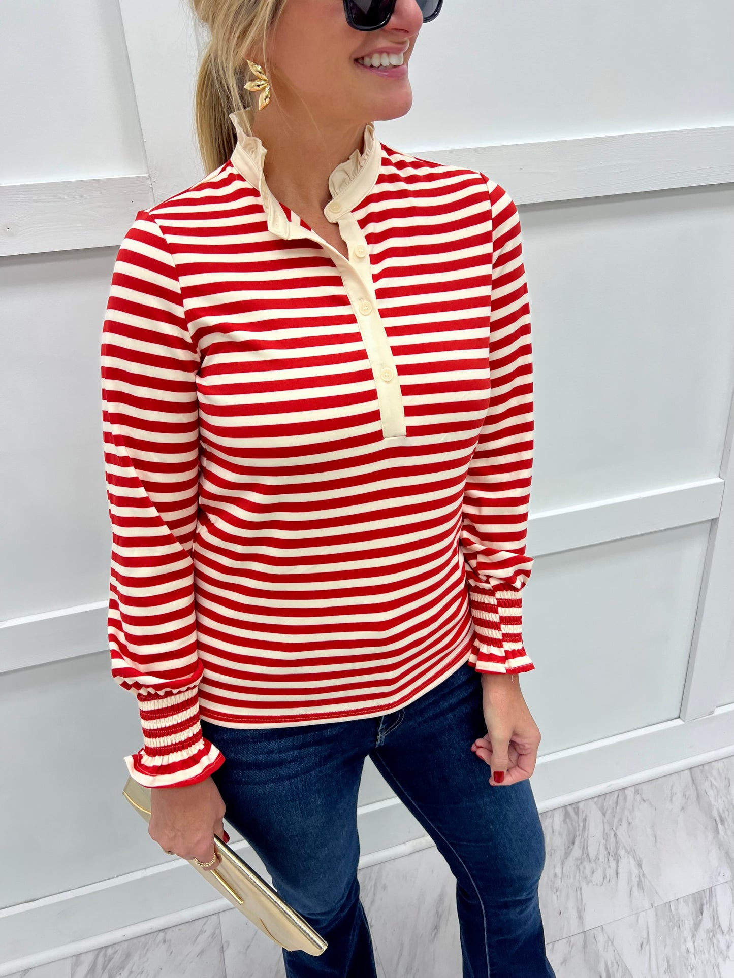 All of the frills in one darling little top! This cream and red striped top is soft and stretchy with ruffle detail along the collar, a 4 button closure, long sleeves with smocked detailing at the wrists and a relaxed fit. It will be love at first sight as soon as you slip it on! Model is 5'8'' and wearing a size small.
