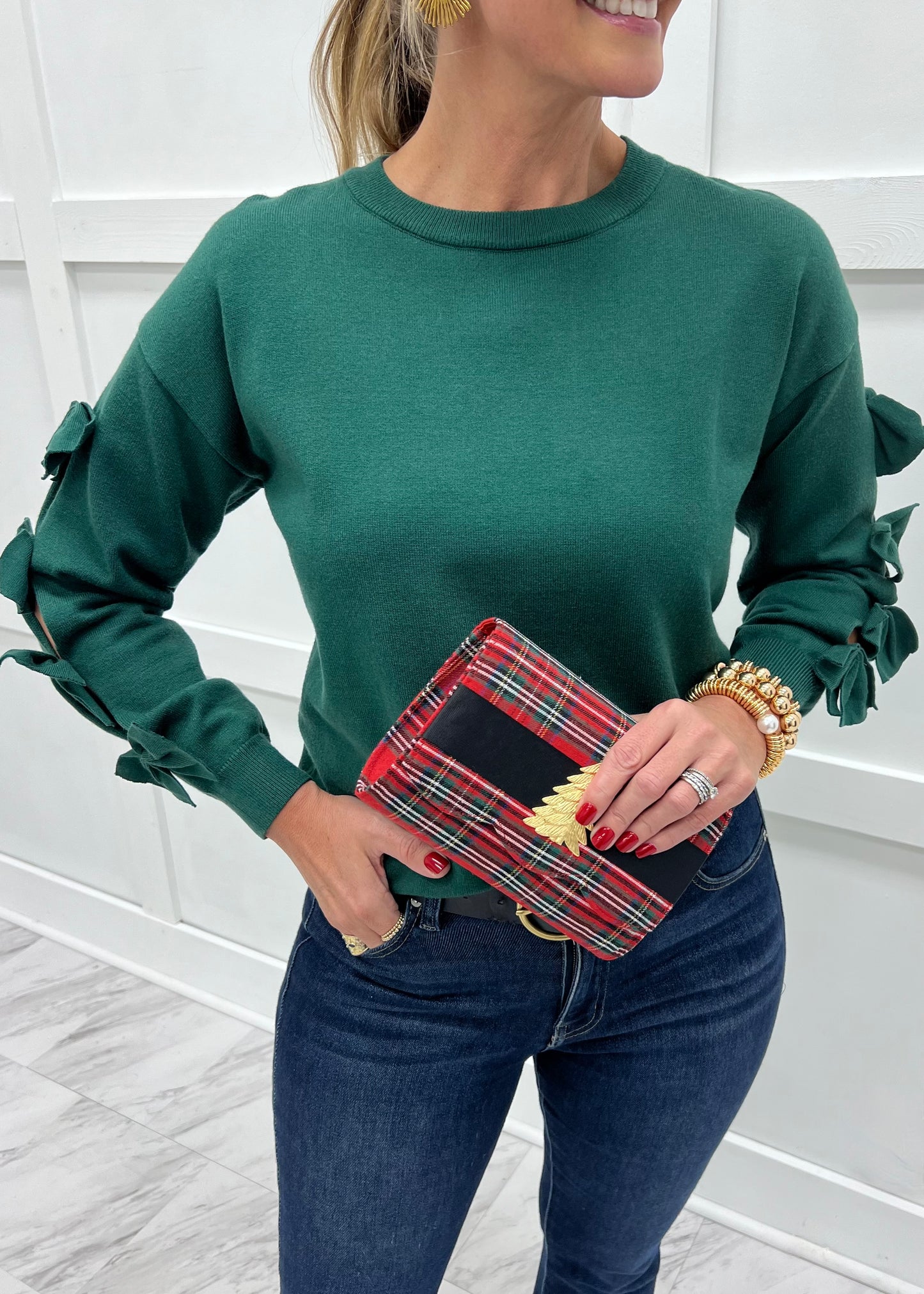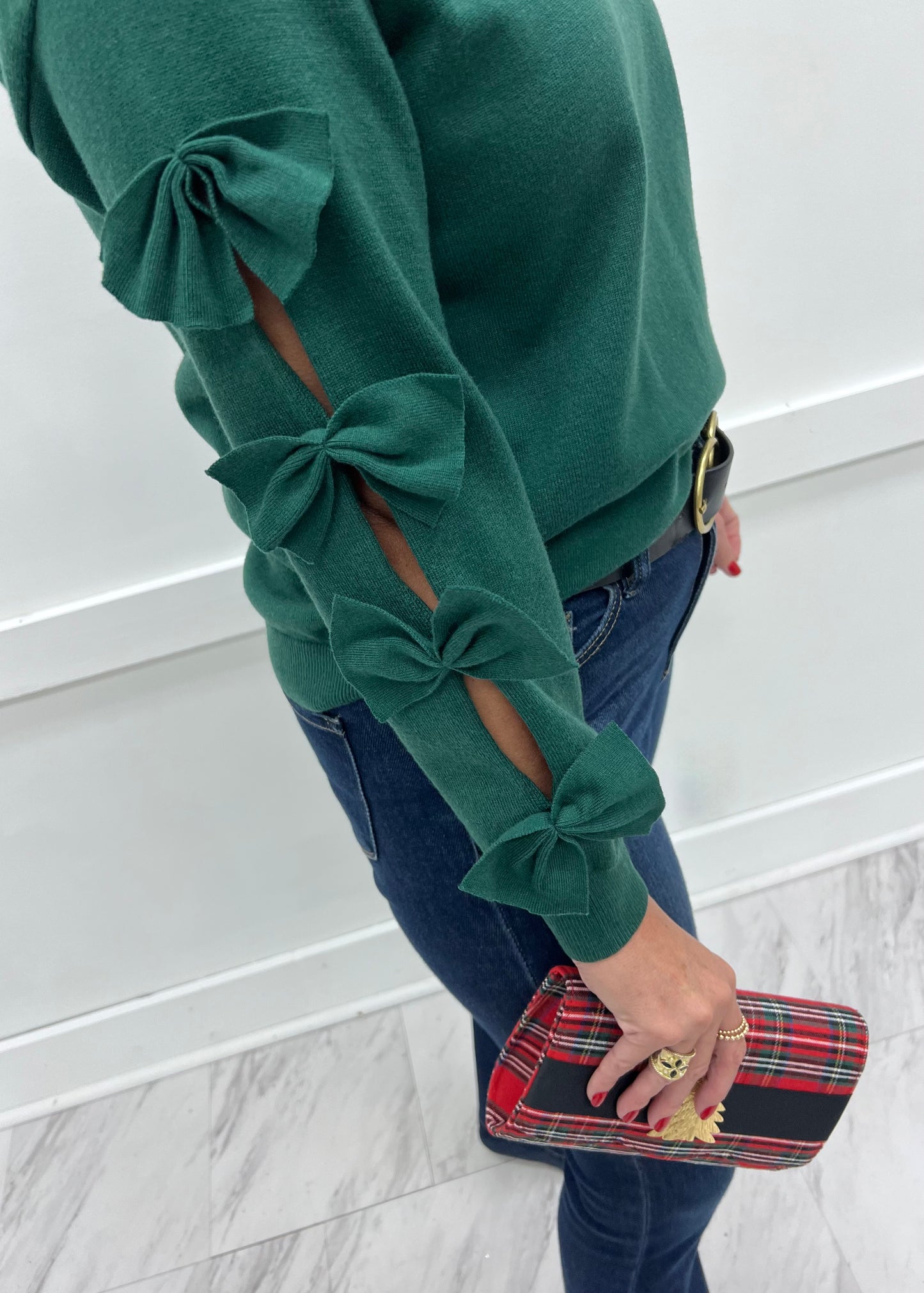 With fun + feminine details, this darling little sweater is sure to bring a smile to your face! Dark green medium weight sweater material shapes this style with a round neckline, ribbed detailing at the neckline, waistline & wrists and long sleeves that are open at the side with four bow details down each arm. This sweater is so easy to wear and looks great paired with trousers, skirts or any wash of denim. Model is 5'8'' and wearing a size small.