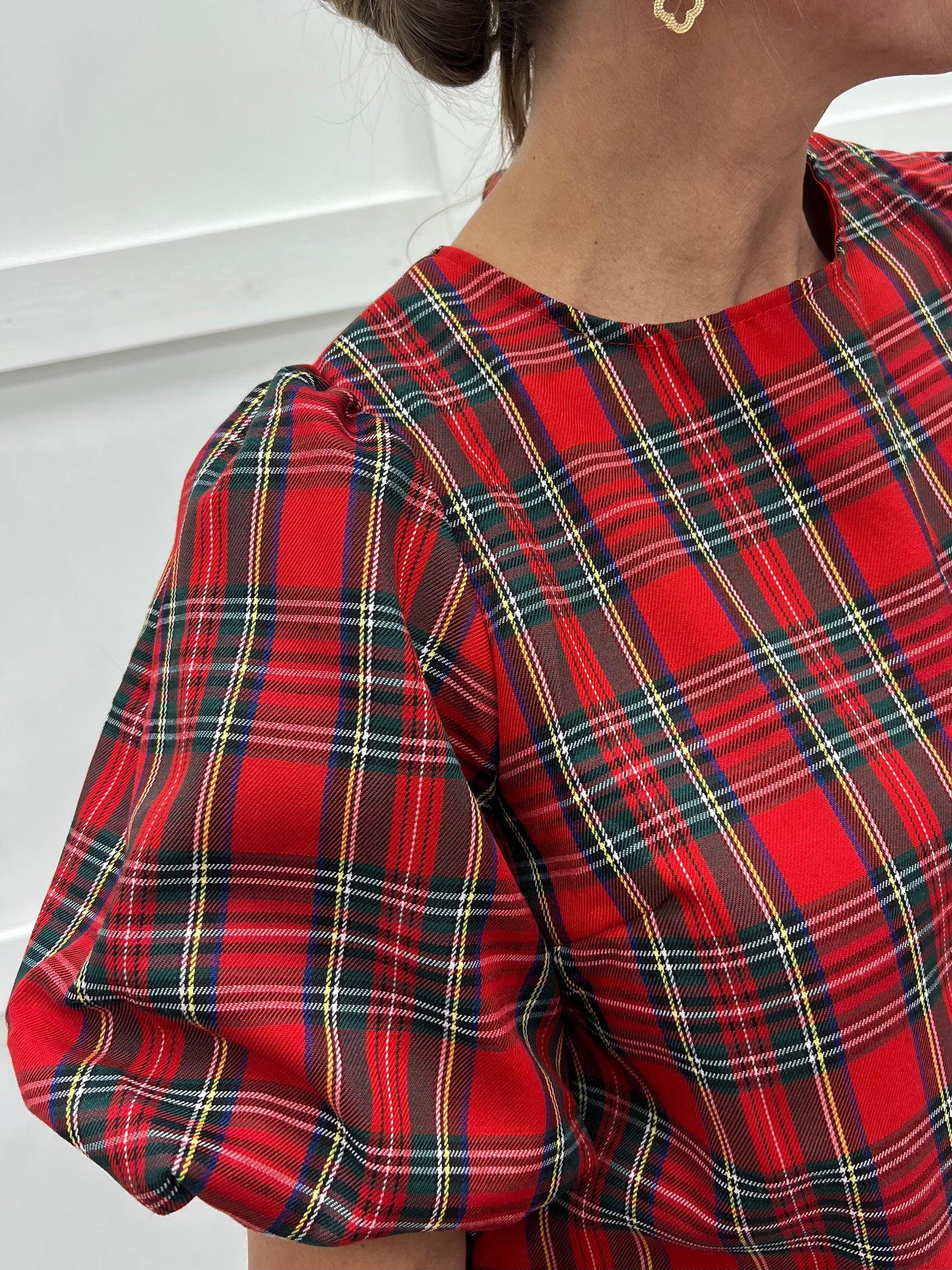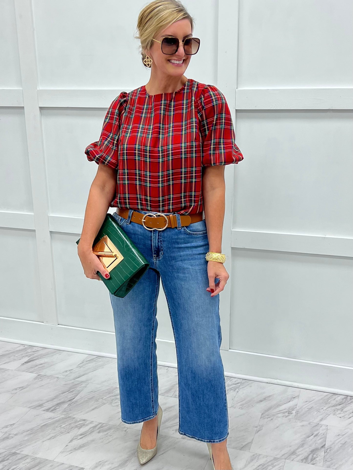 A traditional plaid top but make it modern with special details! A classic red plaid fabric shapes this top featuring a round neckline, short puff sleeves, and a looser fit. The back has a larger keyhole at the neckline with two bow self closures... so cute! We love this updated take on the traditional plaid top and can't wait to style it for the holidays! Model is 5'8" and wearing a size small.