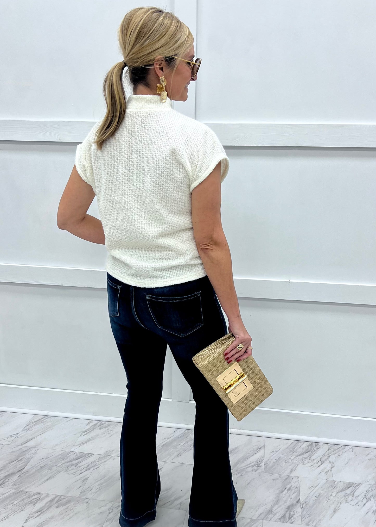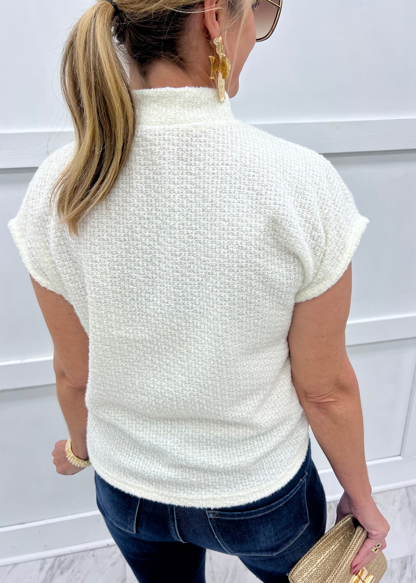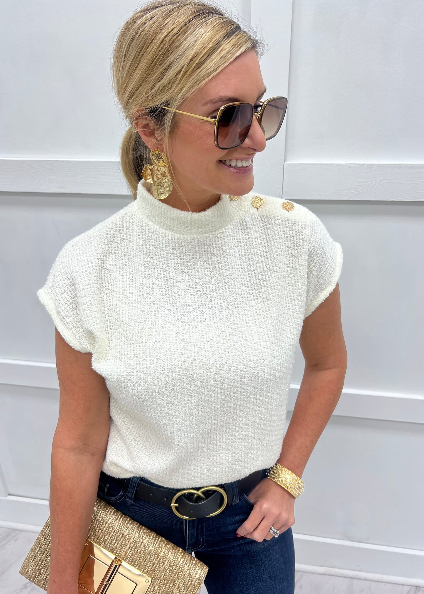 Chic and stylish... this neutral sweater has just the right amount of glam to make this one stand out in the crowd! Ivory colored sweater knit fabric with slightest hint of shimmer shapes this sweater featuring a mock neckline with three hammered gold button closure, dolman cap sleeves and a relaxed fit. This versatile style can easily be dressed up or down depending on what you pair it with... wear it for work or for play! The styling options are endless! Model is 5'8'' and wearing a size small.