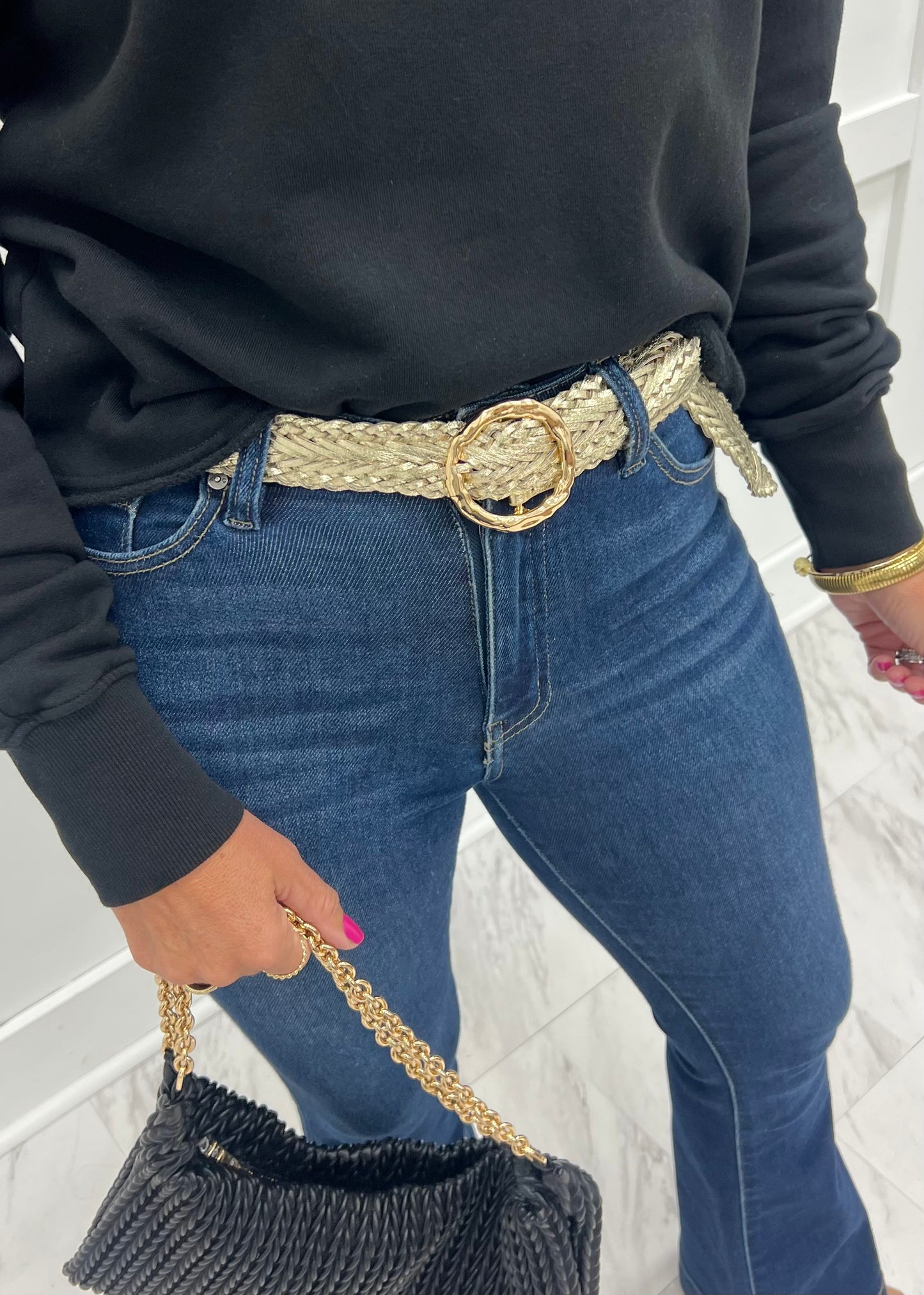 Pull your look together and define that waistline with this stylish gold belt! Woven material in gold with a gold metal buckle. Make your outfit shine with this chic style!