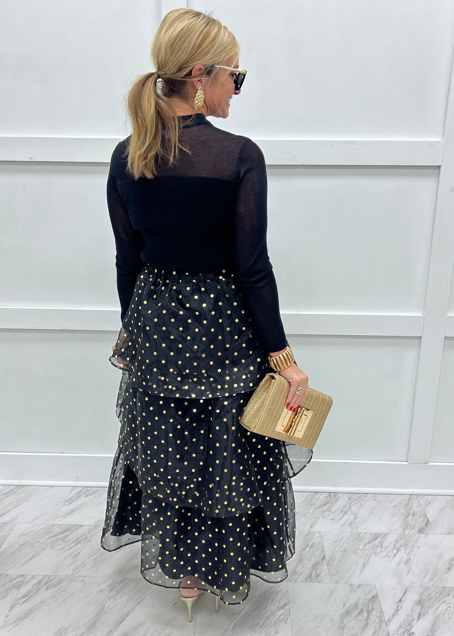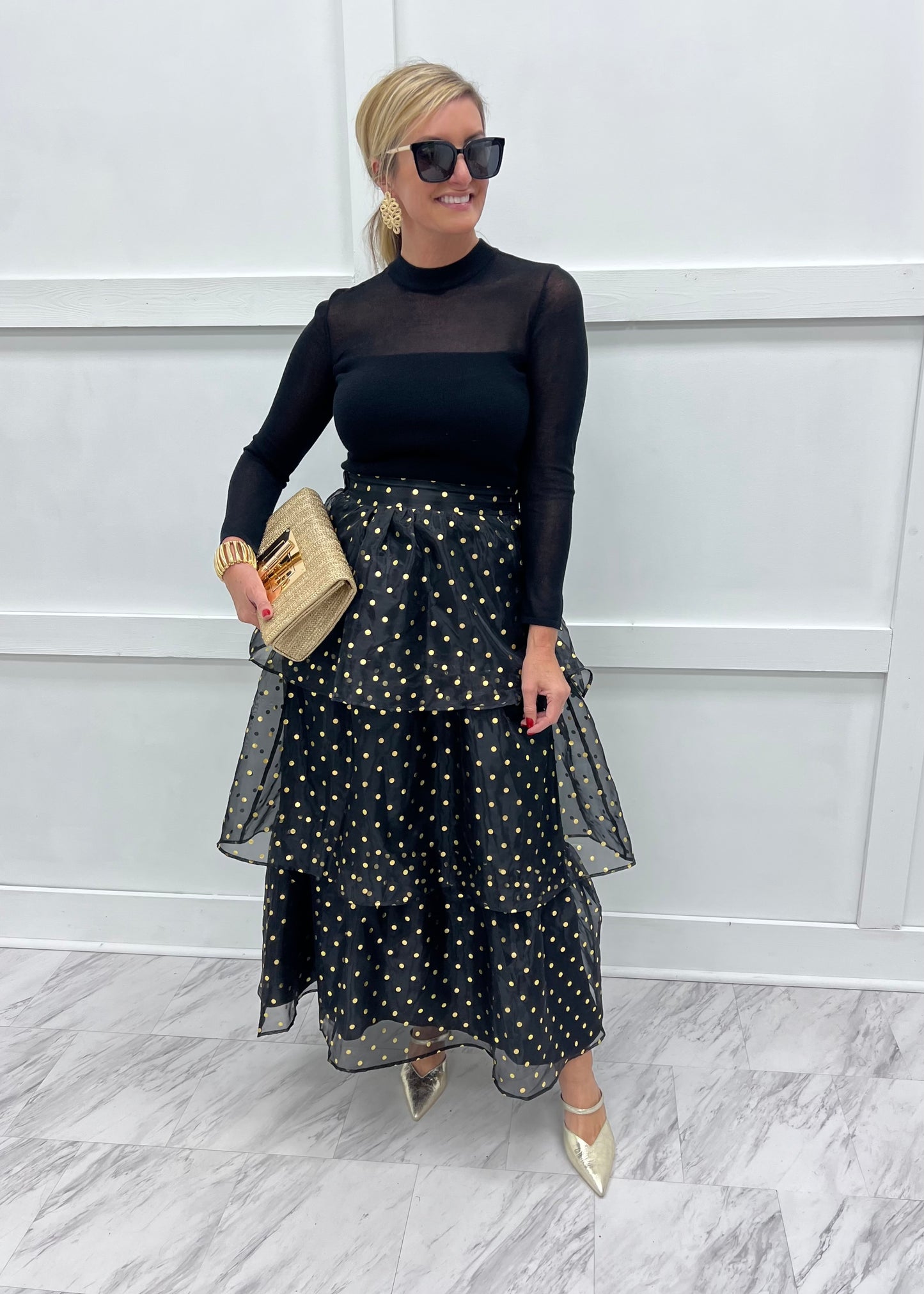 Our Midnight Soiree Skirt makes looking glamorous feel effortless! Black fabric with shimmering gold polka dots shapes this skirt featuring a flat front waistband with a band of elastic in the back and a tiered silhouette. This skirt is not only stunning, it is also comfortable... made for dancing the night away! Skirt is fully lined. Model is 5'8'' and wearing a size small.