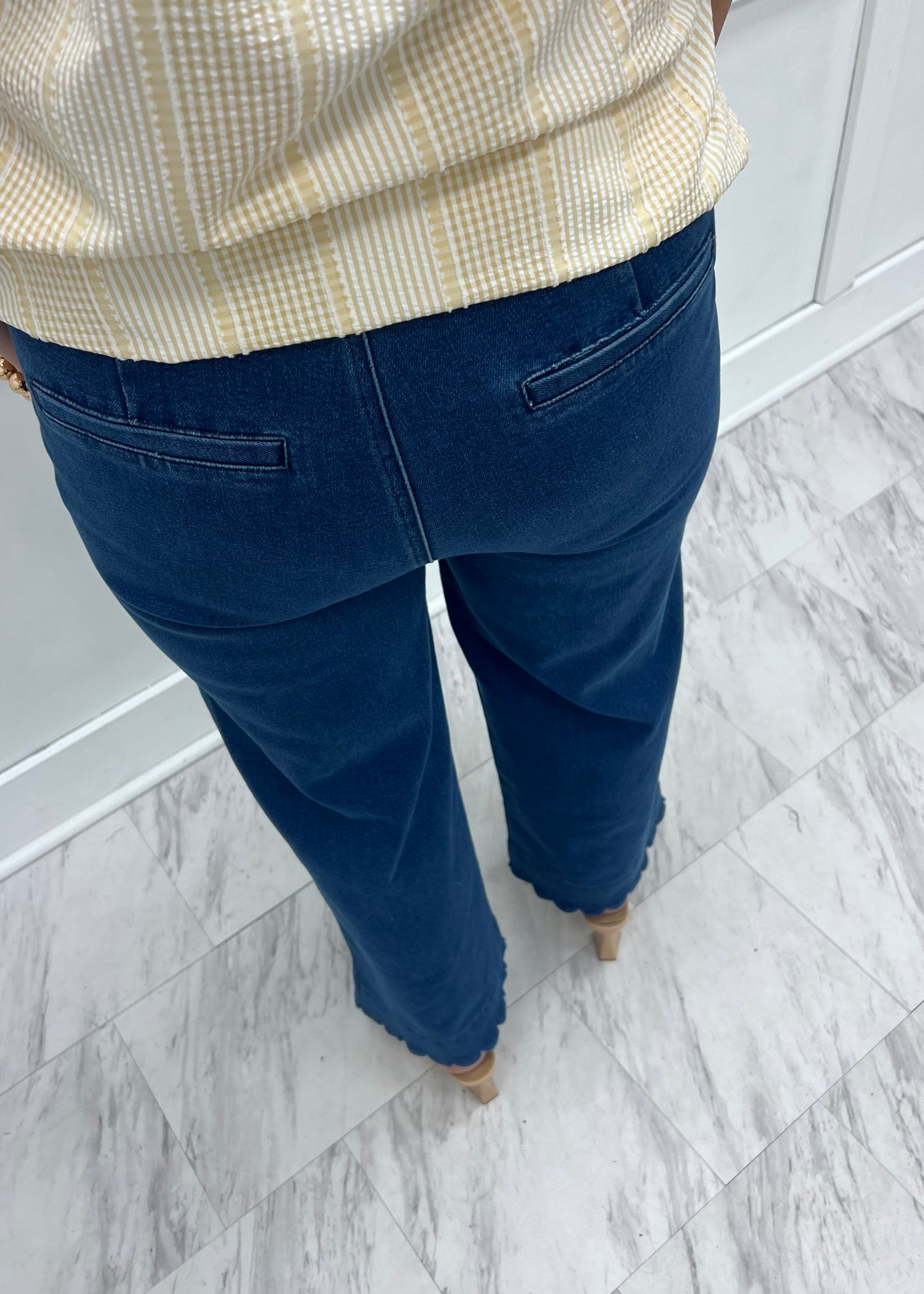 Our Sydney Scallop Denim Pants are a modern favorite! Darker wash denim fabric shapes these pants with a button + zip front closure, belt loops, front patch pockets with scallop detail, faux back slit pockets, and a wide leg with scallop detail at the hemline. This pair is ultra flattering and ultra comfortable, making them perfect for work or for play! This standout style is sure to be a wardrobe favorite! Model is 5'8'' and wearing a size medium.