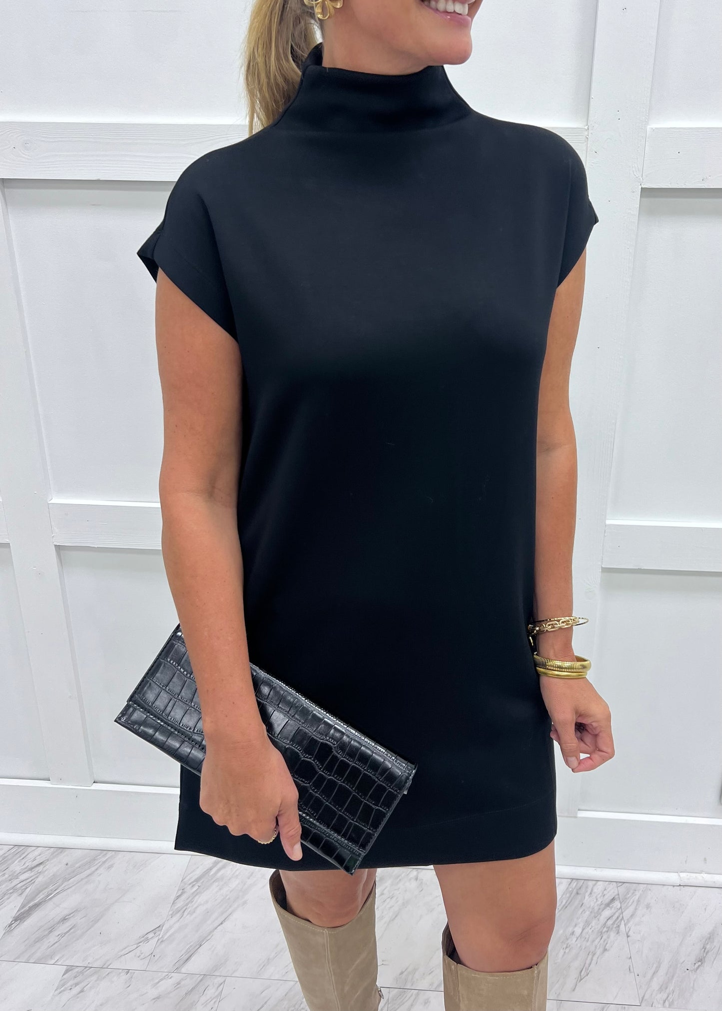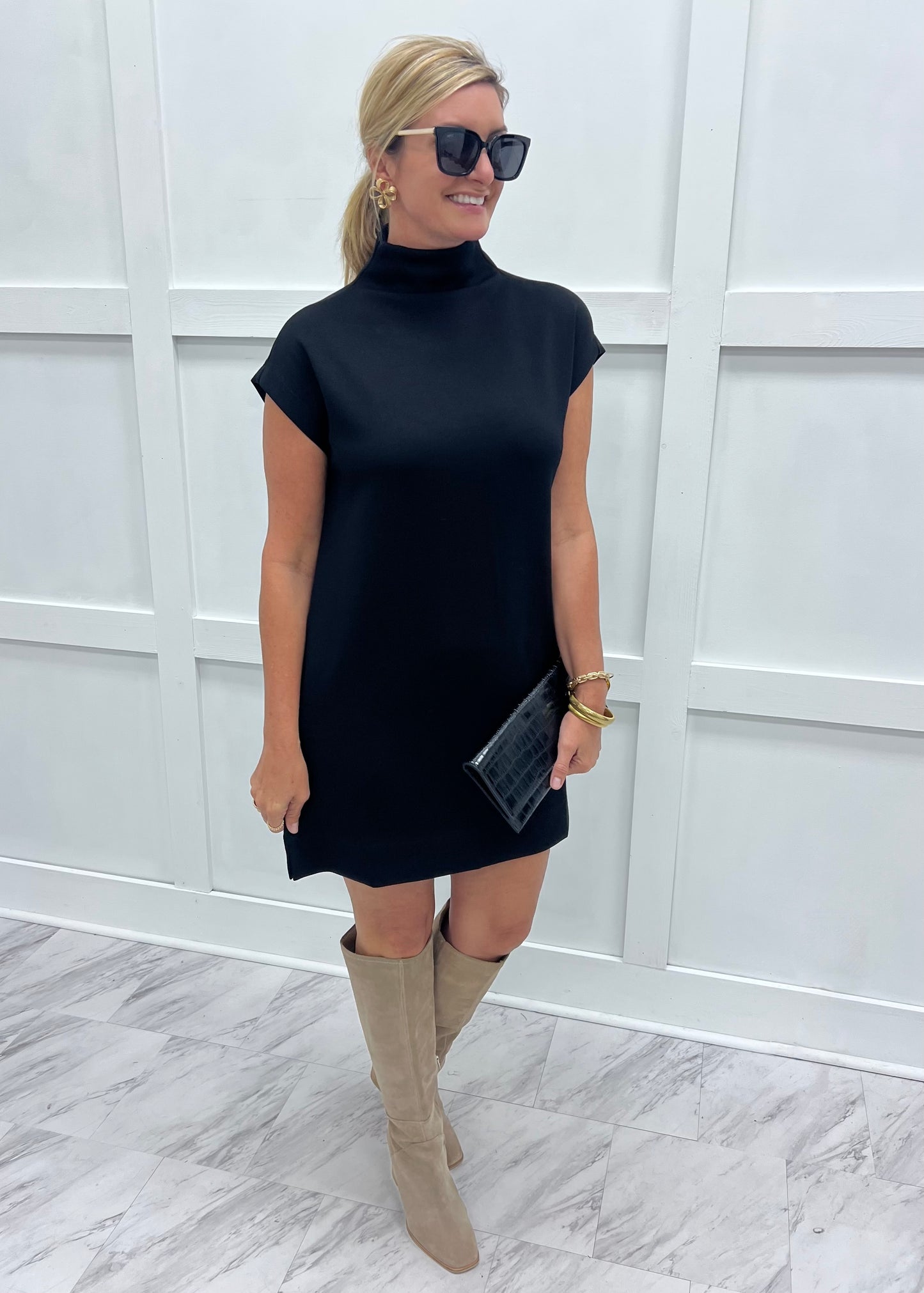 Make a style statement in this classic style dress! Black colored scuba knit fabric shapes this dress featuring a mock neckline, dolman cap sleeves, side slit pockets and a relaxed fit silhouette. Style this one for so many events and occasions. This one looks and feels like dream. Model is 5'8'' and wearing a size small.
