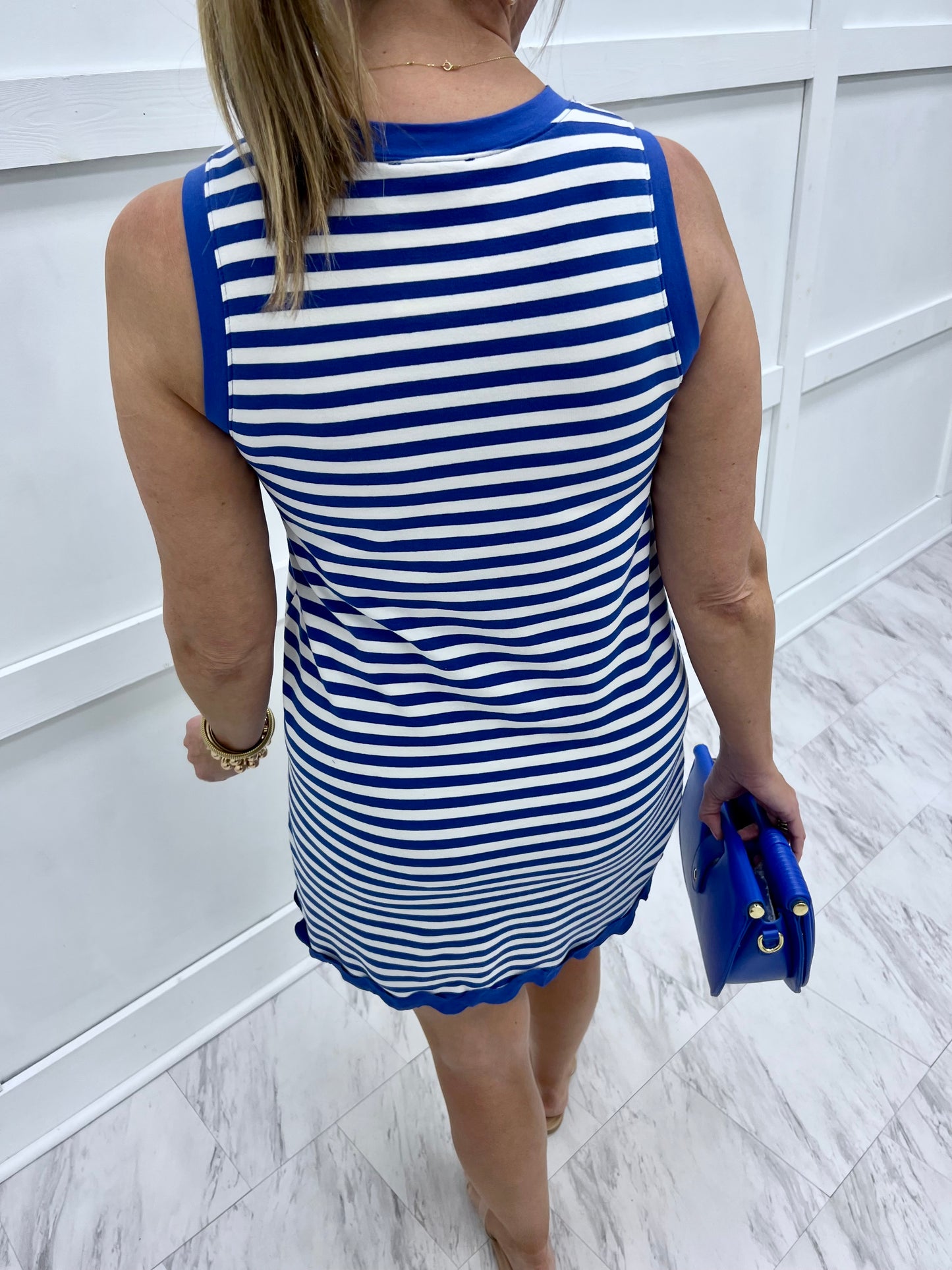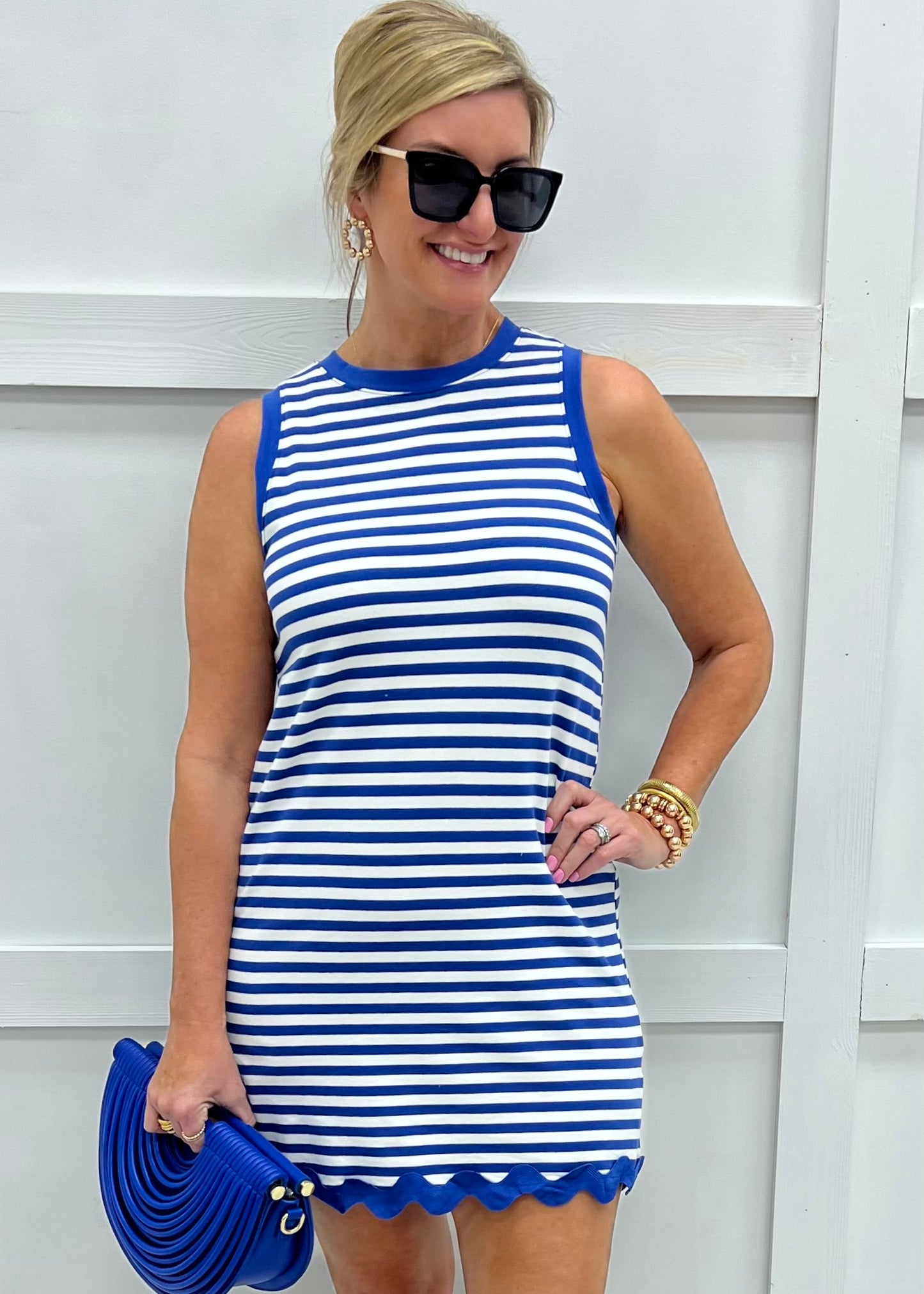 Cute + comfortable, this is simply the perfect dress for warm days! Royal blue and white striped knit fabric shapes this tank style dress with a round neckline, straight silhouette, and ric-rac trim detailing along the hemline. This easy to wear dress looks great on its own or paired with cute denim jacket if the evening is cool! Don't go on vacation without this dress in your suitcase! Model is 5'8'' and wearing a size small.