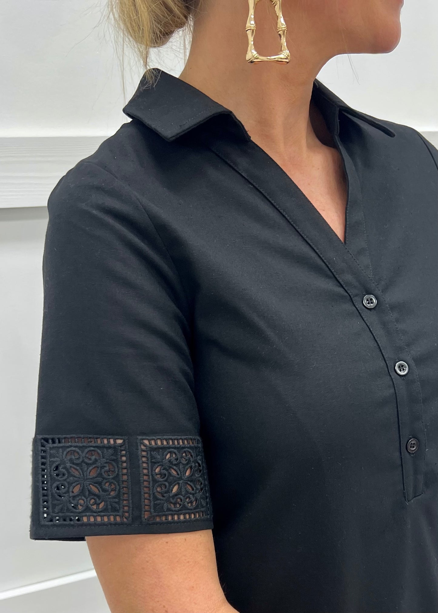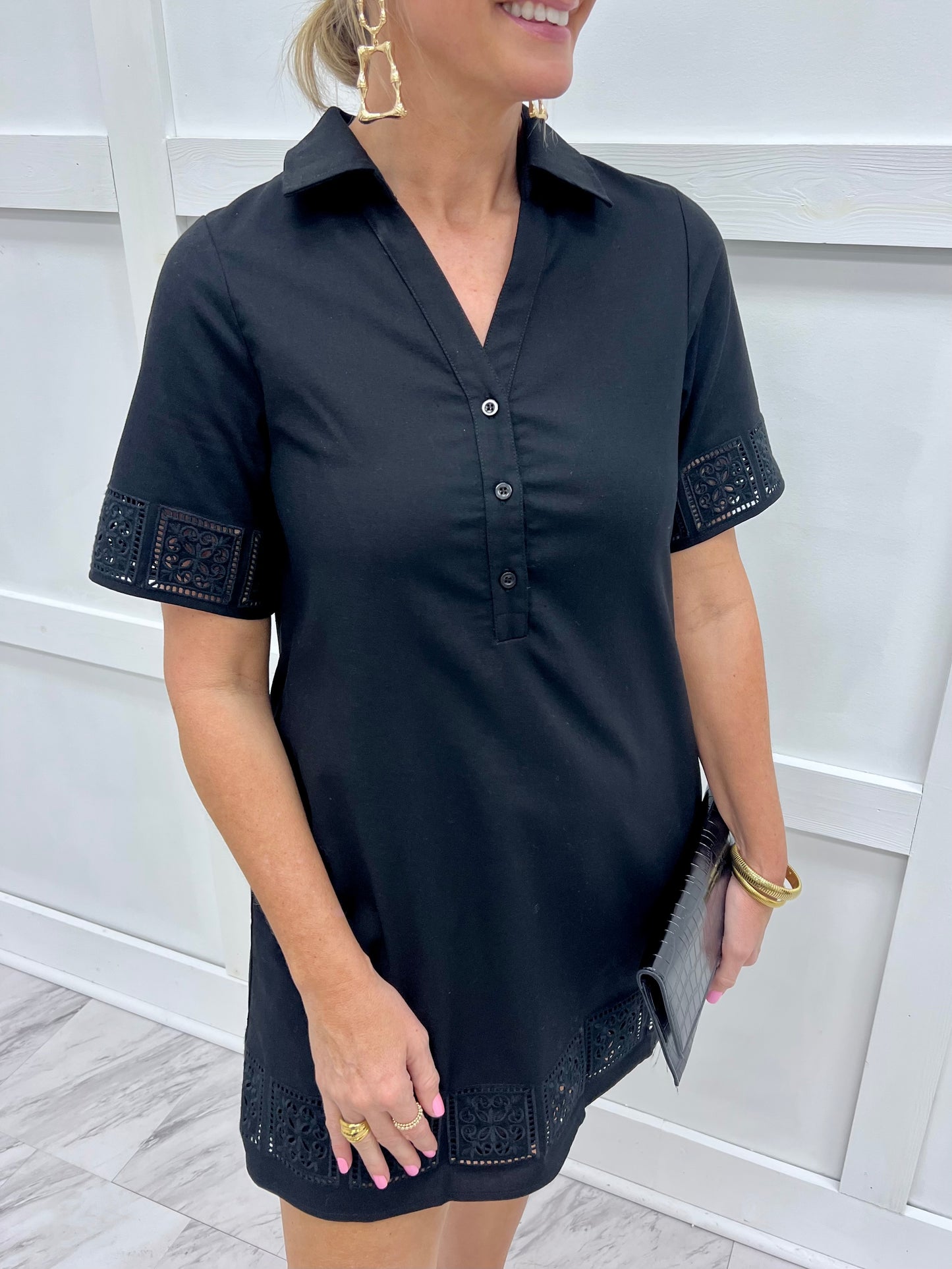 Take the classic shirtdress and give it a modern update with this chic style! Classic black woven fabric shapes this dress with a collar v.neckline, 3 button front closure, short sleeves with lace detail, side slit pockets and a straight fit with lace detailing along the hemline. We can't get enough of this unique yet timeless dress and think it can be styled for so many occasions. Model is 5'8'' and wearing a size small. Dress is fully lined.