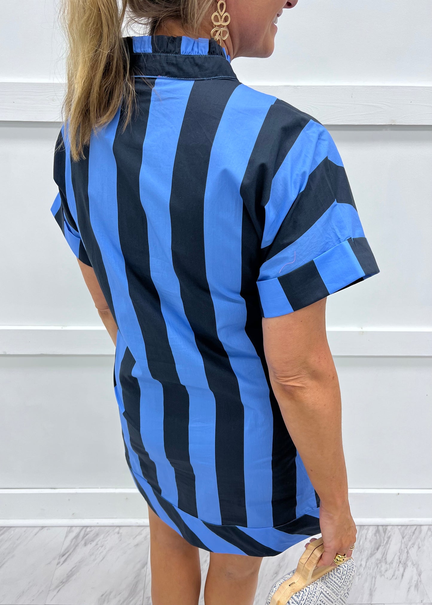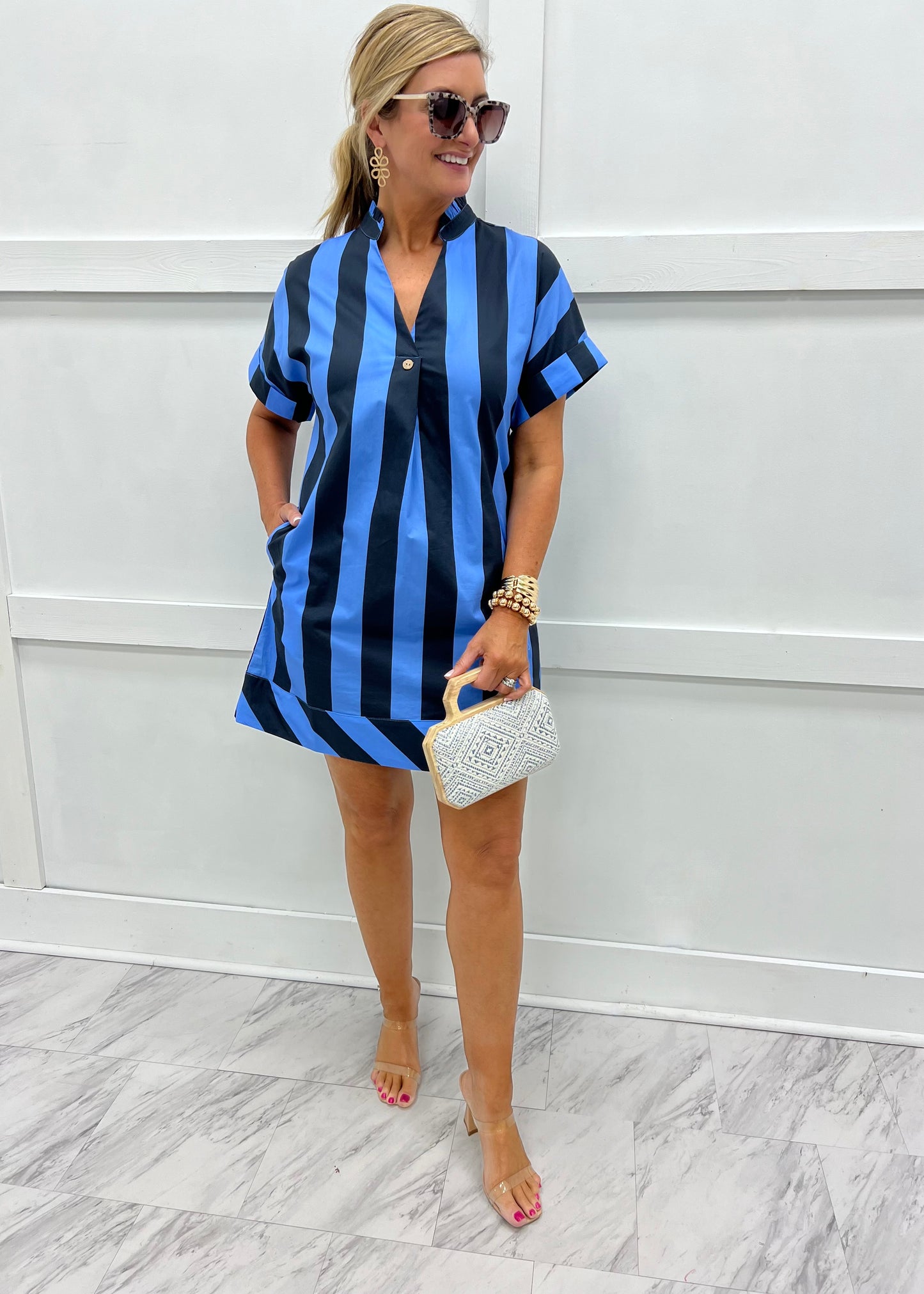 Go ahead and grab all of the attention when you wear this extra fun little dress! Vertical striped fabric in pool blue and navy blue shapes this dress featuring a v.neckline, subtle ruffle detail along the neck, a single button detail with inverted pleat, side slit pockets, and short dolman sleeves with roll detail. This ultra feminine style has a relaxed fit and looks amazing with cute sandals and statement earrings! This one is sure to be a favorite this season! Model is 5'8'' and wearing a size small.