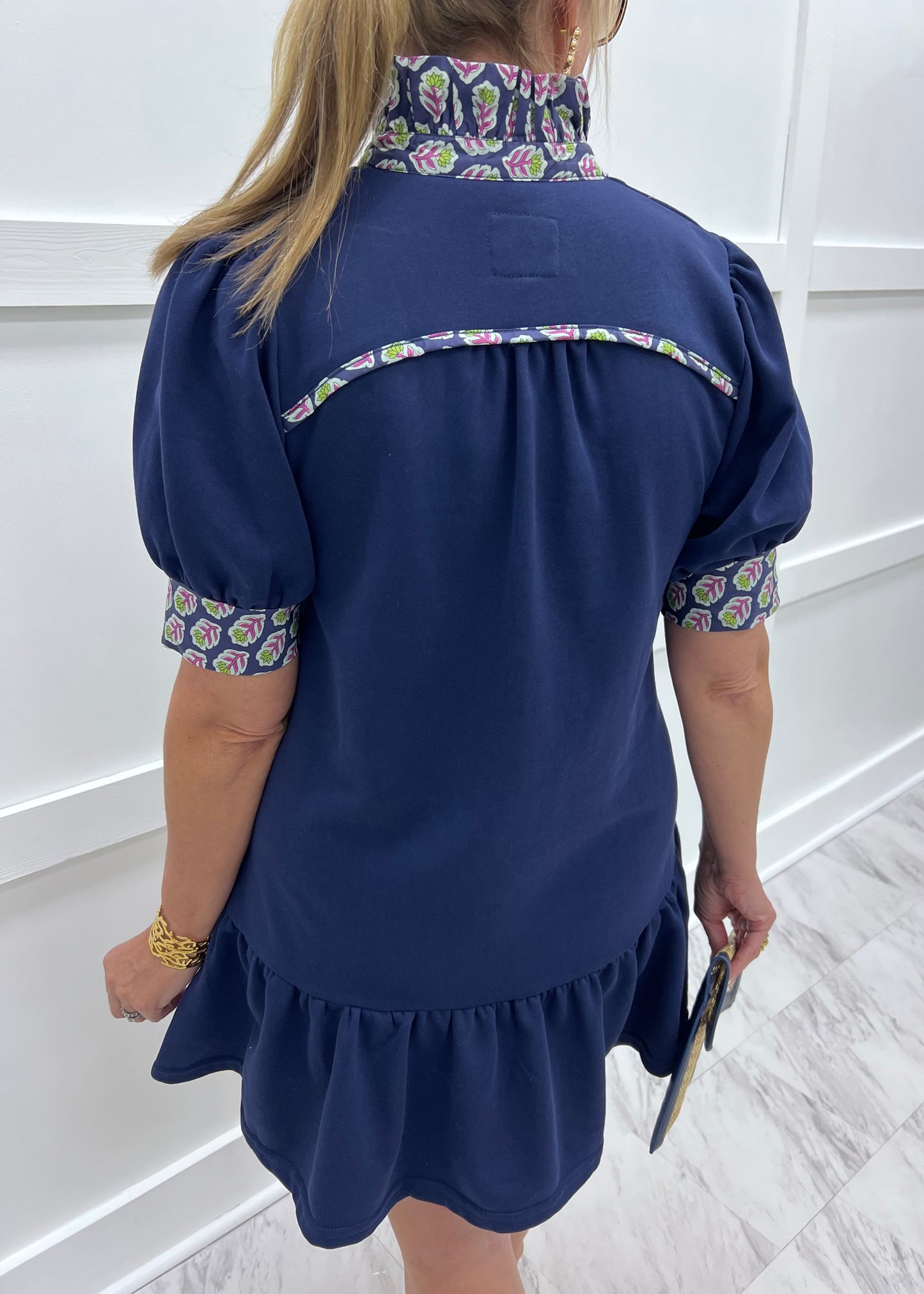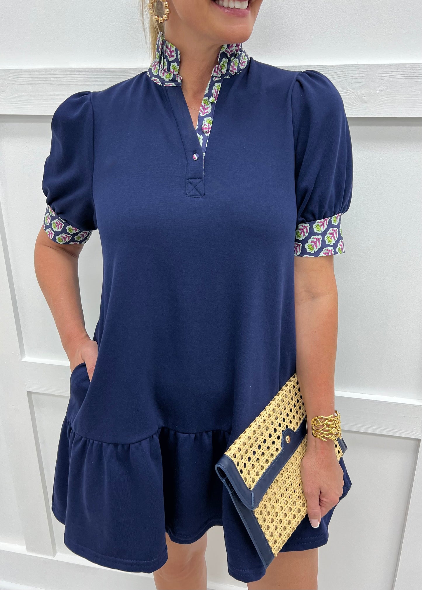 All of the frills in one darling little dress! This navy blue colored dress is soft and stretchy with a standup collar in floral print woven fabric, featuring a 4 button closure and short banded puff sleeves + a stripe on the back in the floral print fabric, side pockets and a flounce hemline... so cute! It will be love at first sight as soon as you slip it on! Model is 5'8'' and wearing a size small.
