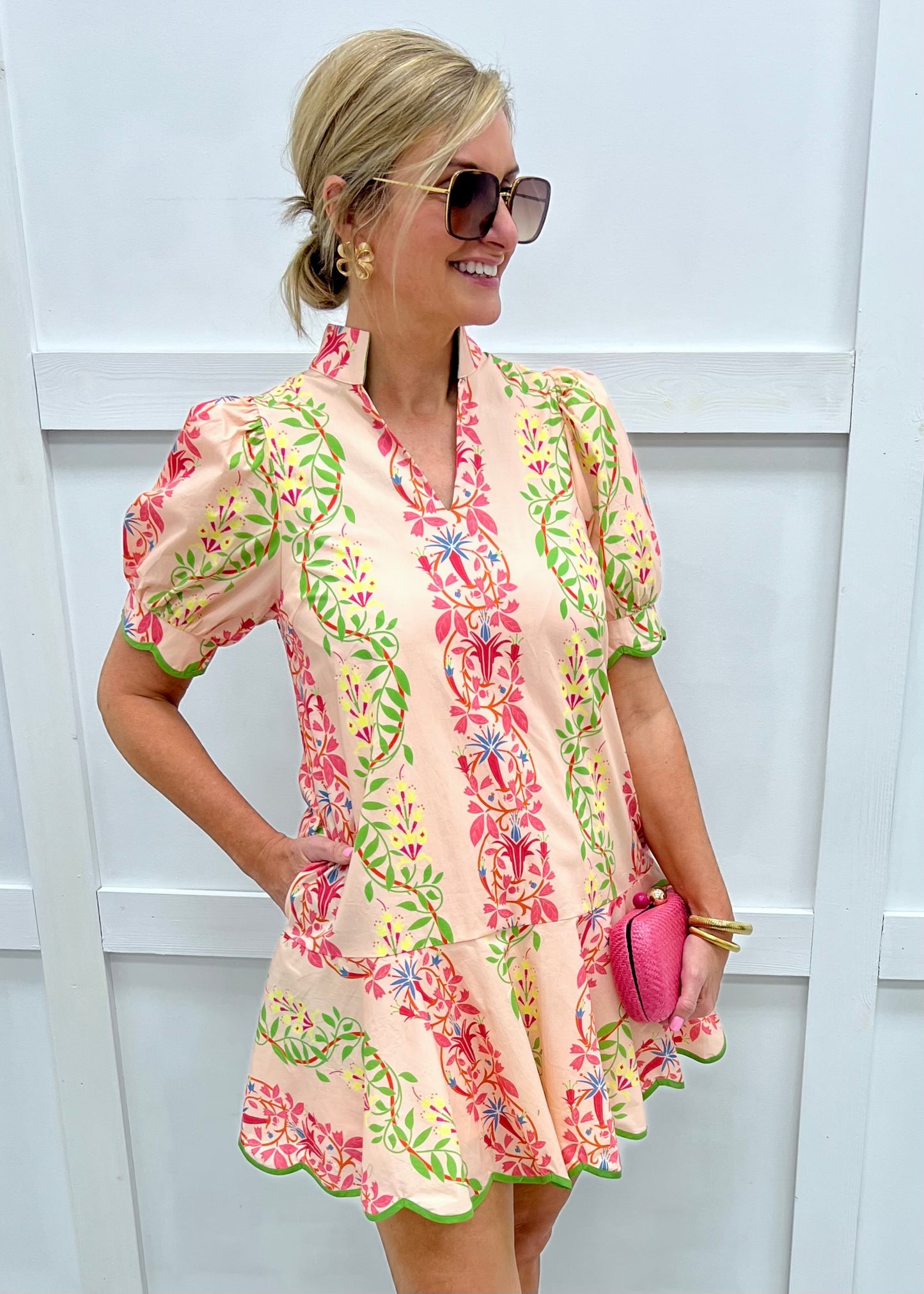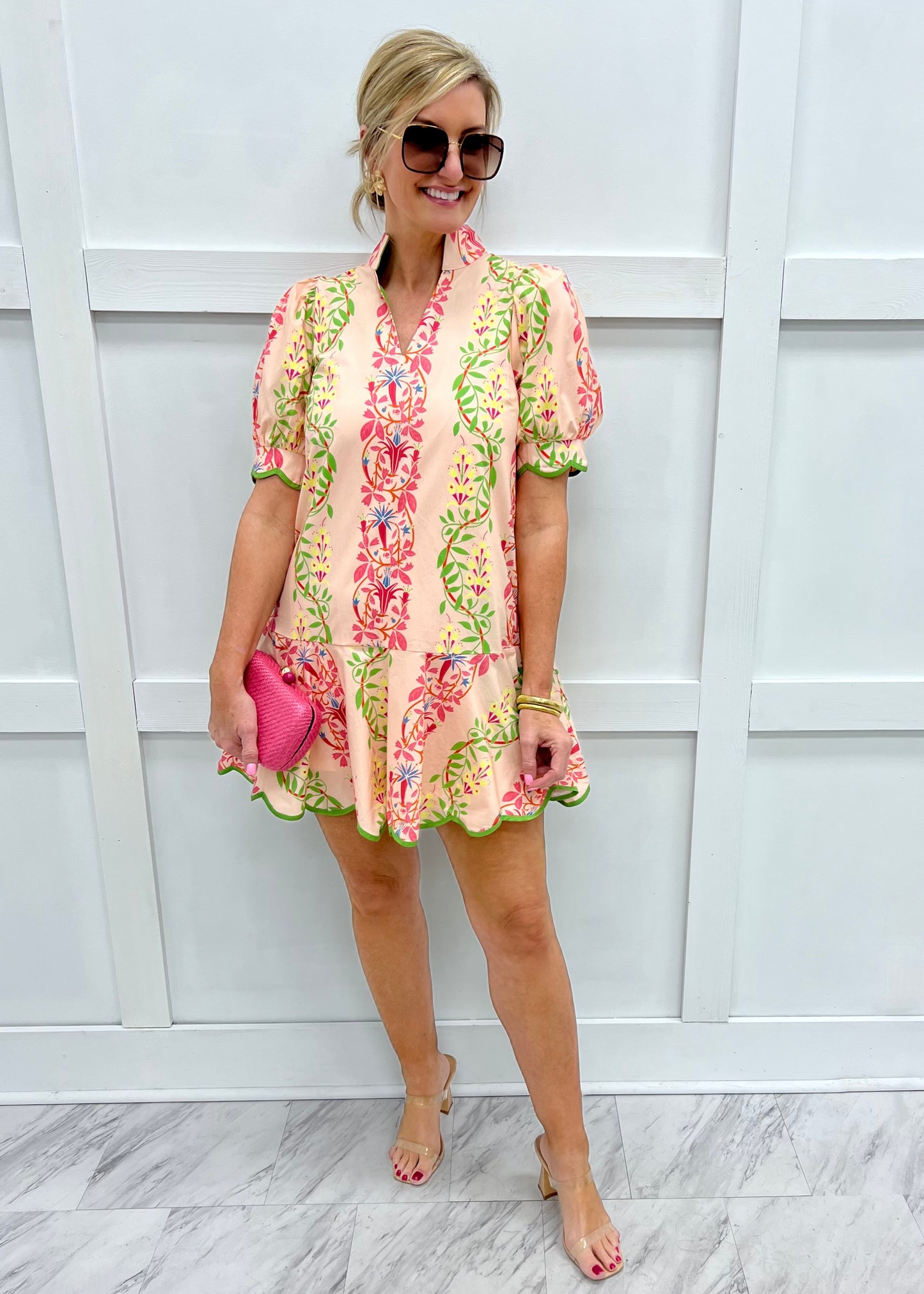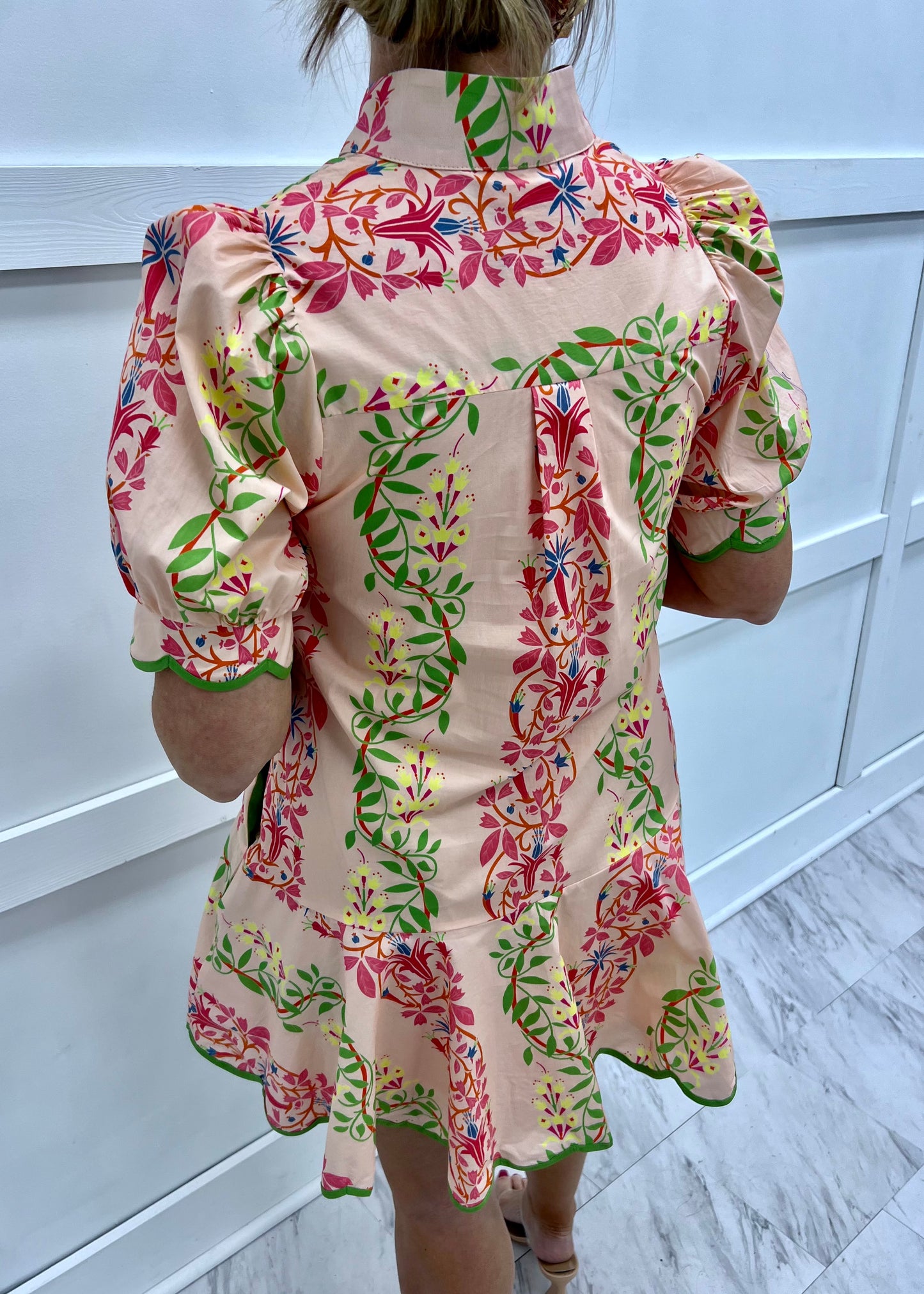 Hello lovely... get ready for all the compliments while wearing this chic dress! A gorgeous print in all of the best shades of spring shapes this dress featuring a v.neckline, short puff sleeves with green scallop trim, a straight silhouette and flounce hemline with green scallop detail. This dress is simply stunning! Pair this one with cute sandals and gold accessories and get ready for the compliments! Dress is lined. Model is 5'8'' and wearing a size small.