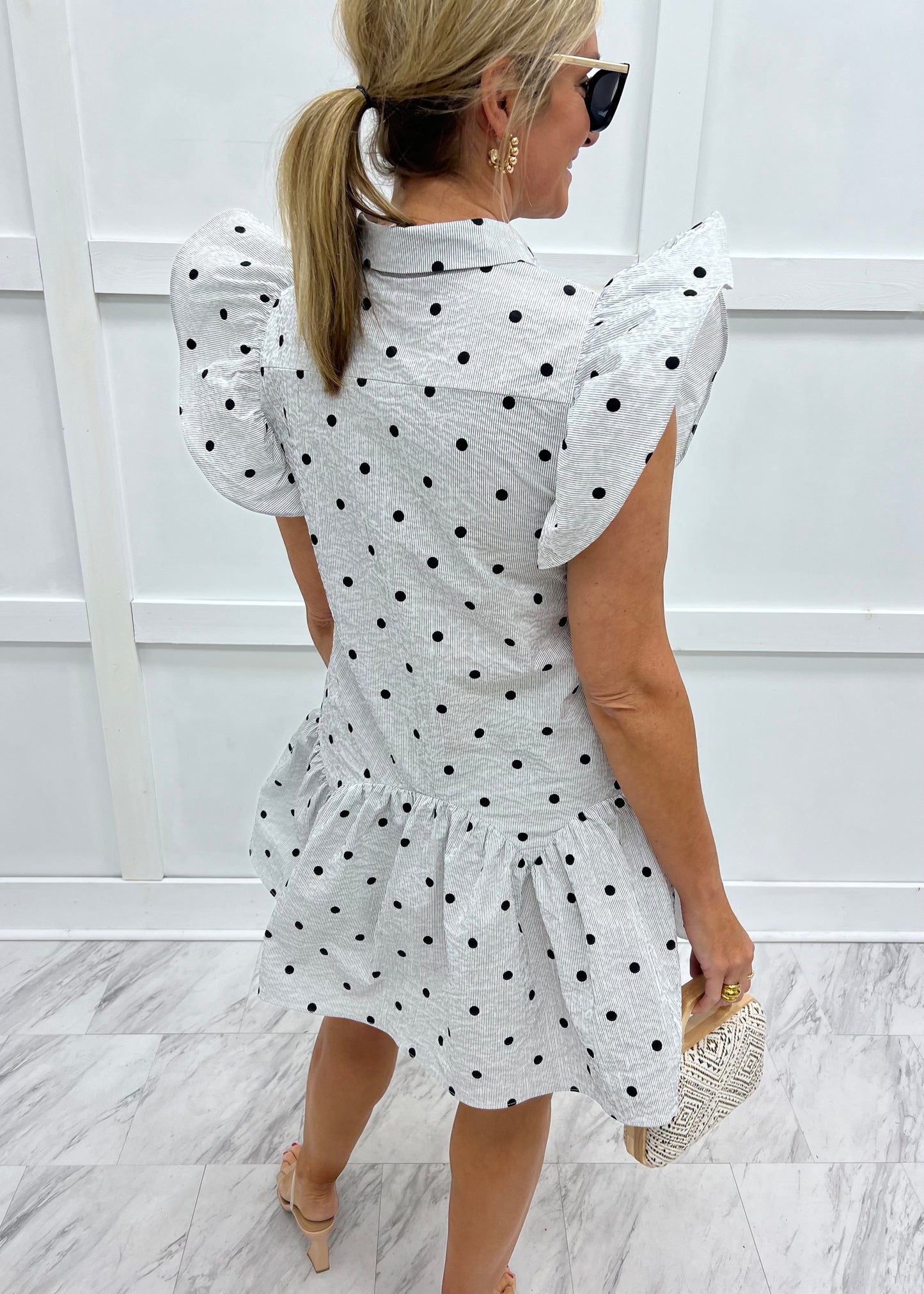 Pretty in Polka Dots... this dress is so cute! Black and white striped woven fabric with black polka dots shapes this dress featuring a collar neckline, button front closure, flutter sleeves and a dropped waistline. This dress is modern and timeless all at the same time! So Pretty! Model is 5'8'' and wearing a size small dress & 3.5" heels.