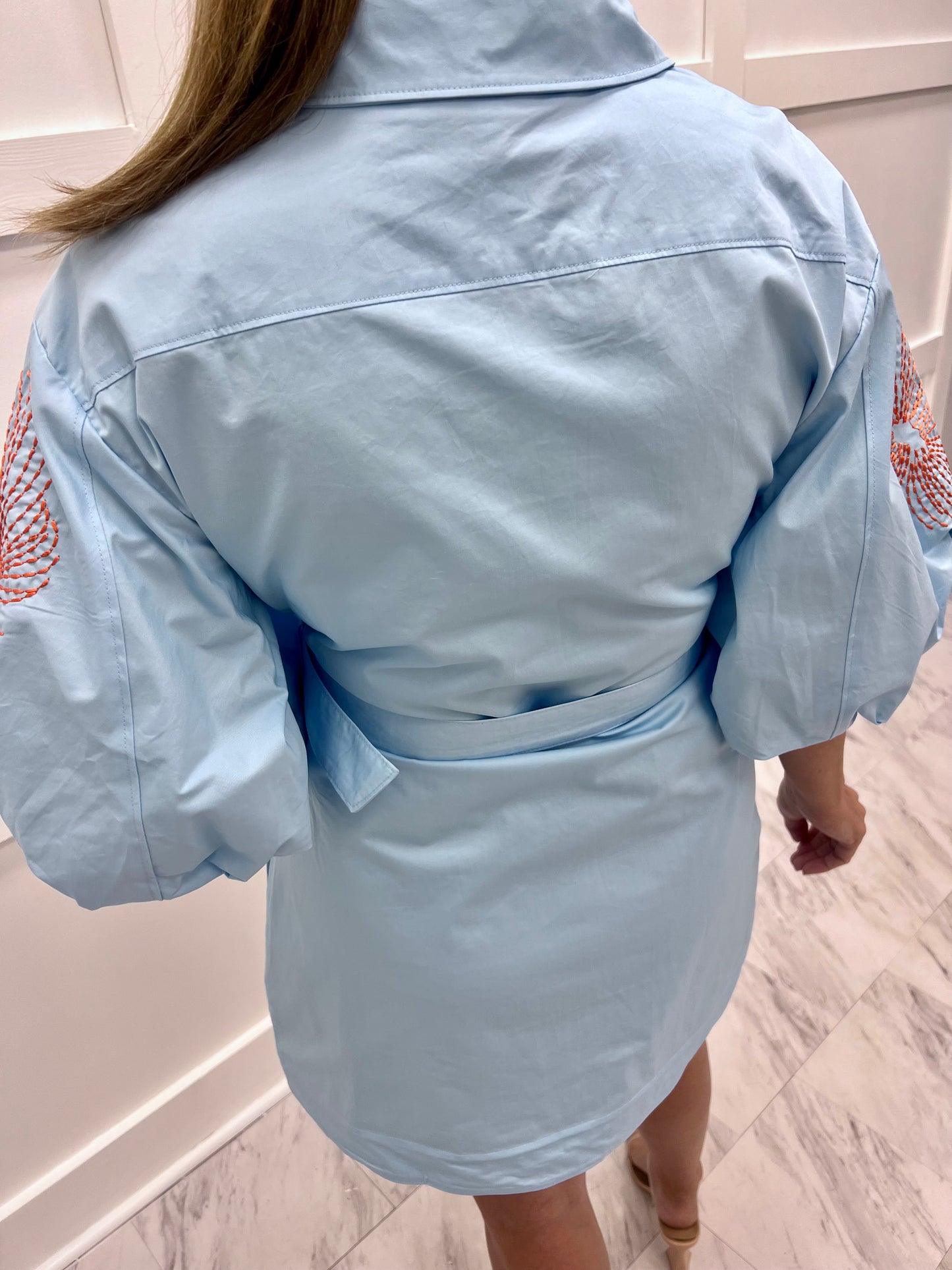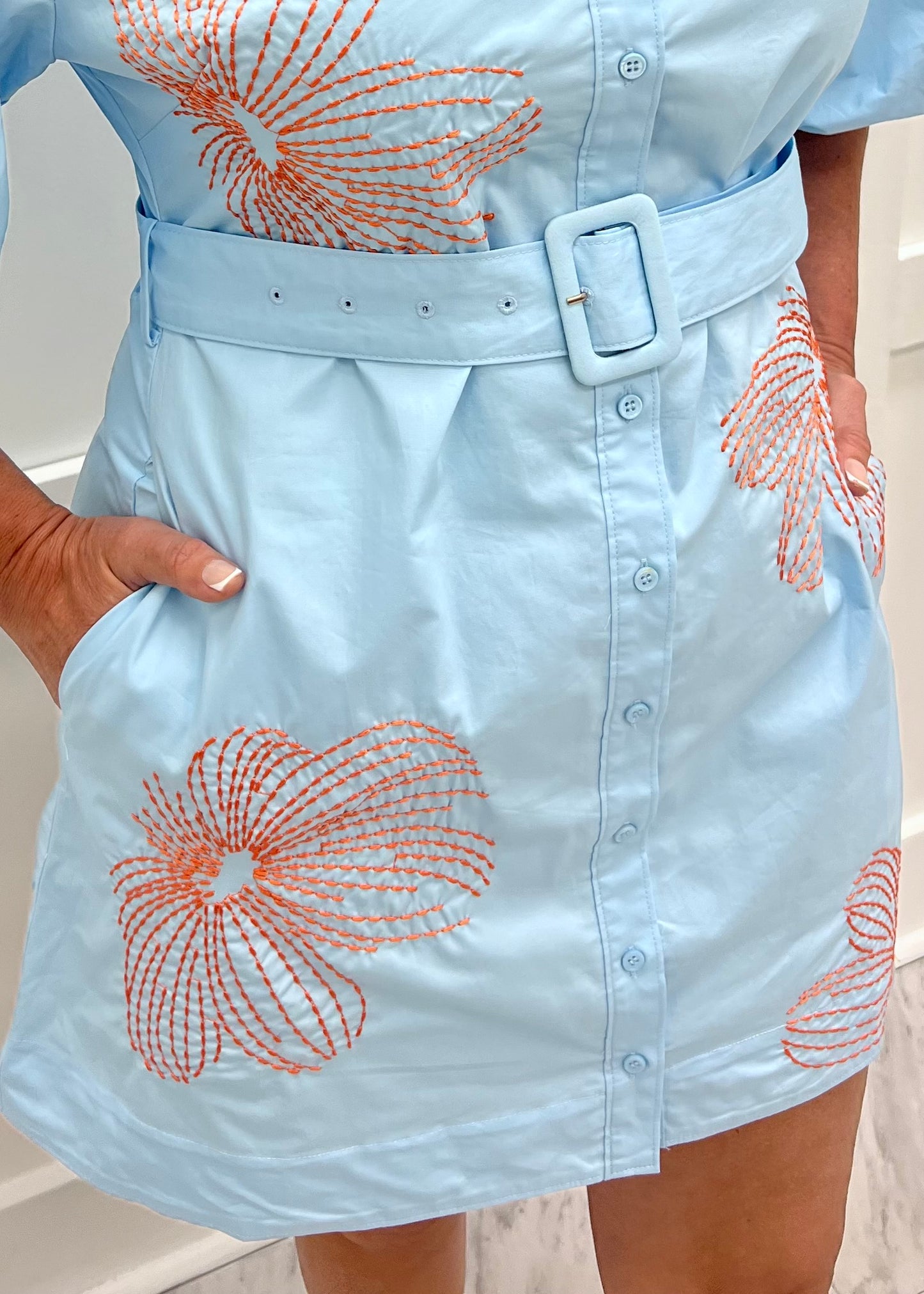 Welcome the warm weather in this stunning dress! Sky blue colored woven fabric with large embroidered flowers in orange shapes this dress featuring a collar neckline, button front closure, oversized puff sleeves and removable belt. This style takes the classic shirt dress and gives it a modern update. Just add chic accessories and you will be ready to celebrate at any event! Model is 5'8'' and wearing a size medium.