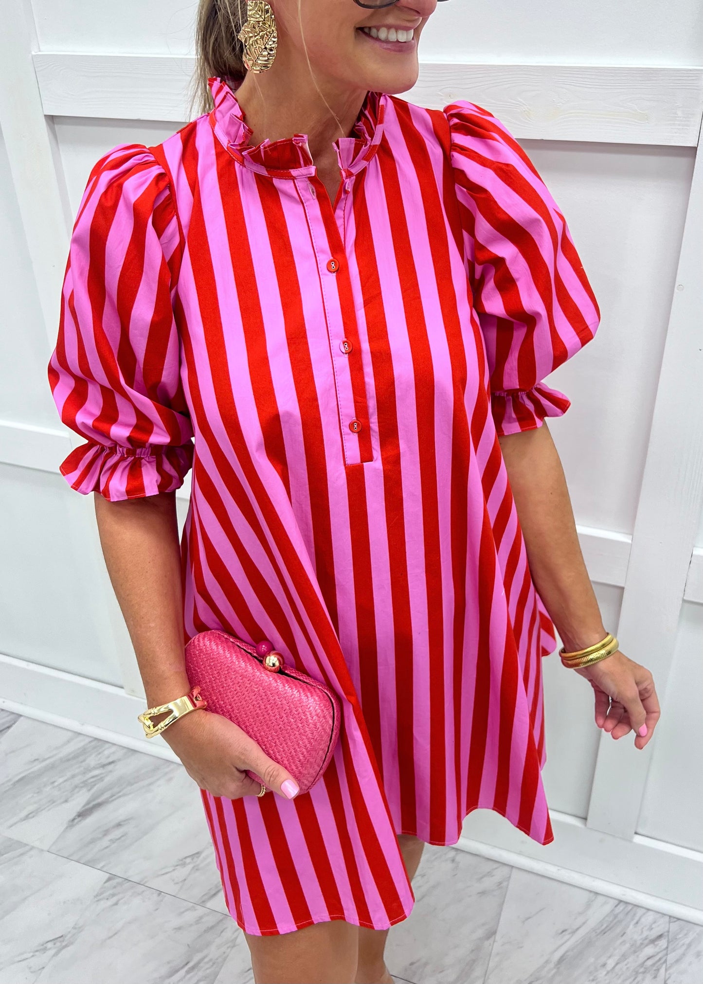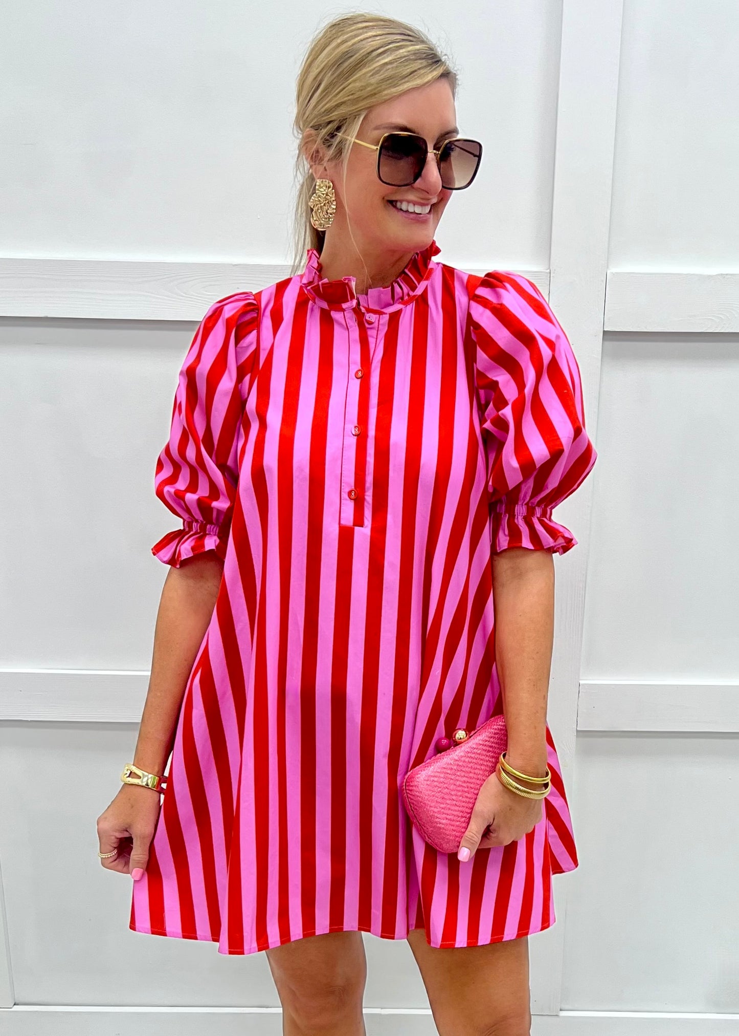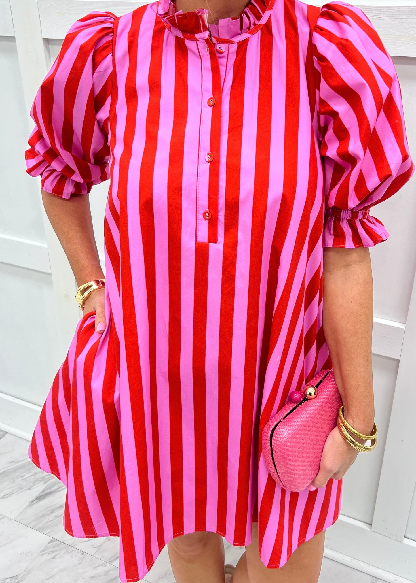 Stripes are always a good idea and this fun color mix will have you turning heads everywhere you go! Bright pink and red striped vertical woven fabric shapes this dress with a round ruffled neckline, 4 button closure, elbow length sleeves with elastic detail, side slit pockets, and a straight silhouette. The back has a drawstring at the waistband with self tie closure... so cute! This dress is fully lined. We can't get enough of this fun color combination! Model is 5'8'' and wearing a size small.