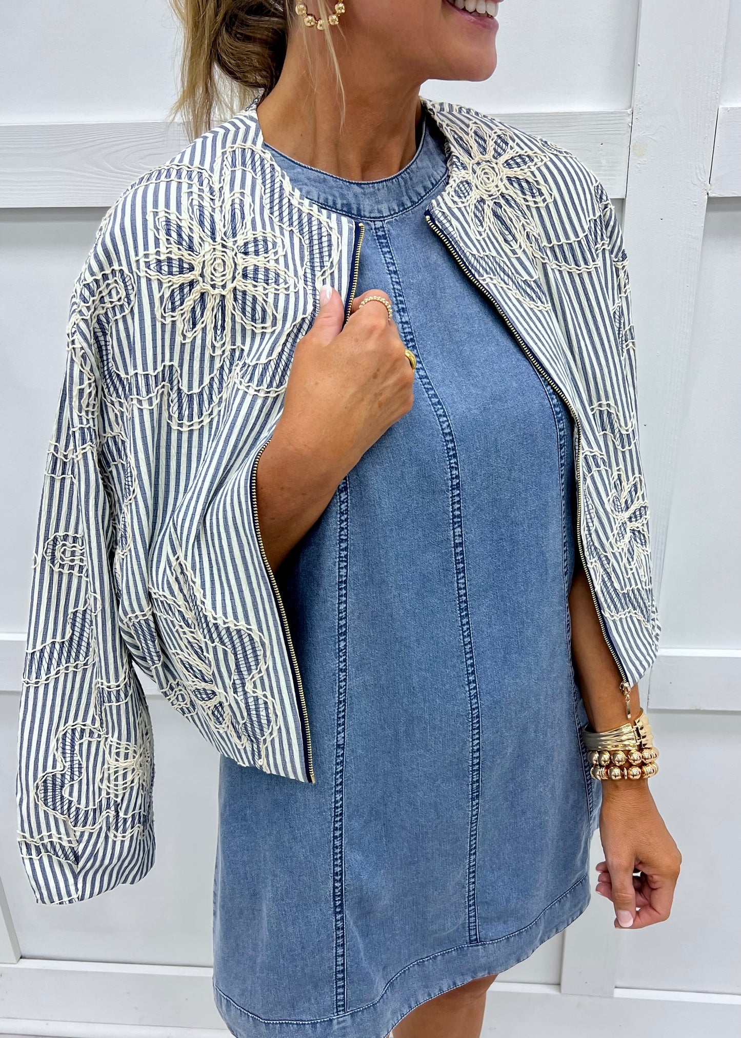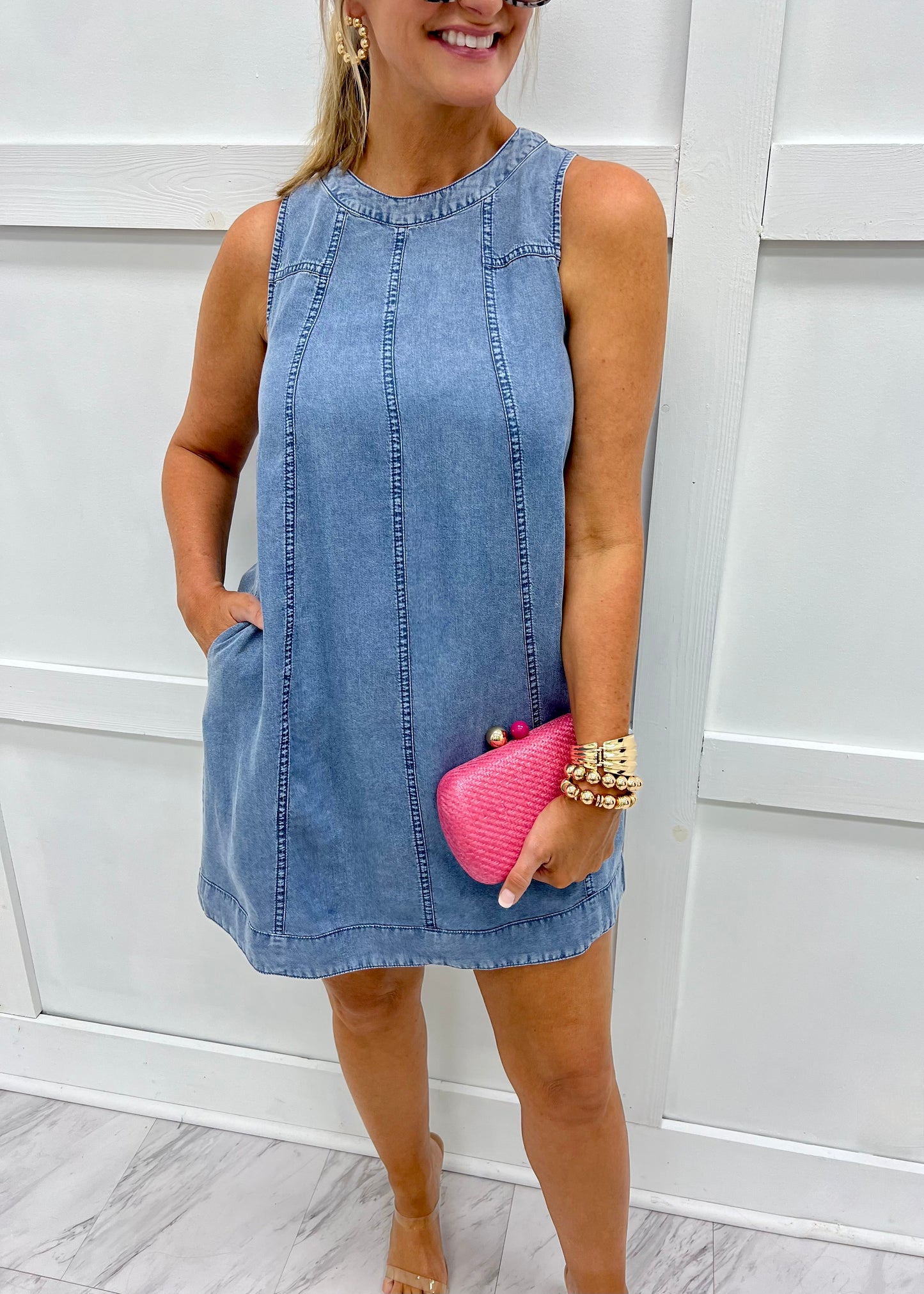 A little denim dress is always in style and our Montana Dress is perfect for adding your personal touch! Medium wash denim fabric shapes this dress featuring a round neckline, shift shape, seam detailing, side slit pockets and a relaxed fit. The back has a small keyhole + button closure at the neckline. This easy to wear style can take you from day to night with a quick change of shoes and accessories. You will be reaching for this one all of the time! Model is 5'8'' and wearing a size small.