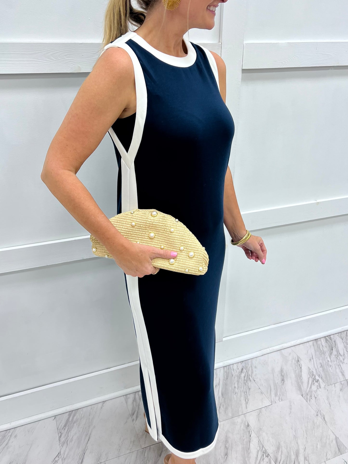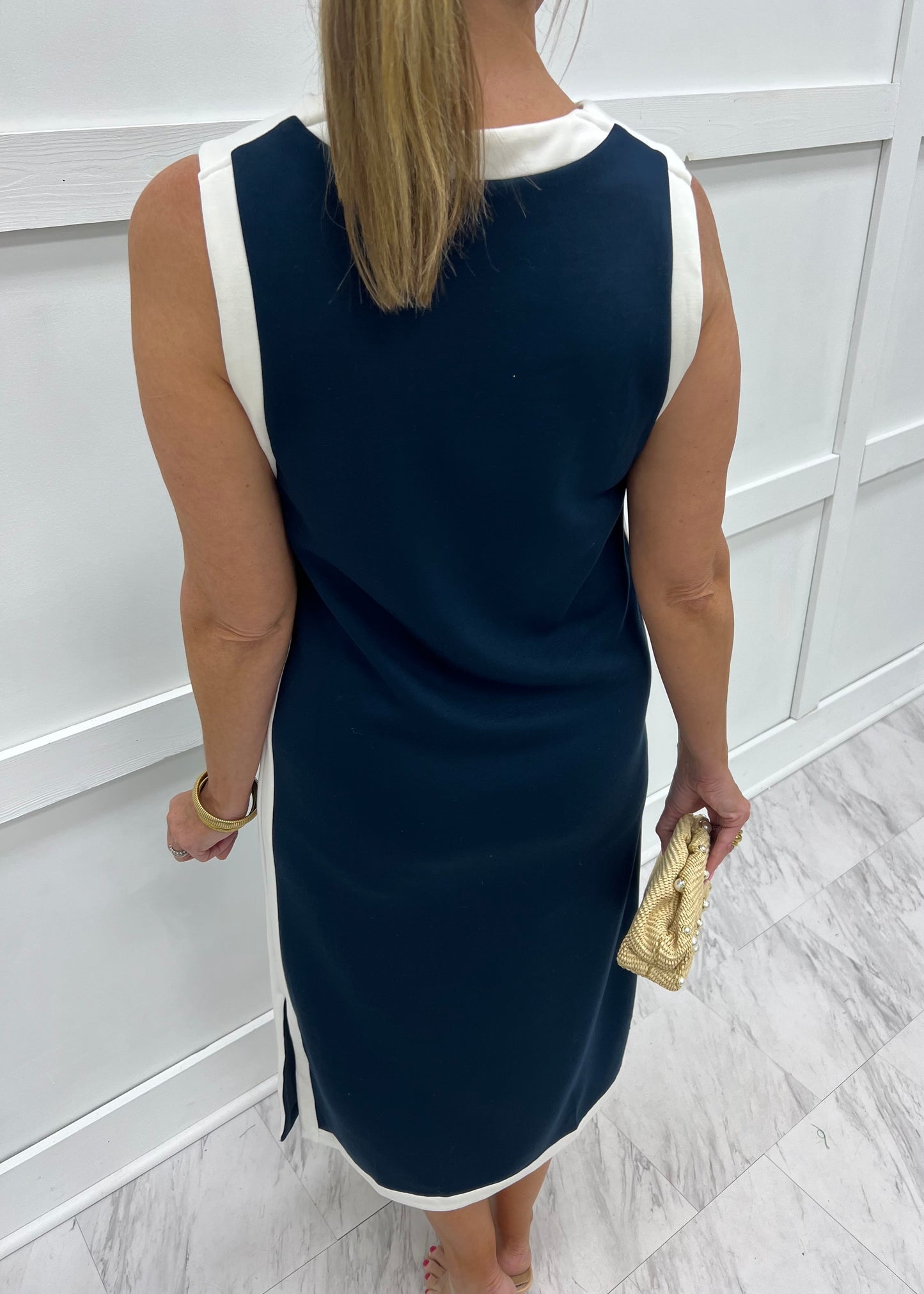 Basic but not boring... fall in love with our Naples Dress! Navy blue knit fabric, that feels like a dream, shapes this sleeveless dress with a round neckline, flattering stripe detailing down each side, a modesty piece under the arm openings, and a midi length with side vents. This dress is incredibly chic + incredibly comfortable... and just think of all the ways it can be styled! Model is 5'8'' and wearing a size small.