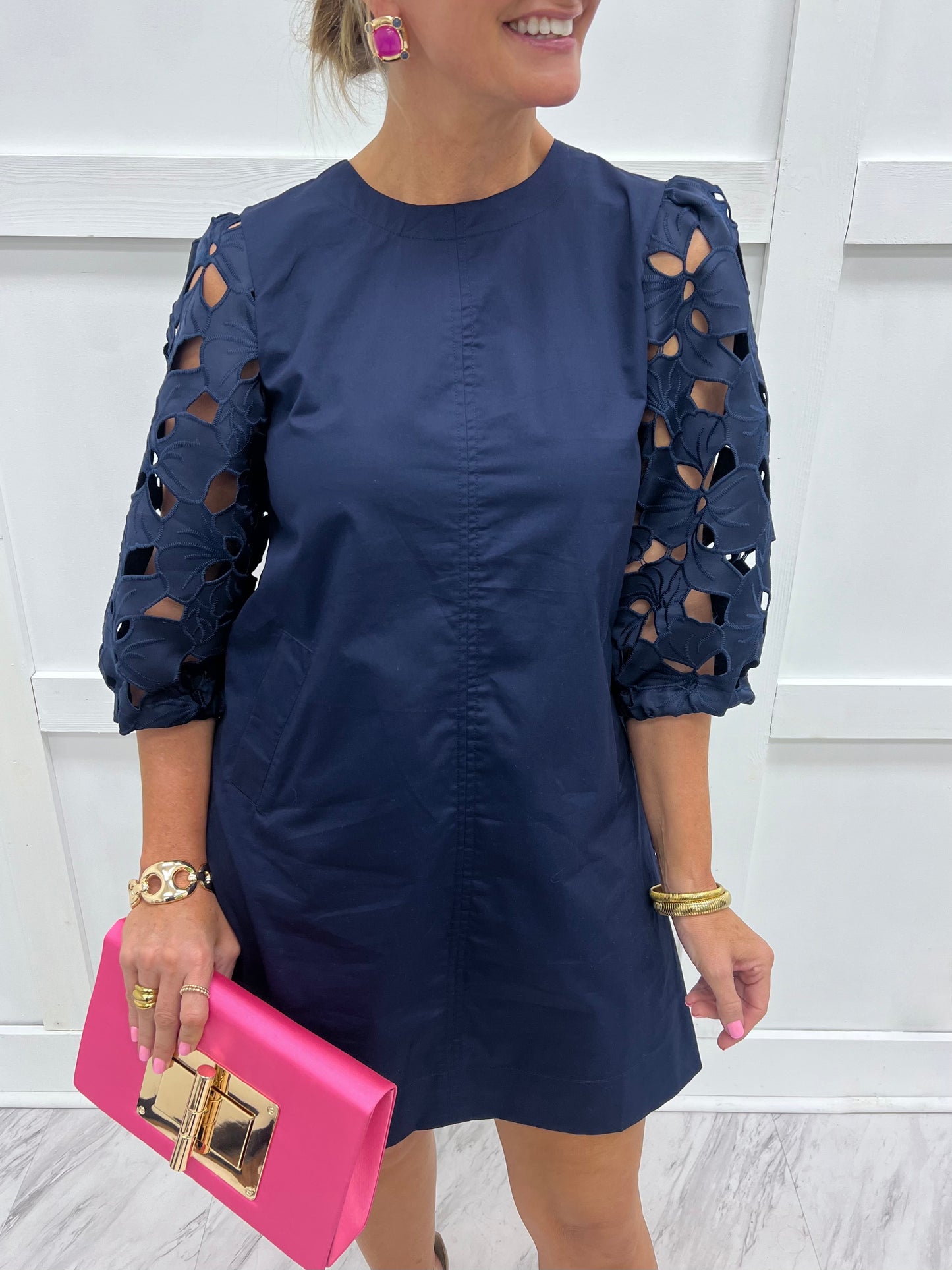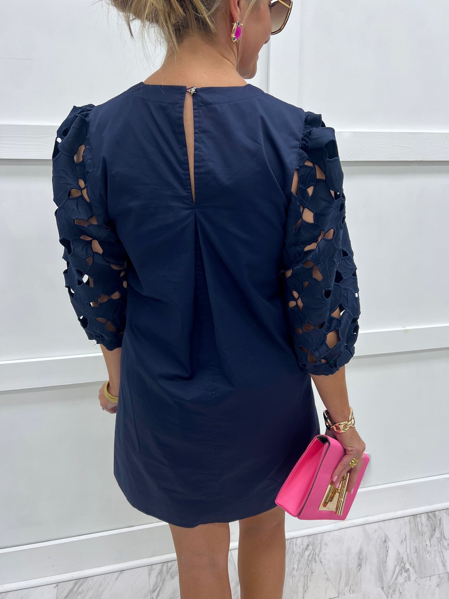 Turn heads in this timeless style! We love this extra chic take on this classic dress! Navy blue colored woven fabric shapes this dress featuring a round neckline, front slit pockets, a straight silhouette, and 3/4 length sleeves in a large scale eyelet fabric. The back has a small keyhole + button closure at the neckline and an inverted pleat detail. This one can be styled for so many occasions! Model is 5'8'' and wearing a size small.
