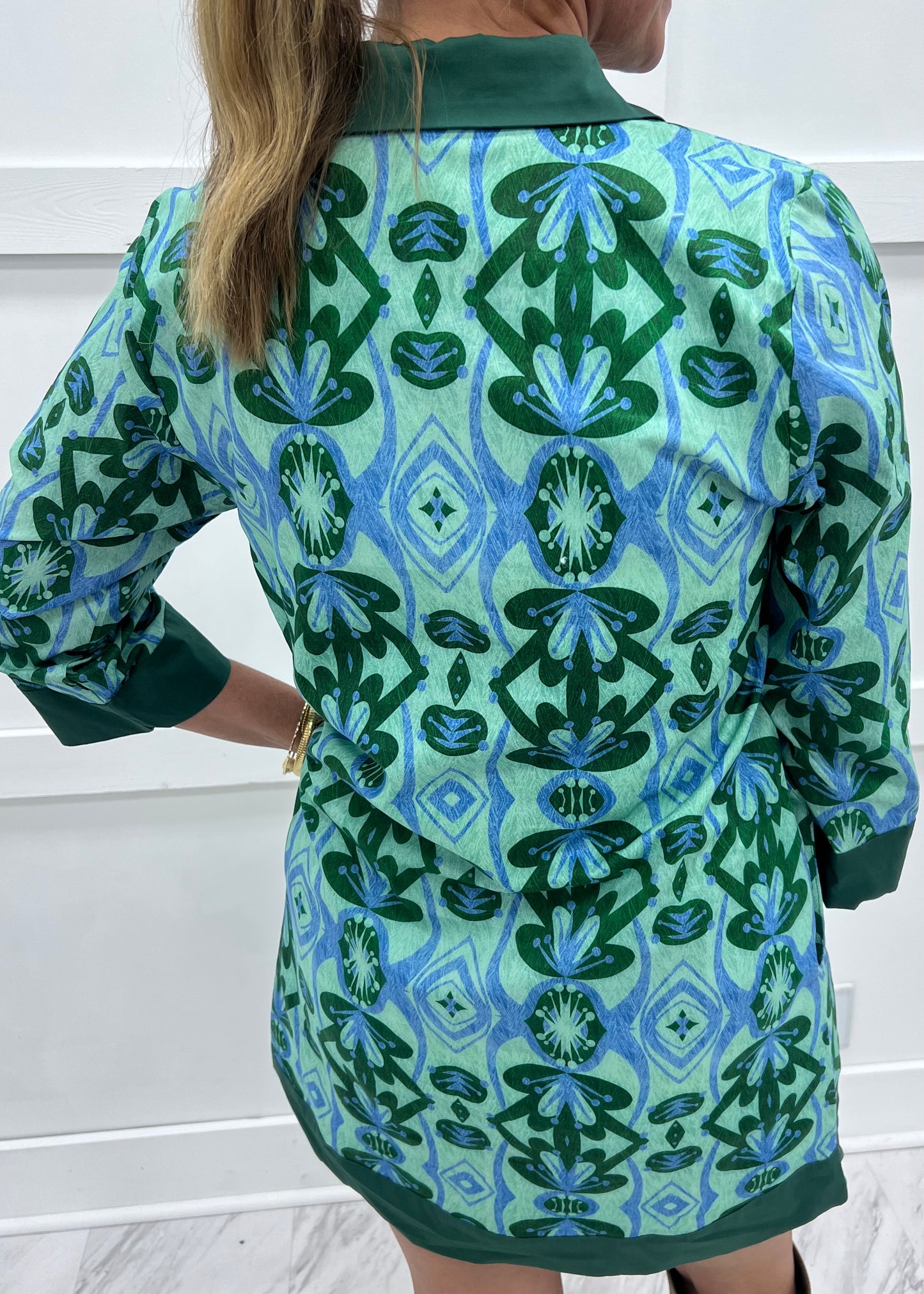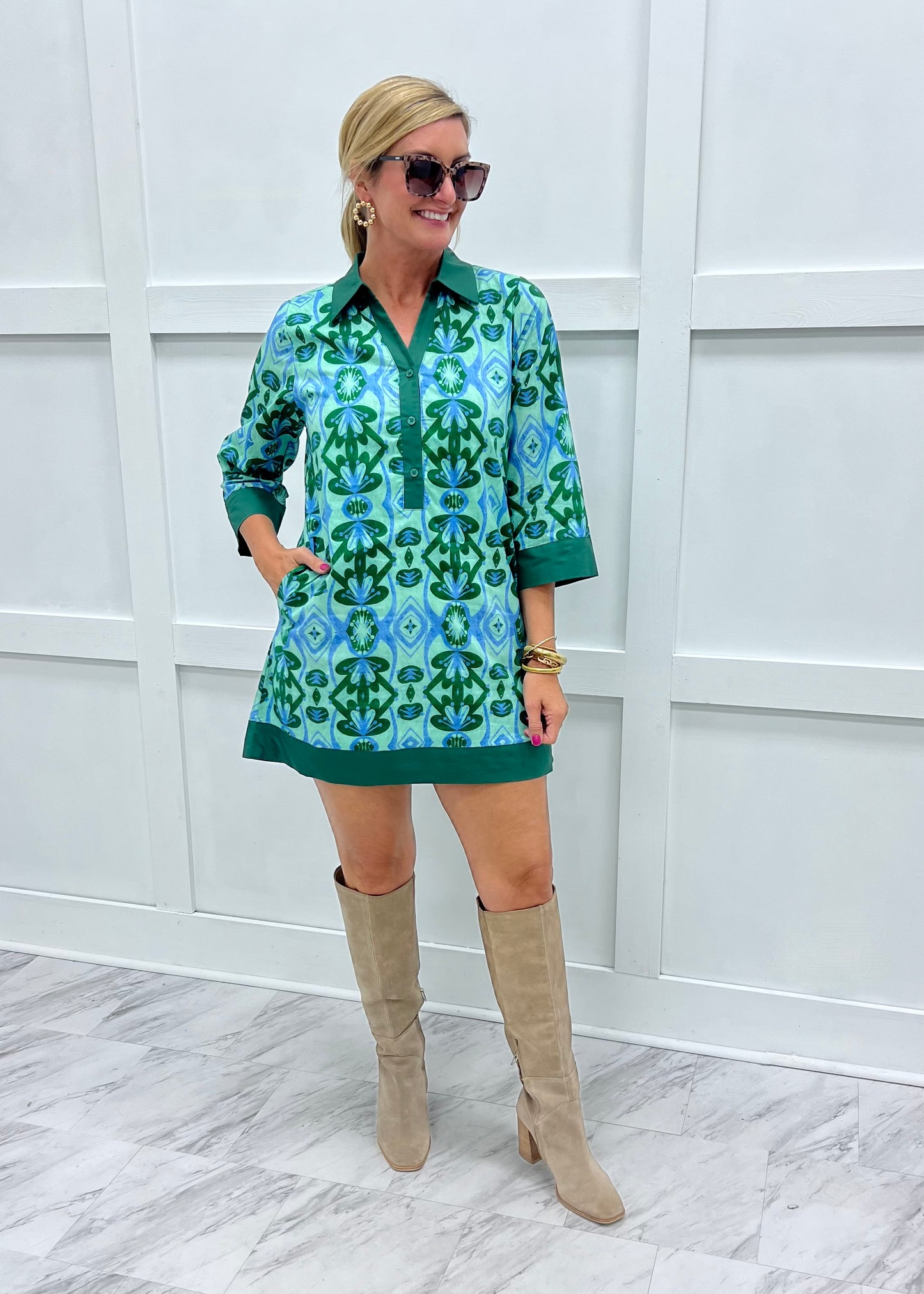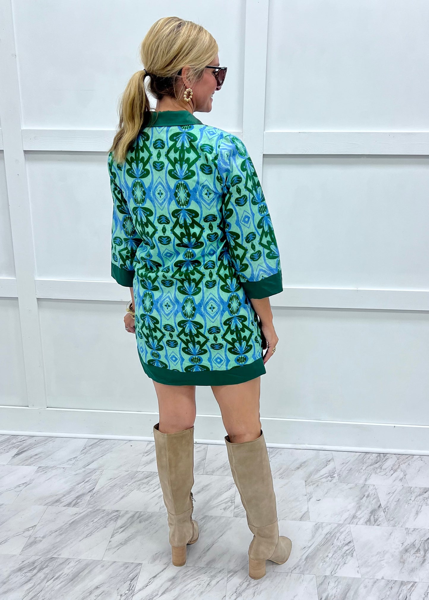 Spend the season in style... it's easy when you have this darling little dress hanging in your closet! A gorgeous print in shades of green and blue shapes this shirt style dress featuring a collar v.neckline, a 3 button front closure, invisible side pockets, 3/4 length sleeves and a solid green detailing at the collar, on the sleeves and hemline. This dress is lined and has a relaxed fit. This one is a showstopper! Model is 5'8'' and wearing a size small.