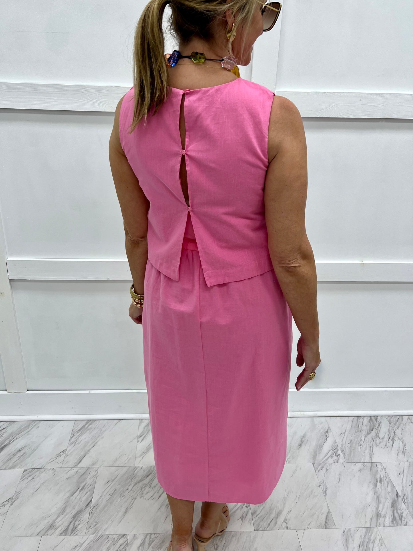 So much to love about this dress, the beautiful color, flattering silhouette and special details! This midi length dress in the prettiest shade of pink features a round neckline, elasticized waistline, side pockets and a straight skirt. The back has a three button closure and this style is fully lined. We love the unique shape of this dress and can't wait to style it with necklaces, scarves, and jackets! Model is 5'8" and wearing a size small.