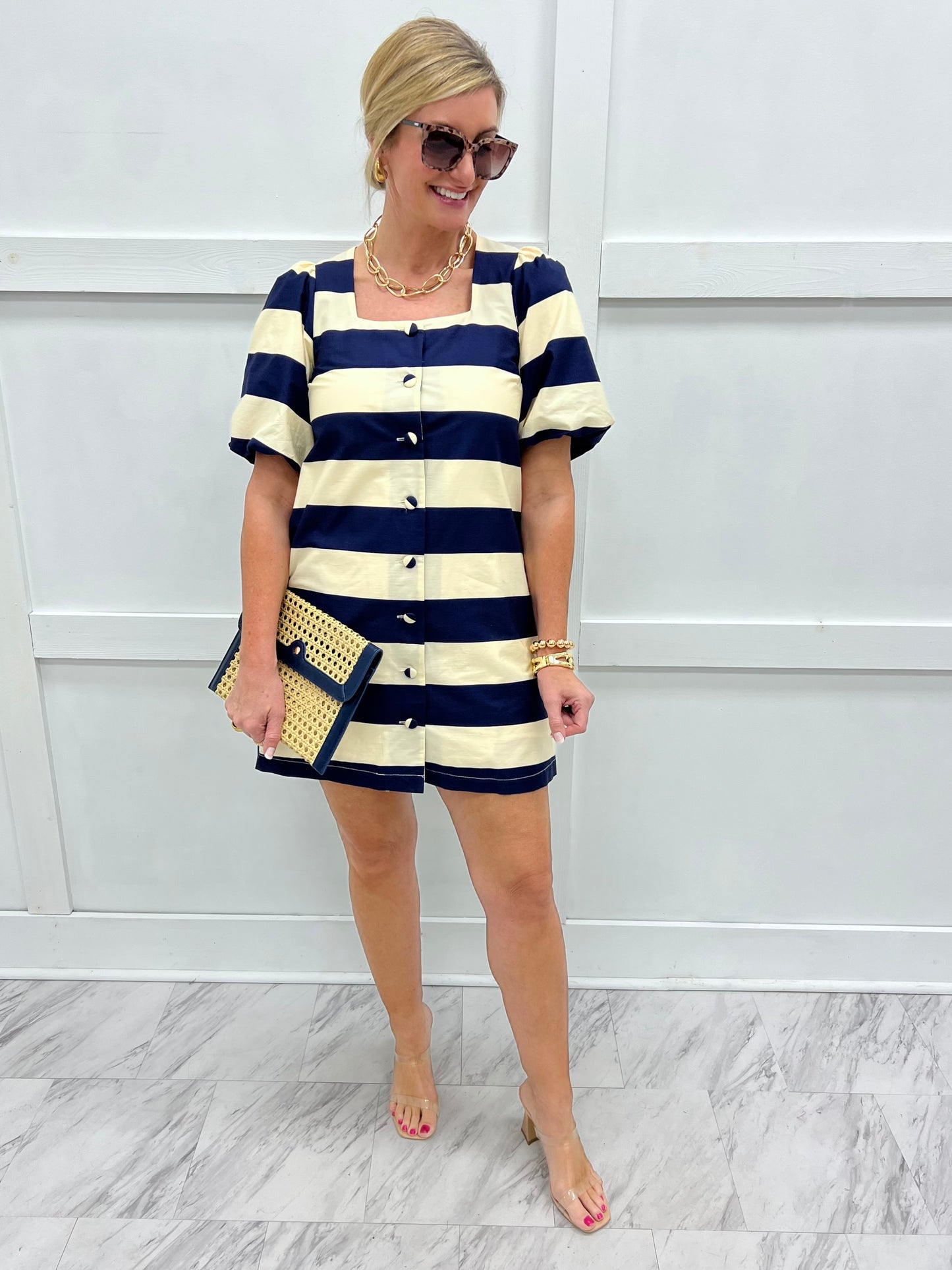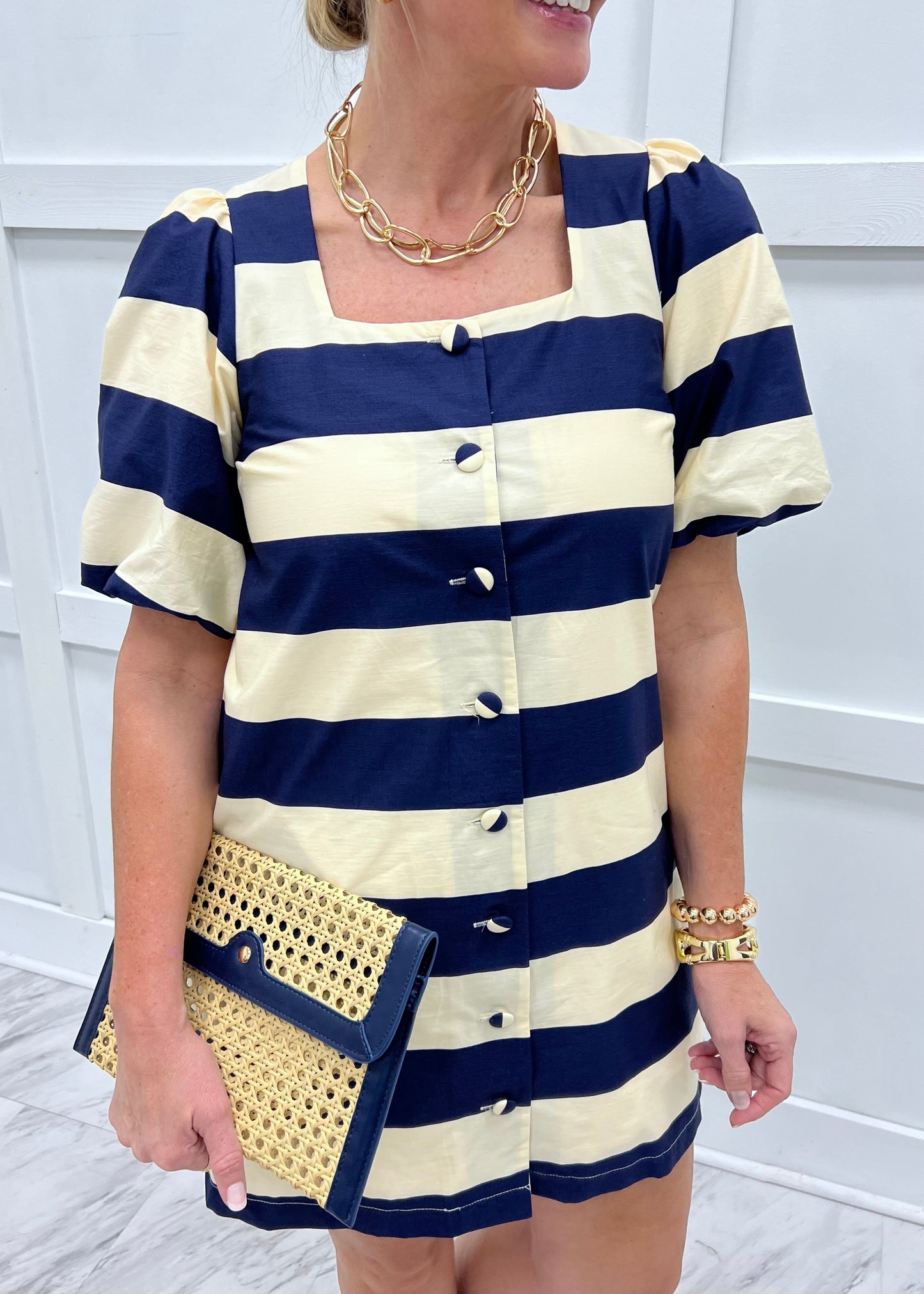 Like a sweet summer treat, this fun little dress is just what your wardrobe needs! Classic navy blue and ivory striped horizontal woven fabric shapes this dress with square neckline, short puff sleeves with elastic detail, side slit pockets, button front closure and a straight fit. This dress is fully lined. We can't get enough of this chic color combination! Model is 5'8'' and wearing a size small.