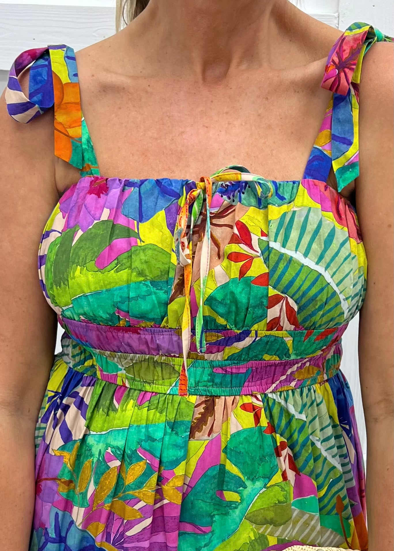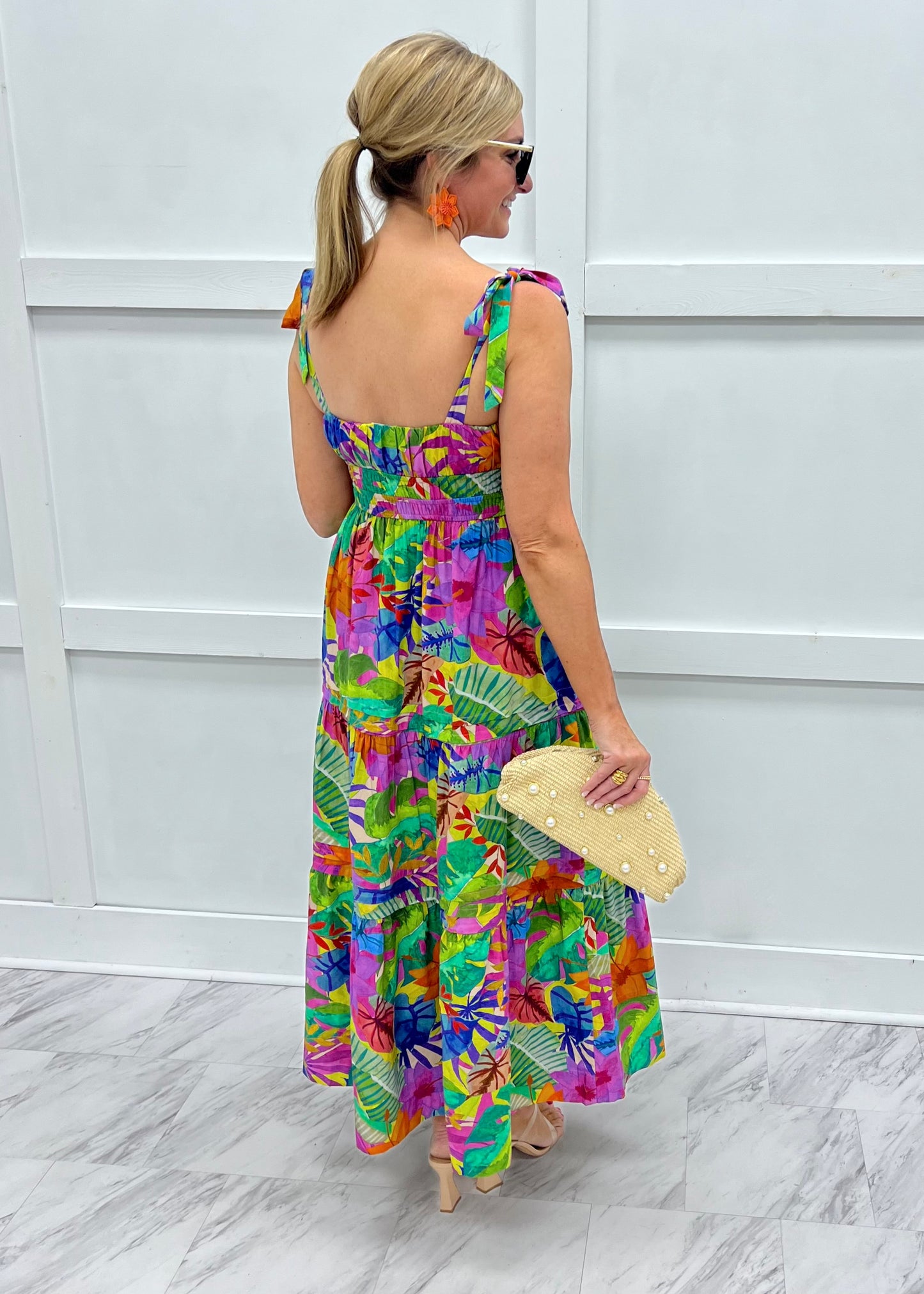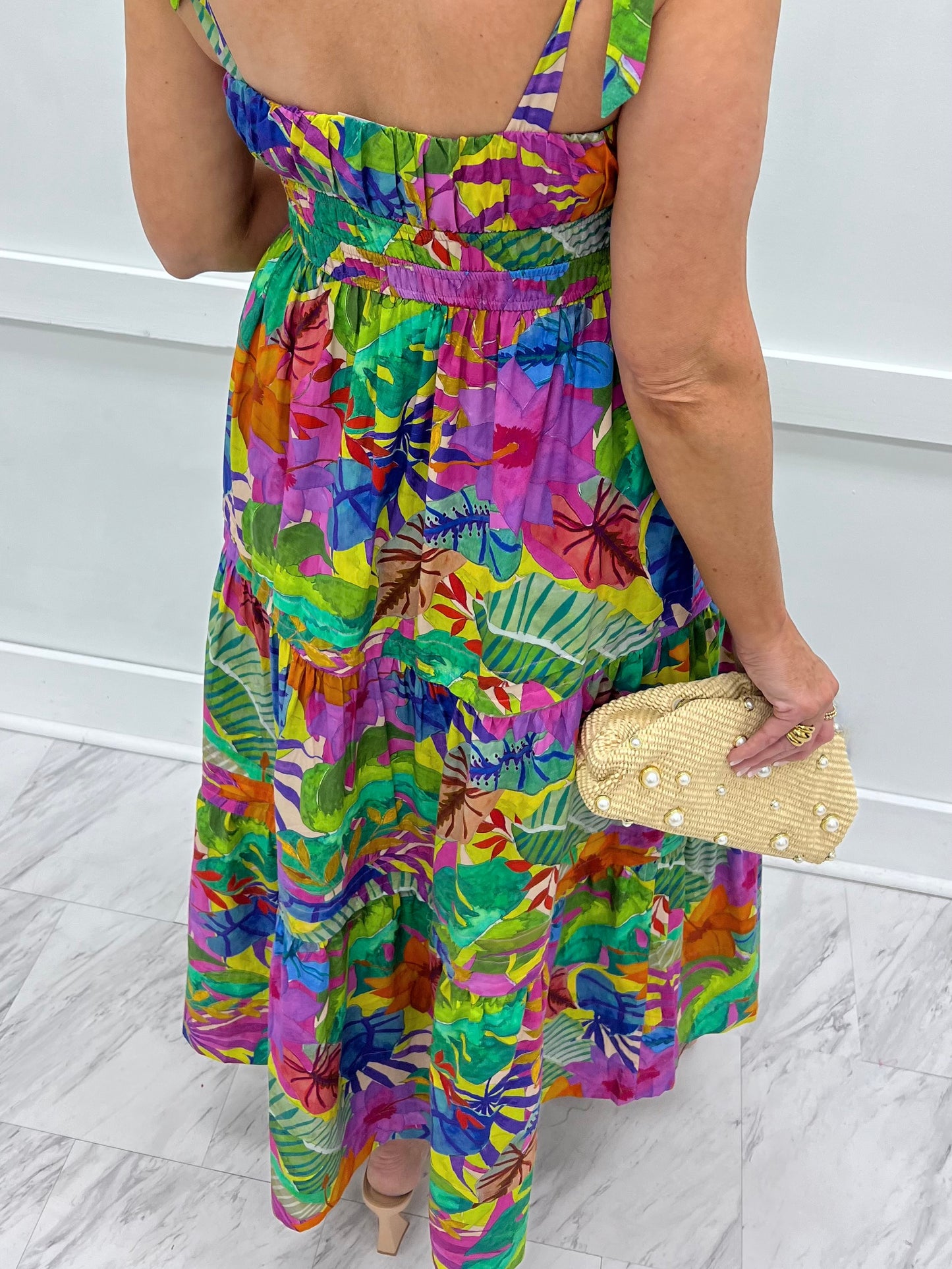 Get ready for warm weather fun fun in our Sunshine Rio Dress! This dress was made for warm nights spent celebrating with friends! Tropical floral print woven fabric in vibrant hues shapes this long dress featuring a pleated bust area with a small self tie bow, a double band of elastic underneath the bust, self tie straps at the shoulder and a tiered silhouette. This dress is lined through the seat and is just as comfortable as it is cute. Stand out in the crowd in this stunning dress! Model is 5'8'' and wearing a size small.