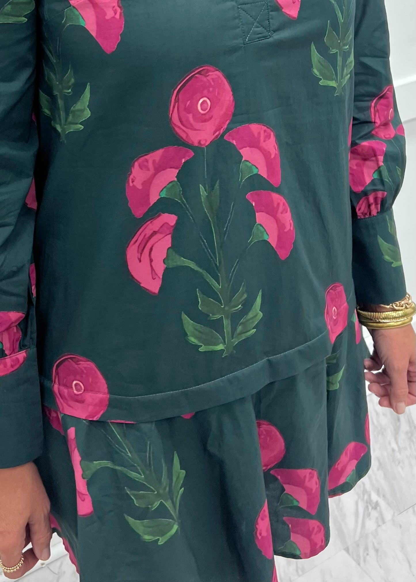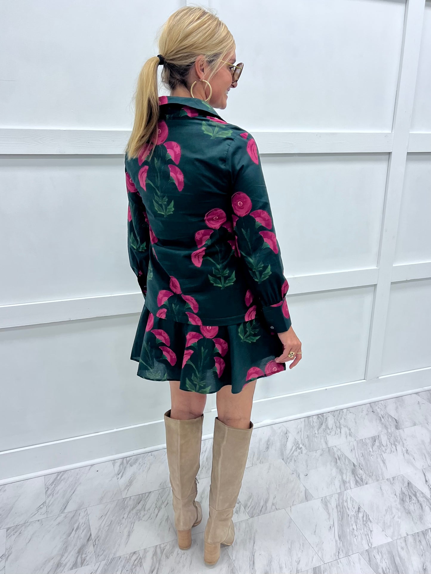 It will be love at first sight as soon as you slip on this pretty printed dress! This bold dress in the prettiest shade of dark green with a larger pink flower print shapes this dress featuring a collar v.neckline, long sleeves with 2 button closure at the wrists, side slit pockets, and a straight fit with flounce hemline. This dress is lined. Pair with boots for the perfect fall look! Model is 5'8'' and wearing a size small.