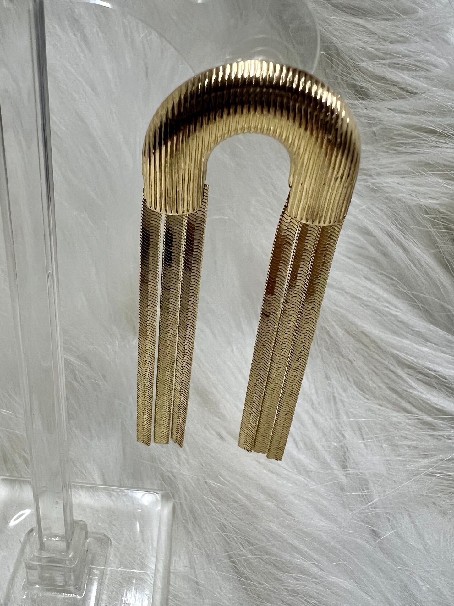 Chic, shiny and right on trend! These earrings are just what your jewelry box has been missing! Textured gold and gold snake chain shape this lightweight pair with post back closure. These earrings will take any look to the next level!
