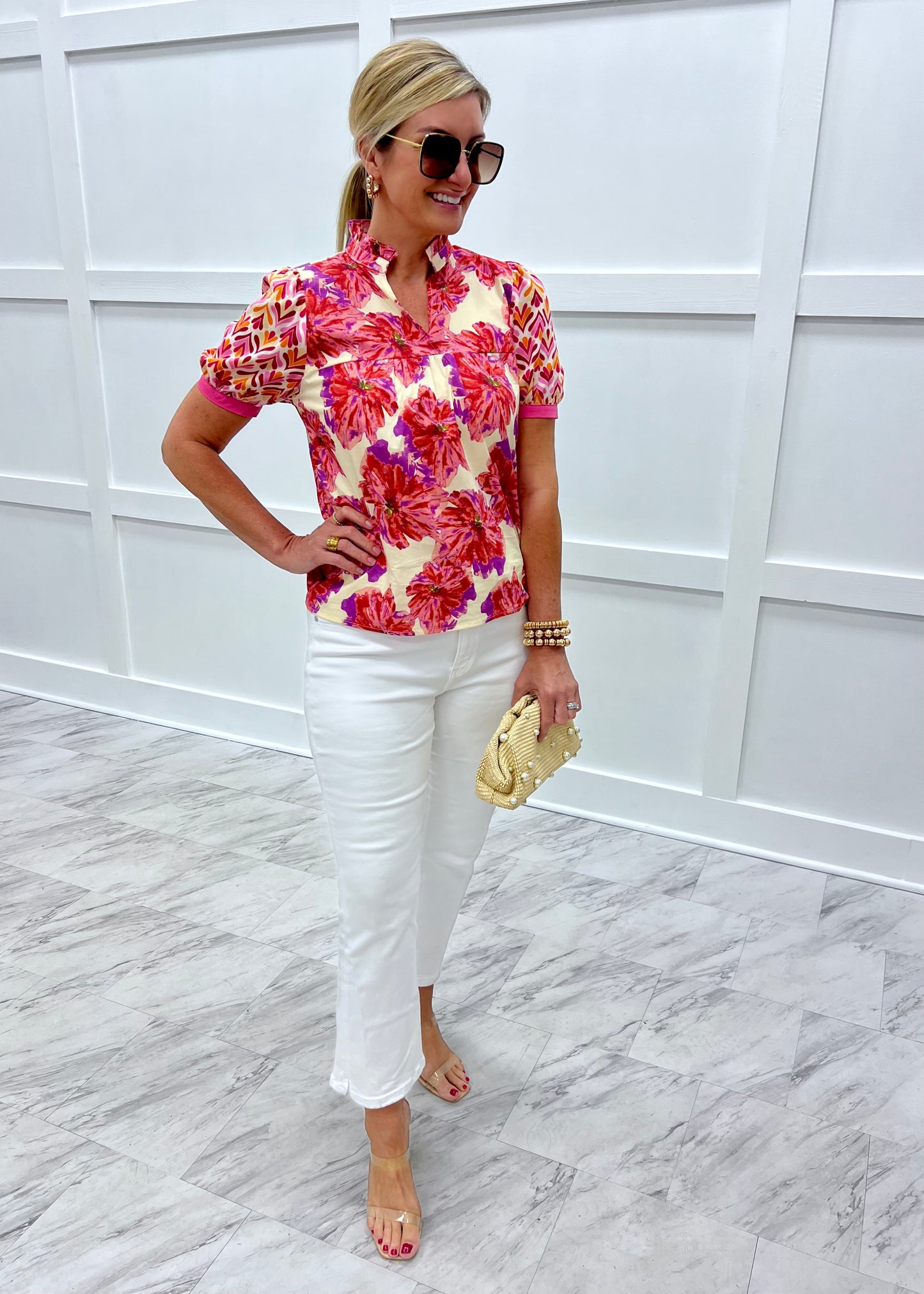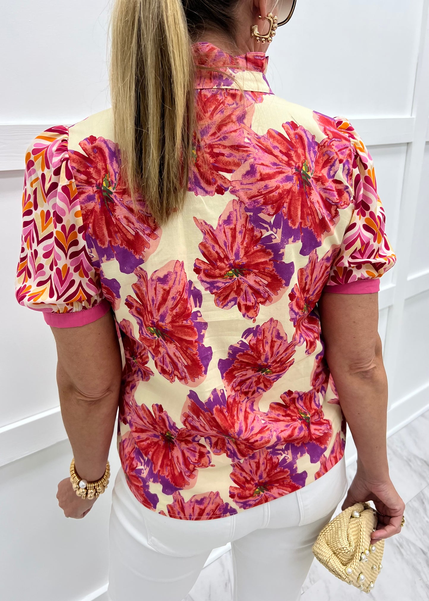 Be bold and stand out in the crowd in this mixed print top! Step out in style in this top adorned with two standout fabrics, one abstract design and one large scale floral print - featuring a v.neckline with ruffle detail along the collar, short sleeves with banded detail in solid pink, and a relaxed fit. This top is so unique, we love it paired with denim, fun earring and cute sandals! Model is 5'8'' and wearing a size small.