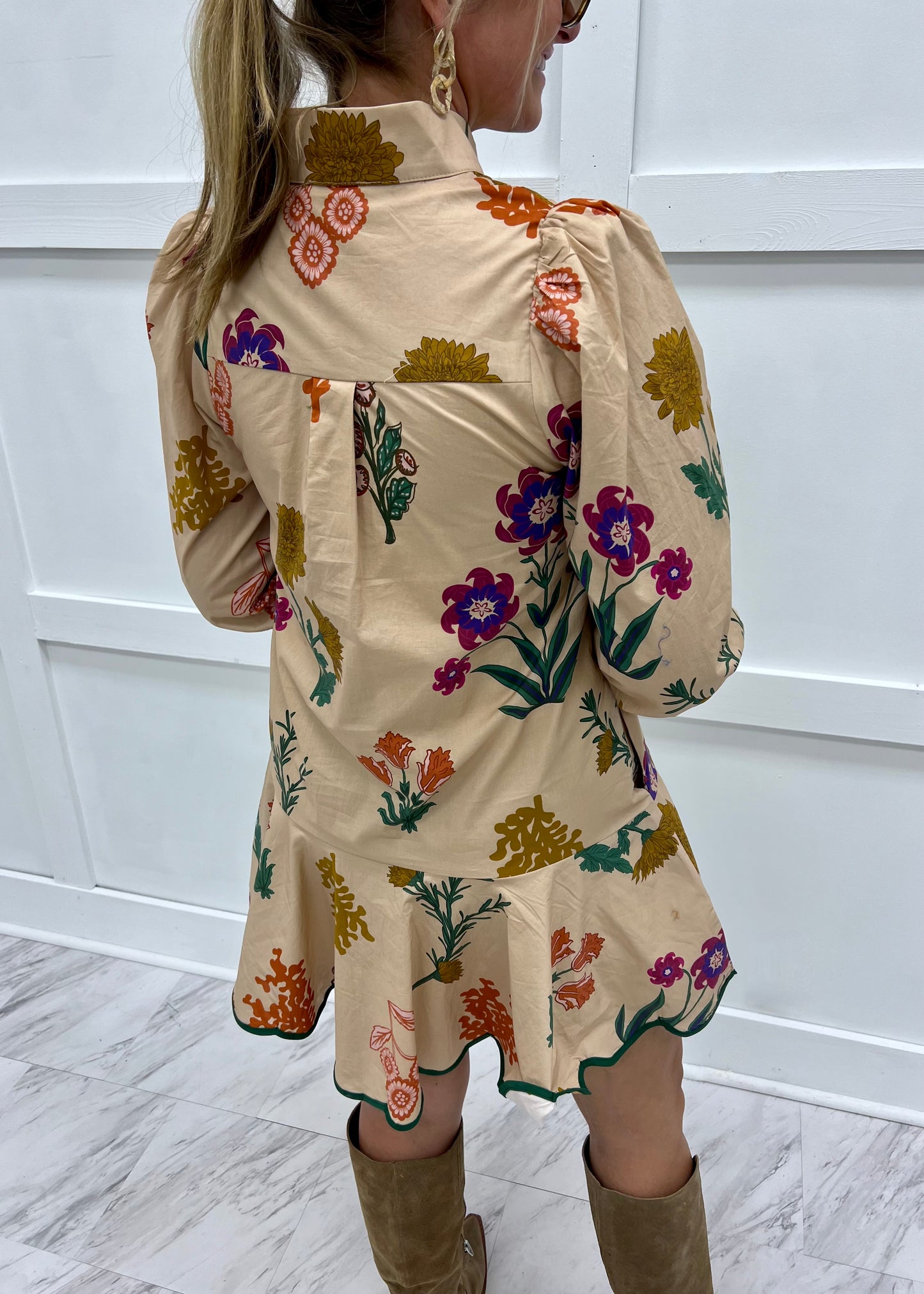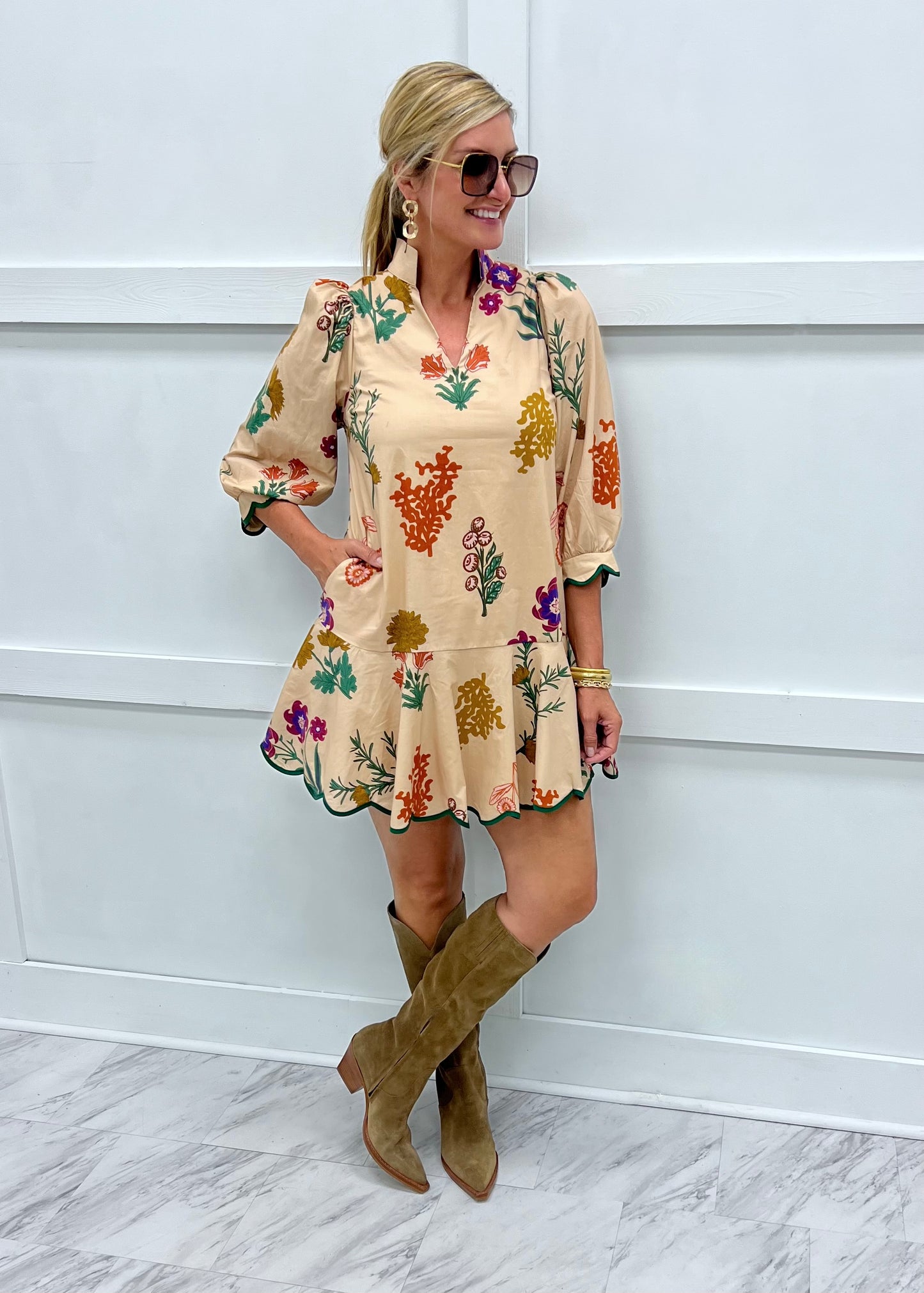 When you want your look to stand out in the crowd, throw on our Golden Bloom Dress and bring on the compliments! Beige colored woven fabric with a bright colored floral print shapes this dress featuring a v.neckline, 3/4 length sleeves with dark green scallop detailing, side slit pockets and a flounce hemline with scallop trim. This dress is lined. This chic dress pairs perfectly with sandals, boots or heels and gold accessories. We love this unique yet classic style! Model is 5'8'' and wearing a size small.