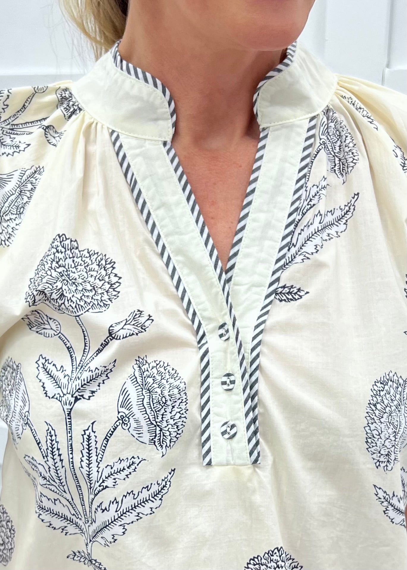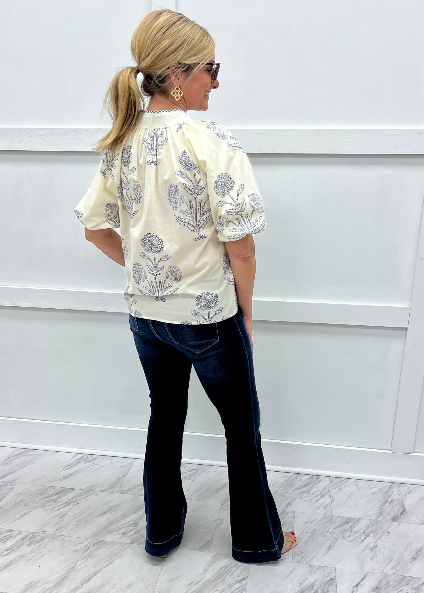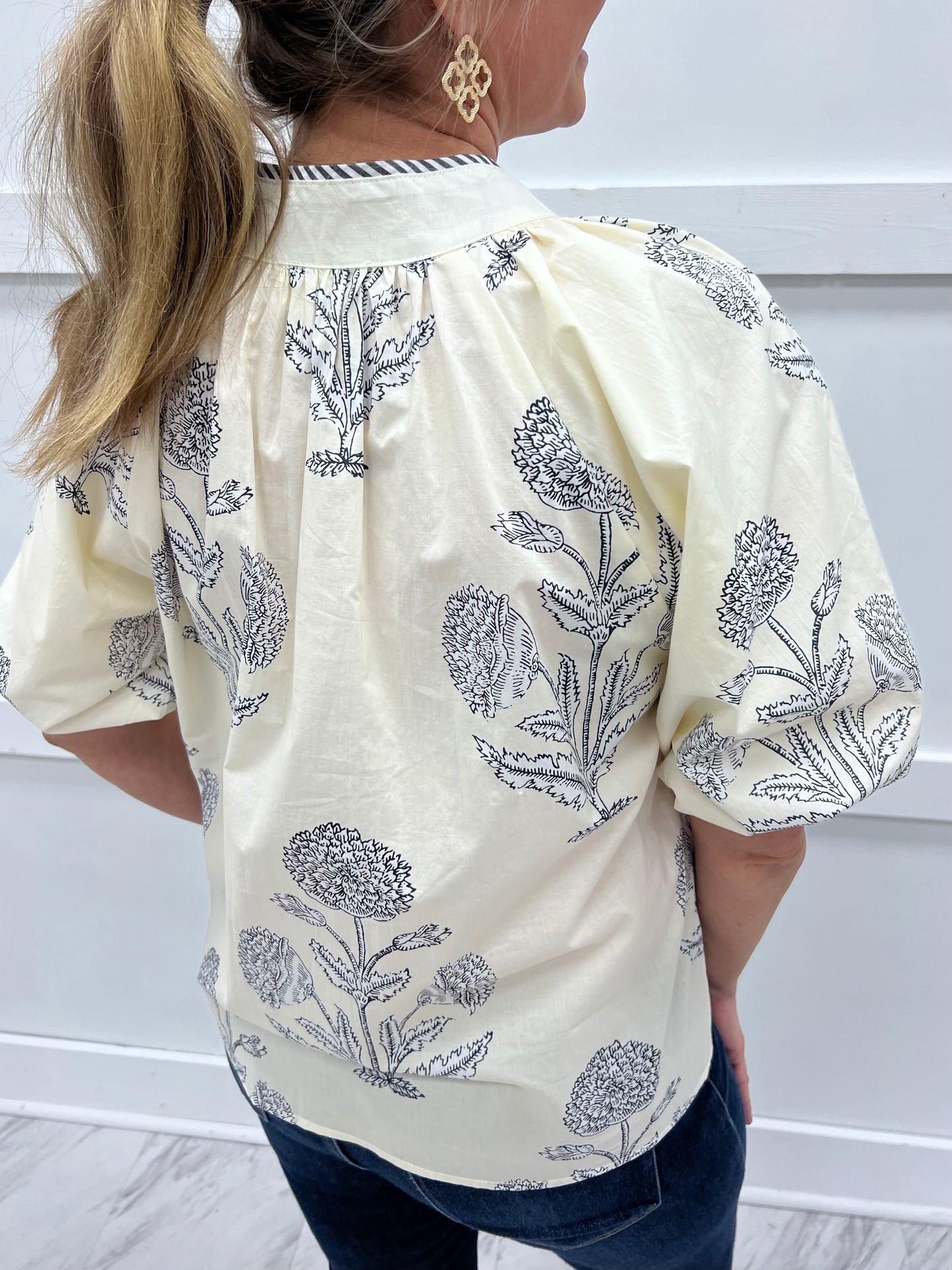 Your statement style gets a fresh update with our Rowan Top. Ivory colored woven fabric with a navy blue floral print shapes this top featuring a v.neckline with 3 button closure + stripe detailing, short puff sleeves and a relaxed fit. Style this one with denim or trousers, heels or flats, throw a chic jacket over your shoulders... the styling options are endless! Model is 5'8'' and wearing a size small.