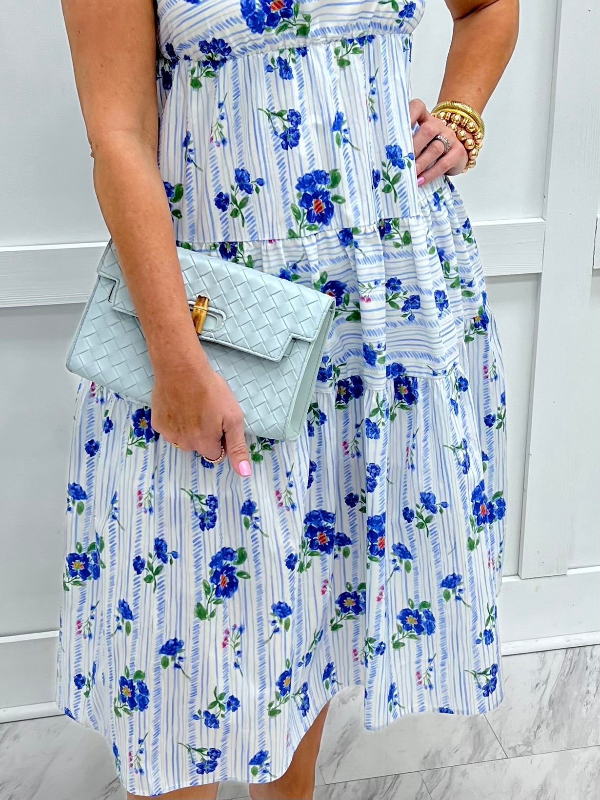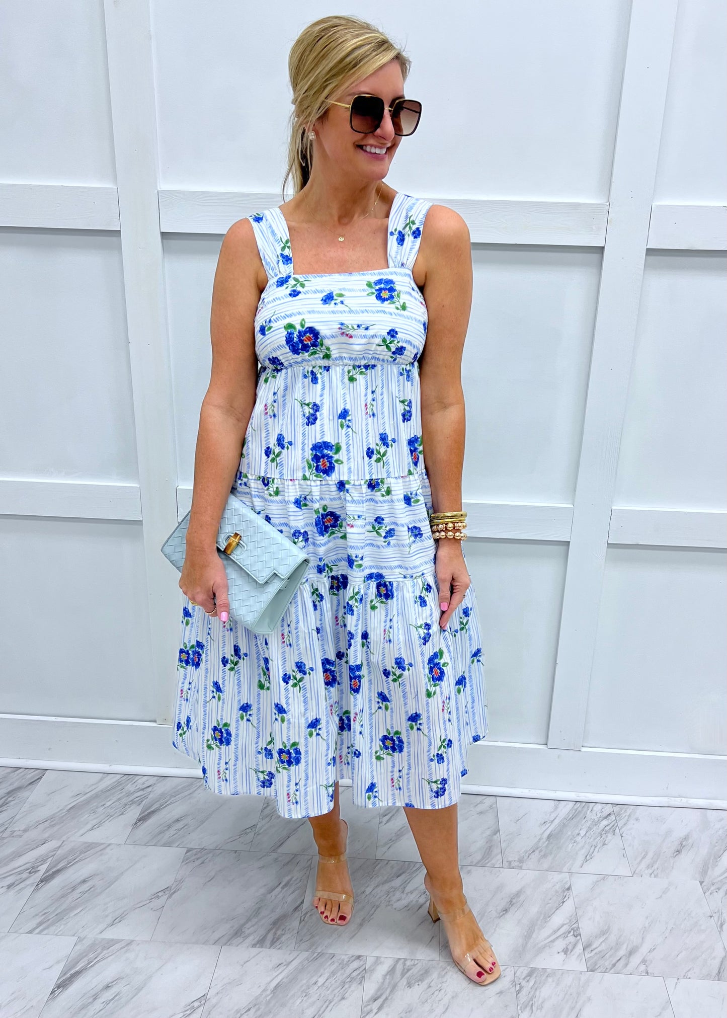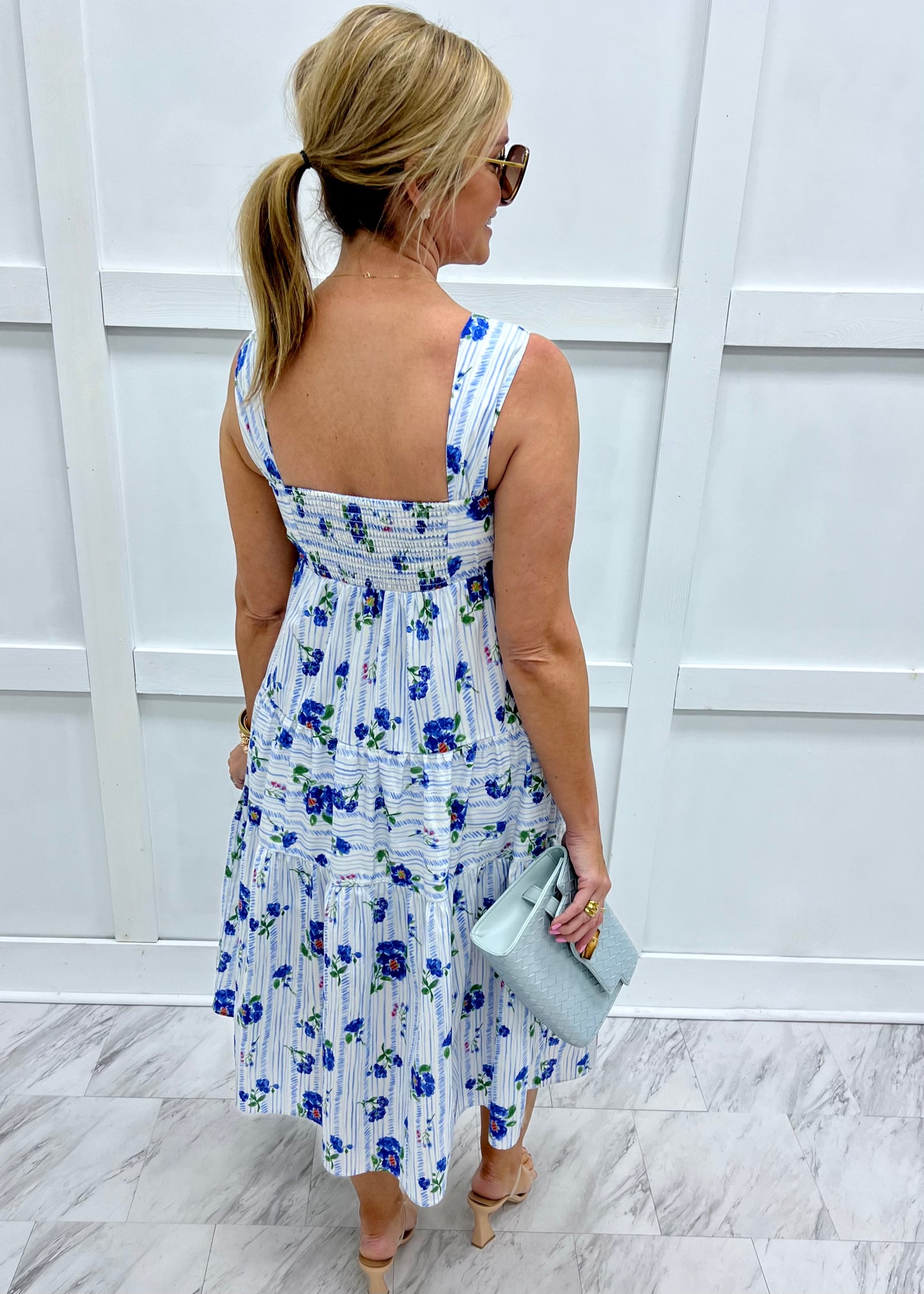 So much to love about this dress, the beautiful colors flattering silhouette and special details! This midi length dress in the prettiest floral print fabric features a square neckline, wide shoulder straps, a tiered skirt and a panel of smocking at the back to allow for a great fit. This one is just as comfortable as it is cute and we can't wait to wear it for all of the upcoming events! Dress is lined through the seat. Model is 5'8" and wearing a size small.