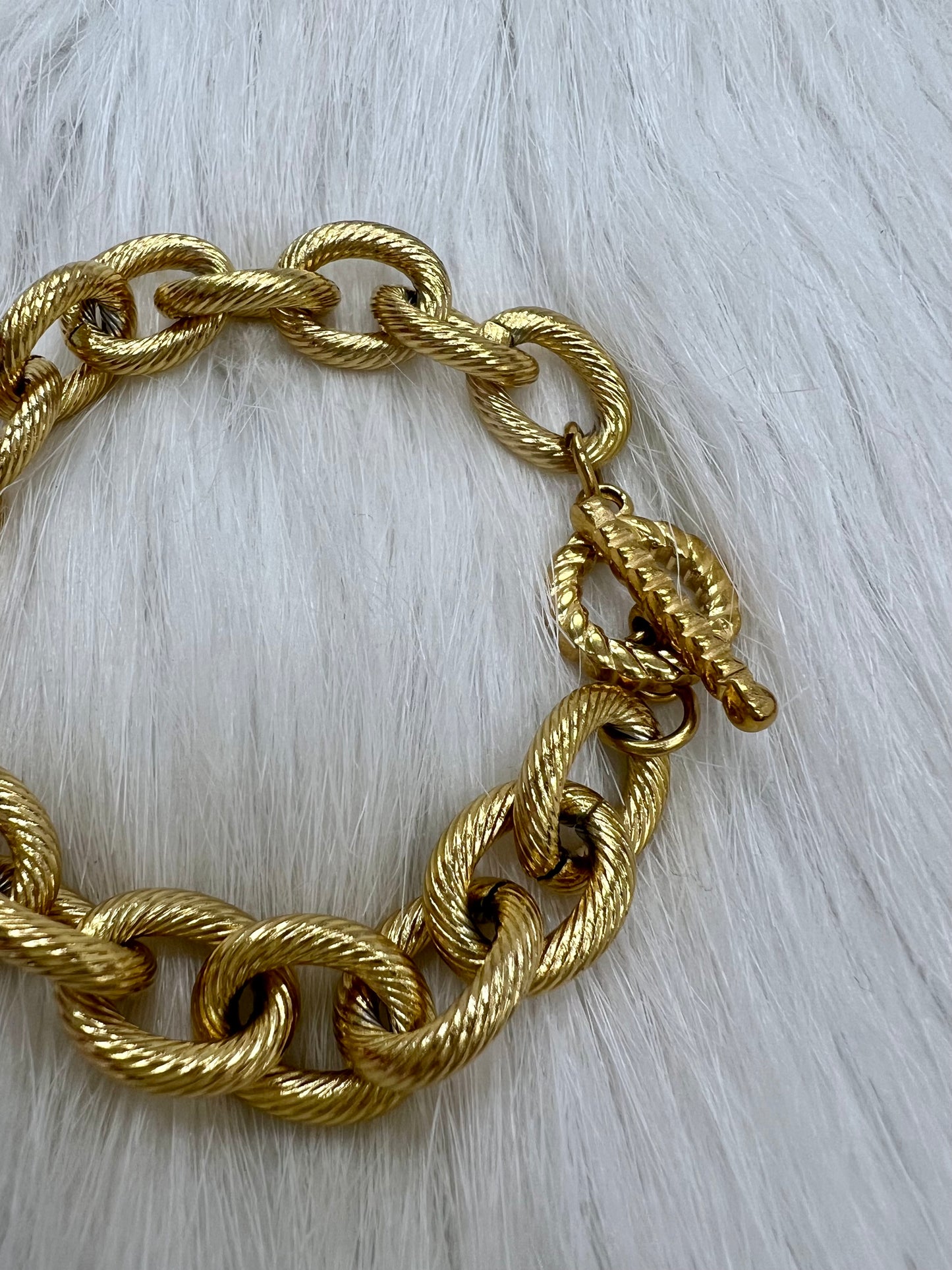 Show off your signature style with our Charleston Bracelet. This stunning piece is shaped of textured gold links and a toggle closure.. Embellish your wardrobe with this modern classic!