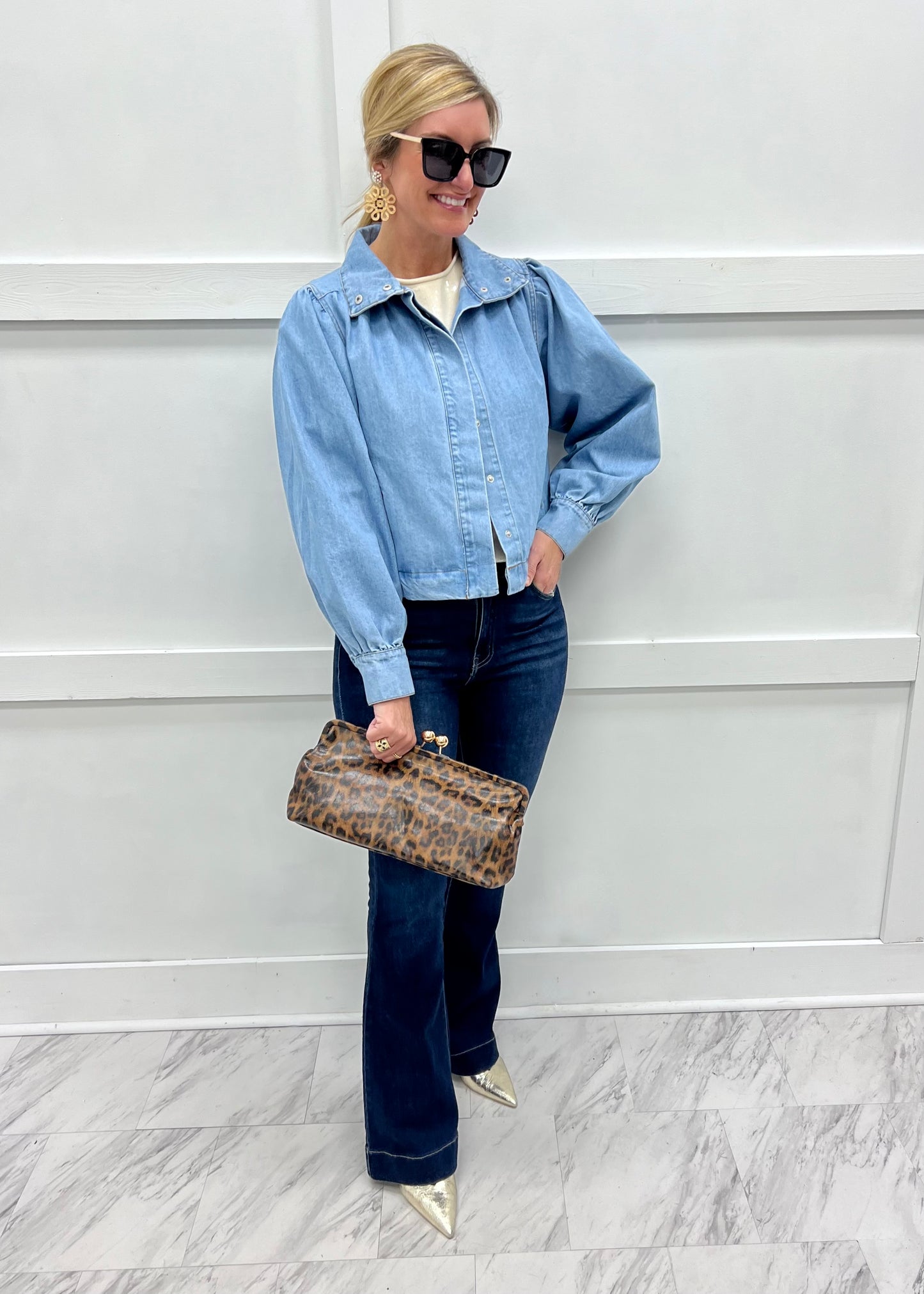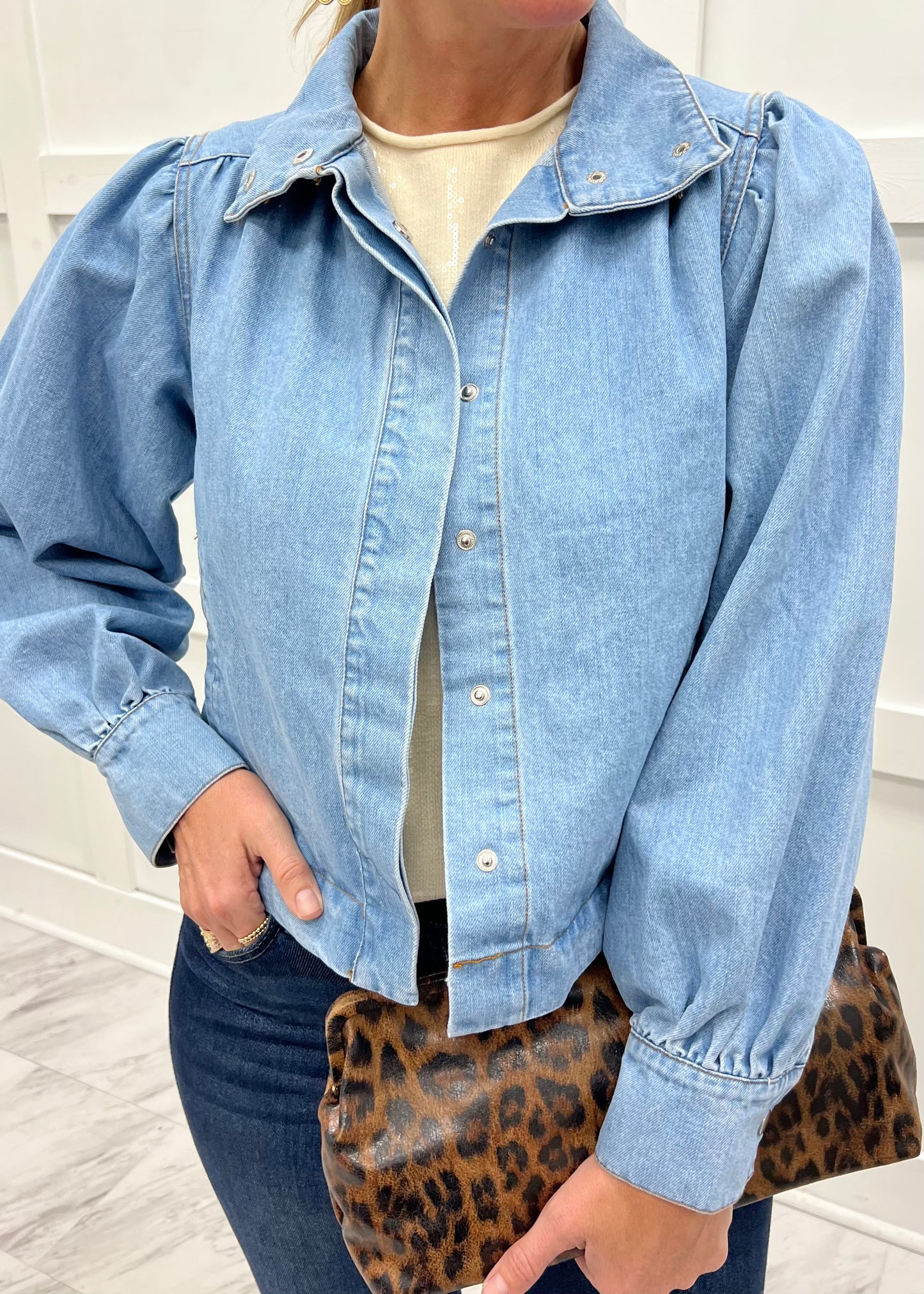 Update your go to jacket with this denim style that is right on trend! Soft, lighter weight denim fabric in a light wash shapes this denim jacket featuring a collar neckline, snap front closure, front pockets, and long sleeves with snap detailing at the wrists. This jacket has a chic looser fit with pleat detailing in the back. This easy to wear style looks great with just about everything and we can't wait to wear style it for every season! Model is 5'8'' and wearing a size small.