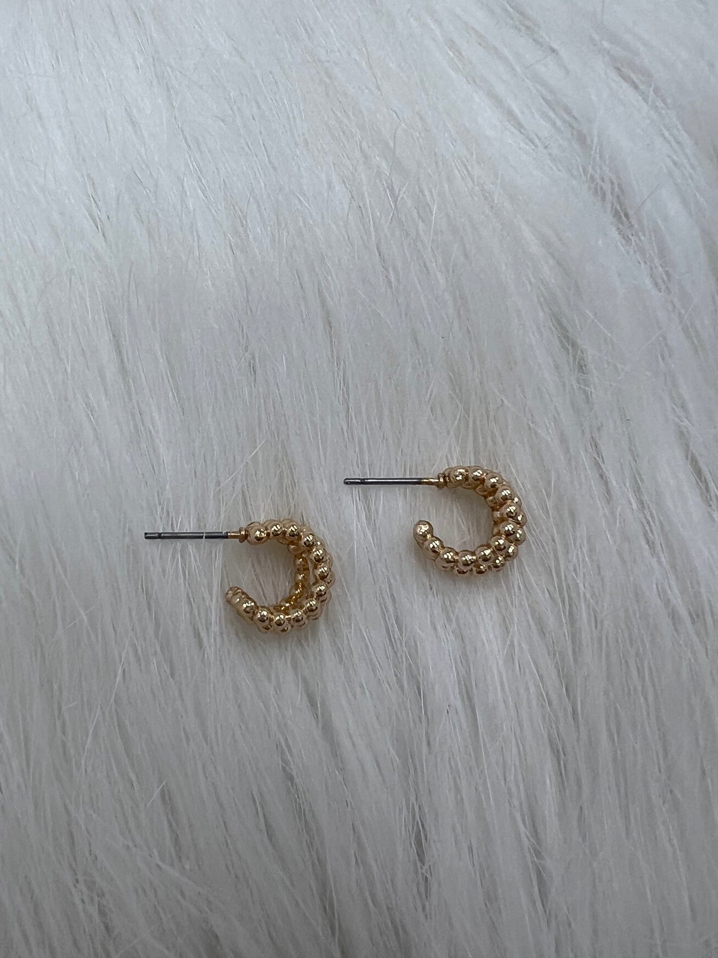 A simple update on classic hoop earrings takes this pair to next level chic. Shiny gold shapes this small pair of hoops with three rows of textured gold balls. These are sure to be a jewelry box favorite!