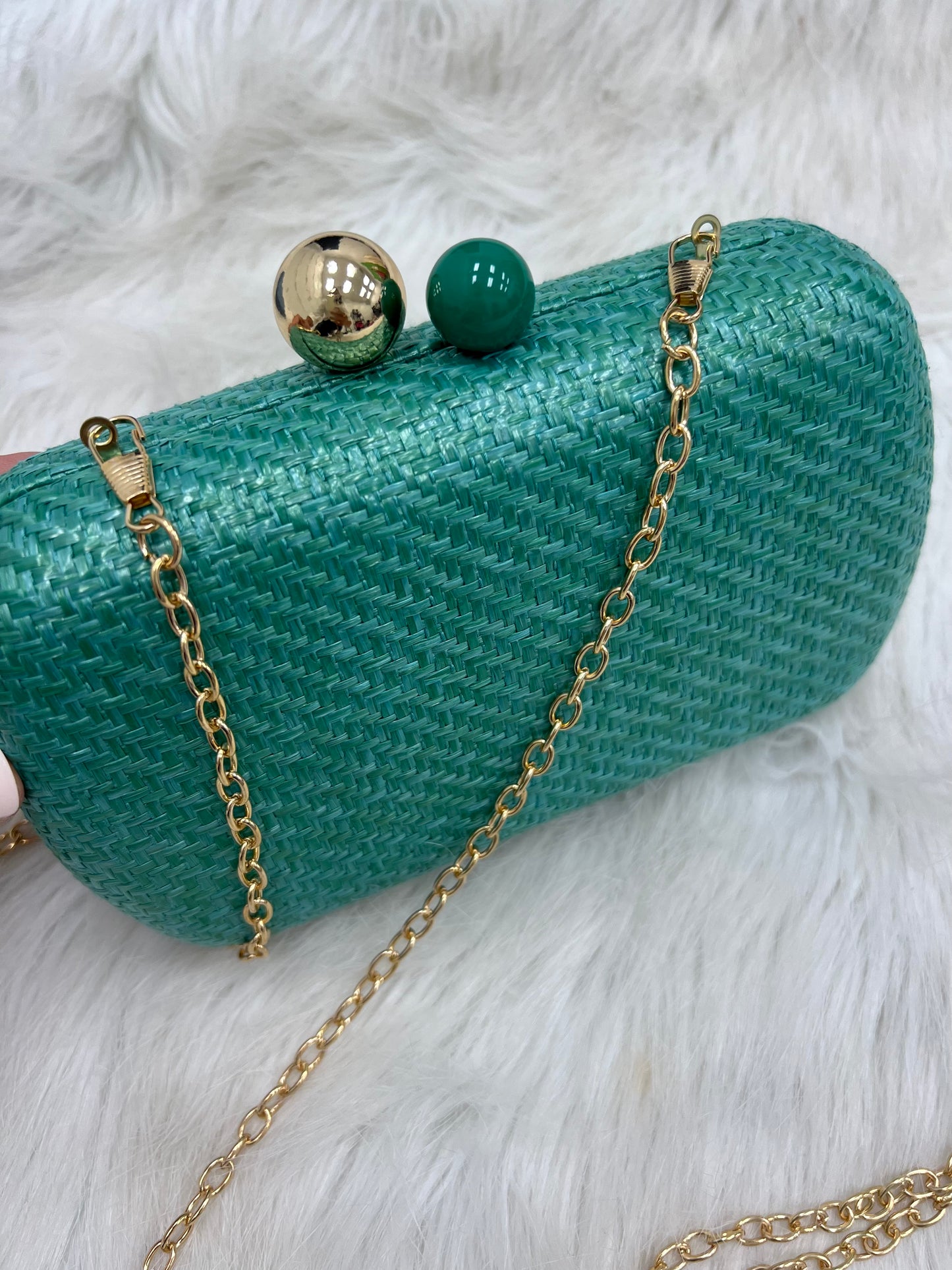 Meet your new favorite clutch, our cheerful, Carmen Clutch! This hard, oval shaped clutch is made from a sturdy woven material in either blue, green, beige or pink with one gold and one colored ball on top, used as a secure push lock closure. With its dainty detachable cross-body chain, you can opt to wear it hands-free, adding some extra versatility to your style. This bag is sure to compliment your unique look!
