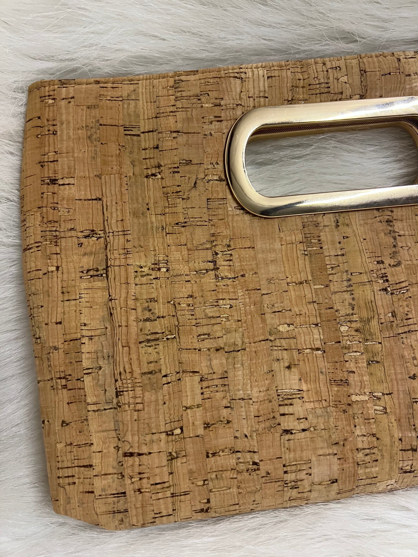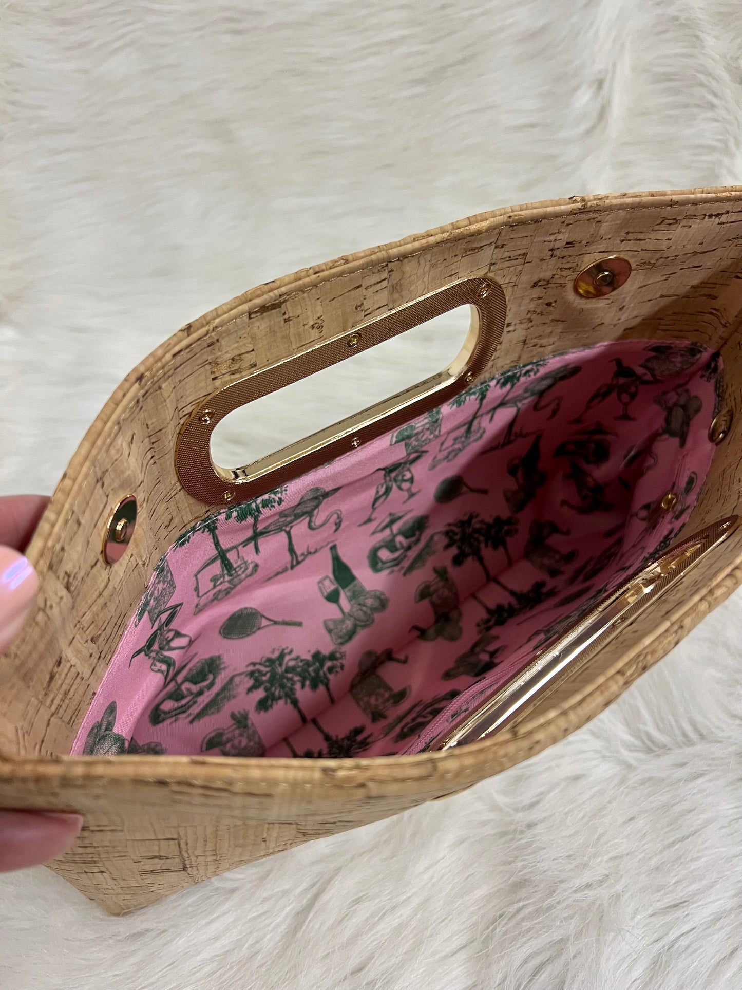 Upgrade any look with the addition of this chic clutch! Cork material shapes this clutch with a cutout handle trimmed in gold, double magnetic snap closure and a removable gold chain. This Clutch Charleston Bag has a pink + green interior lining in a print inspired by Charleston. This style is sure to compliment your wardrobe!