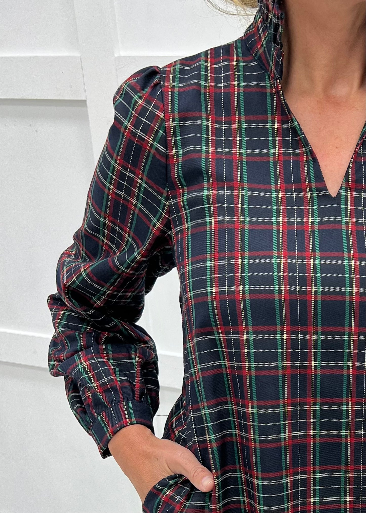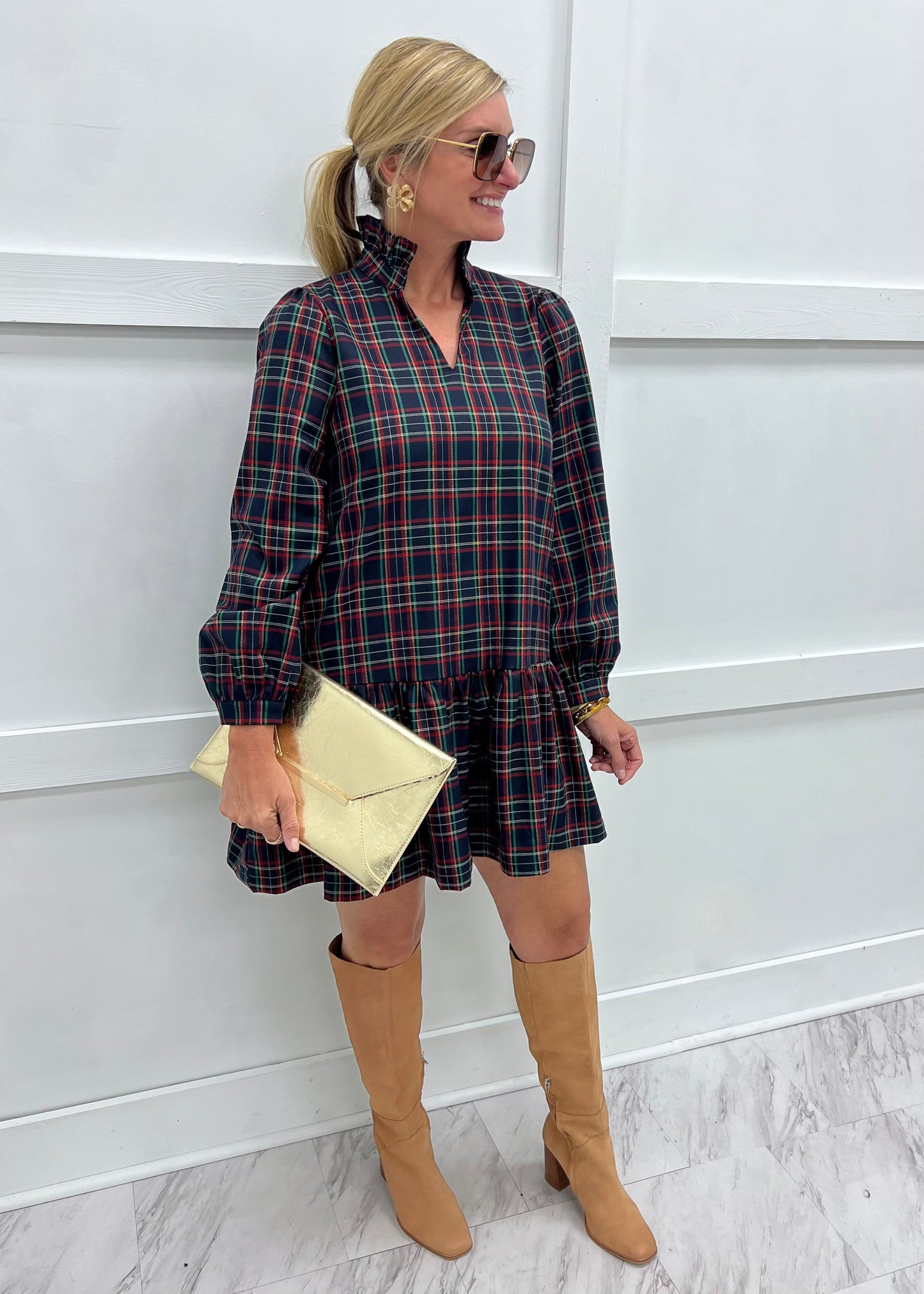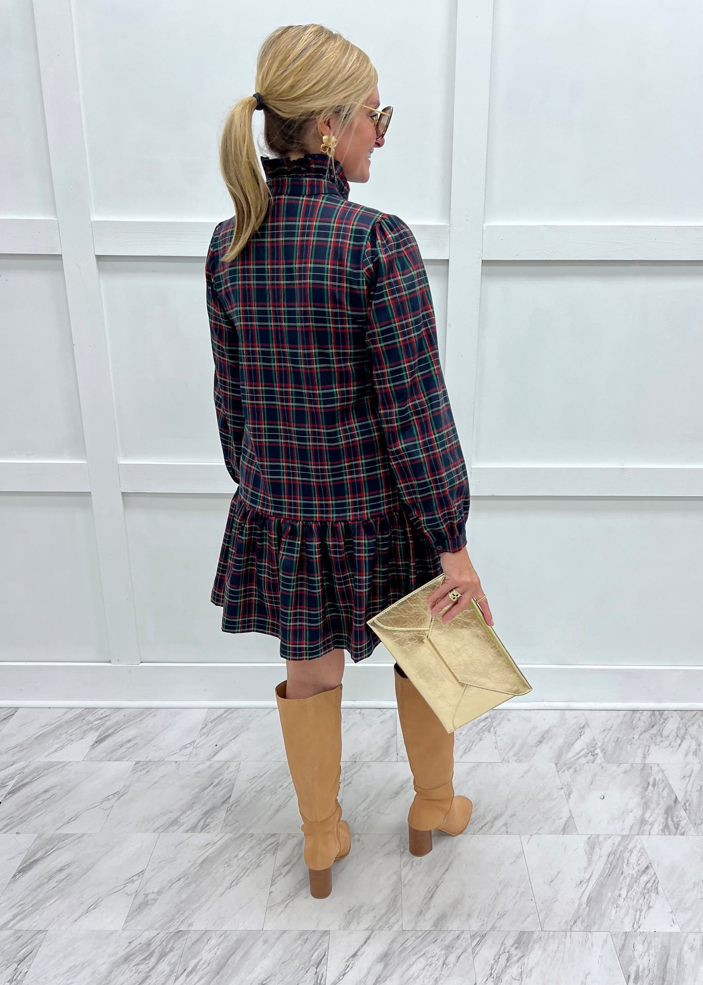 Whatever the occasion know you will look & feel your best in this amazing little dress! This style in classic navy blue plaid features a v.neckline with ruffle detailing along the collar, long sleeves that button at the wrists, side slit pockets and a straight silhouette and flounce hemline. This little dress can easily be dressed up or dressed down! Pair it with heels and a clutch for a festive party or throw it on with boots and cute earrings... you will be wearing this one all of the time! Model is 5'8" and wearing a size small.