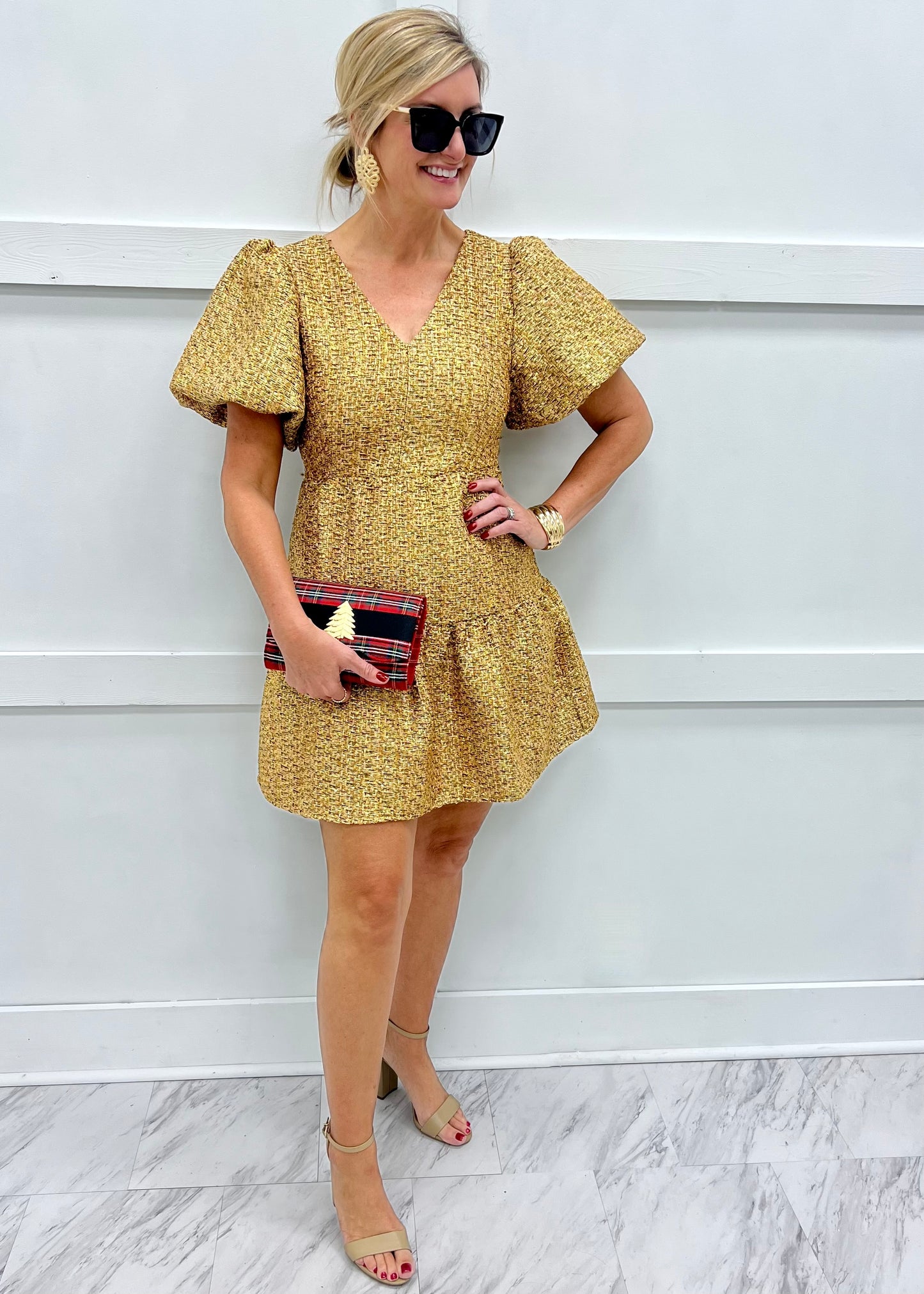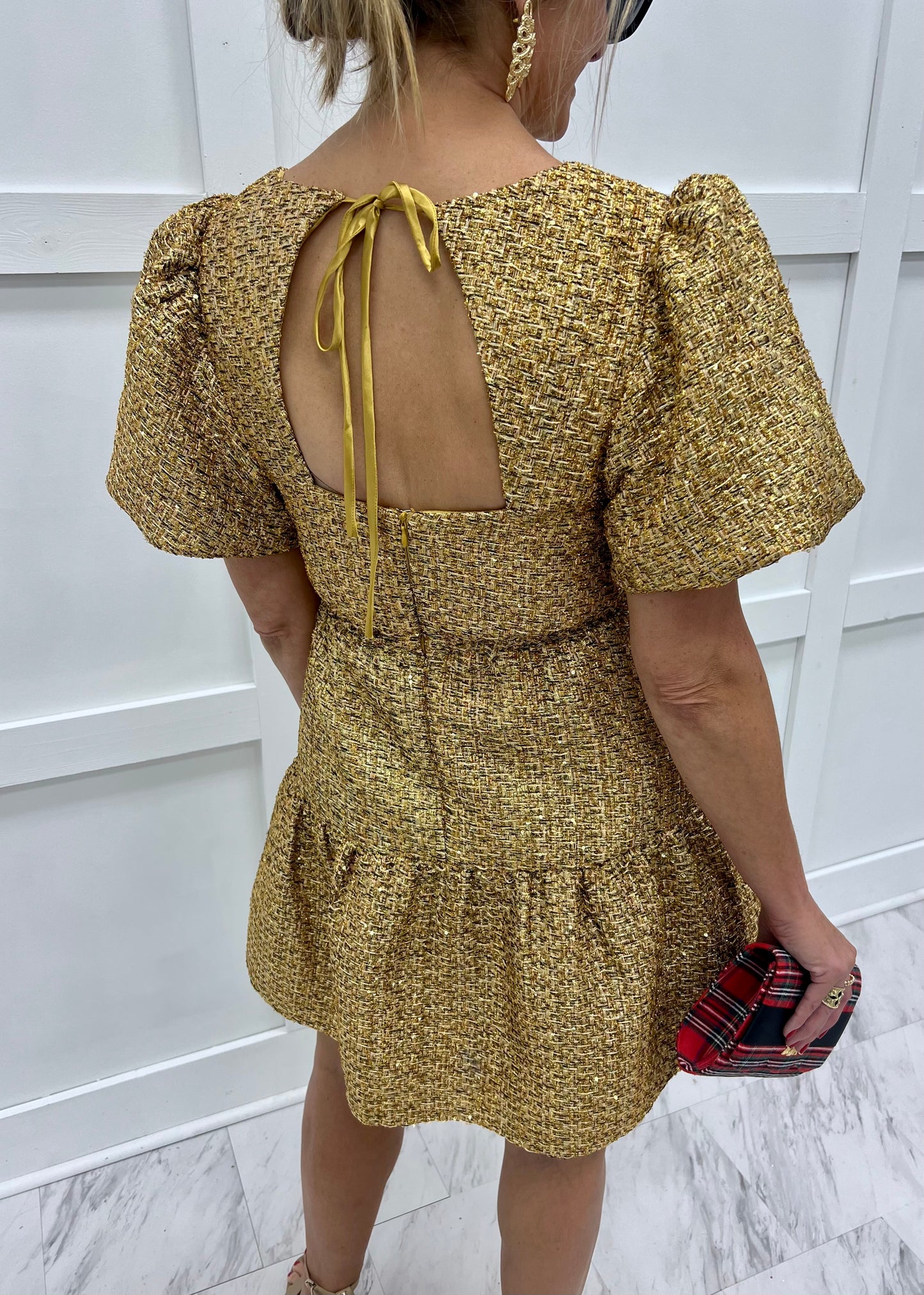 Shine, sparkle & dazzle as you turn all of the heads in this stunning little dress! Gold tweed fabric with tiny sequins that add a slight shimmer to it, shapes this dress featuring a v.neckline, short puff sleeves, a fitted waistline and flattering silhouette. The back has a center zipper and hook & eye closure and a larger keyhole with self tie gold satin fabric. This style is fully lined. Just add heels and statement earrings for the perfect party look! Model is 5'8'' and wearing a size Medium.